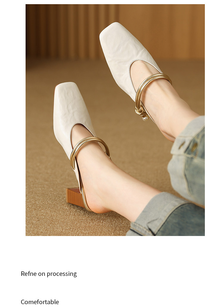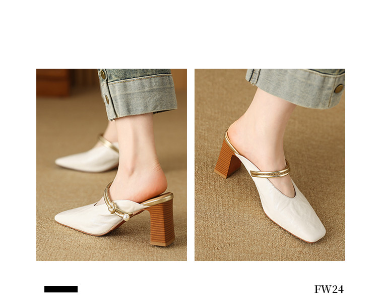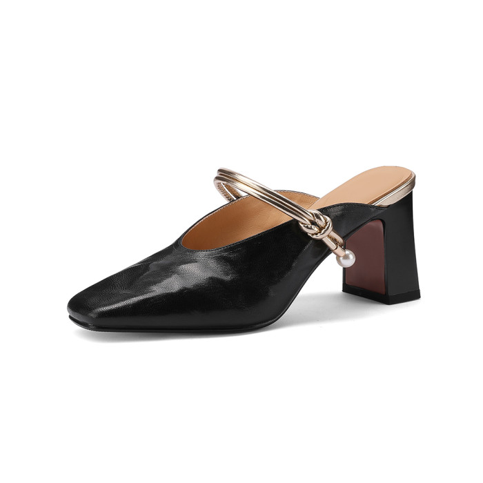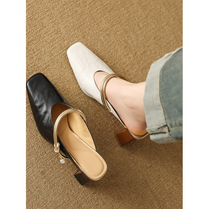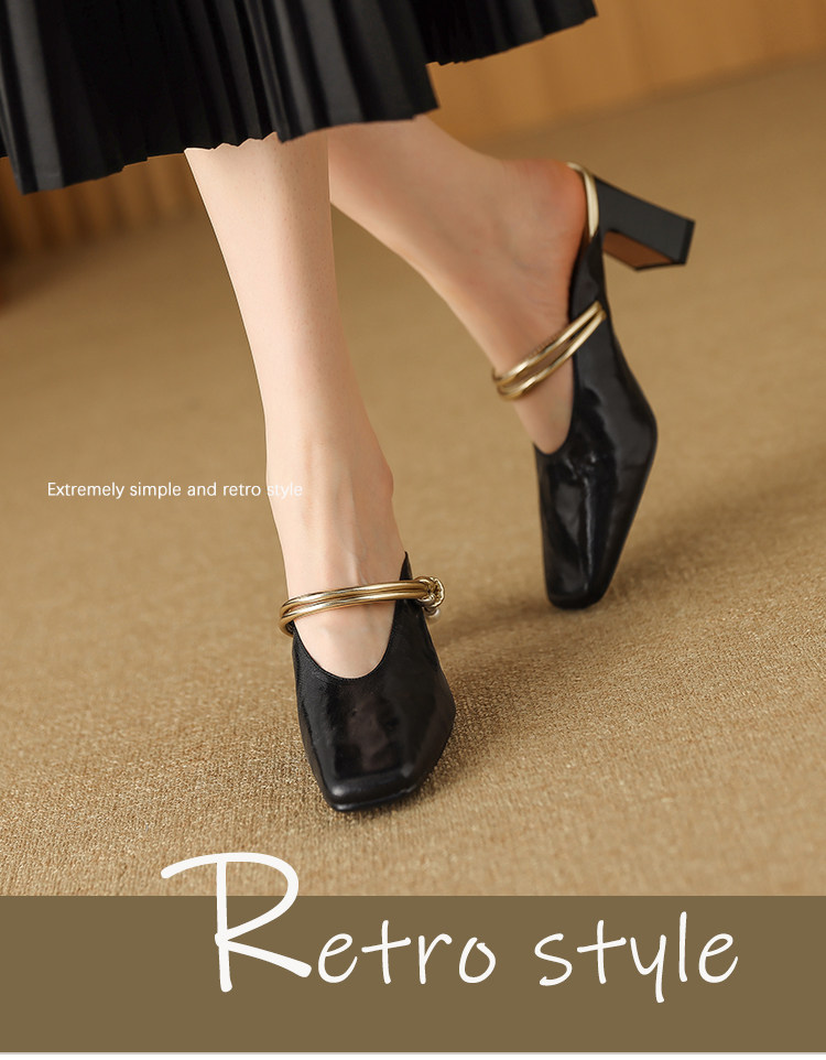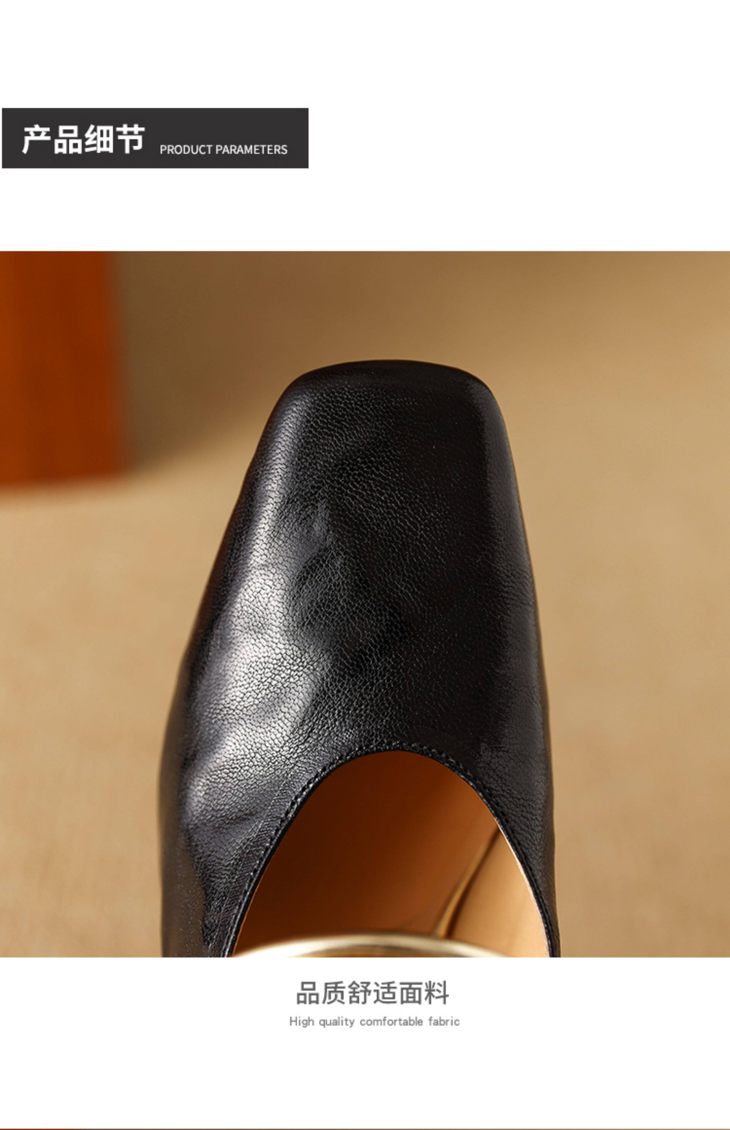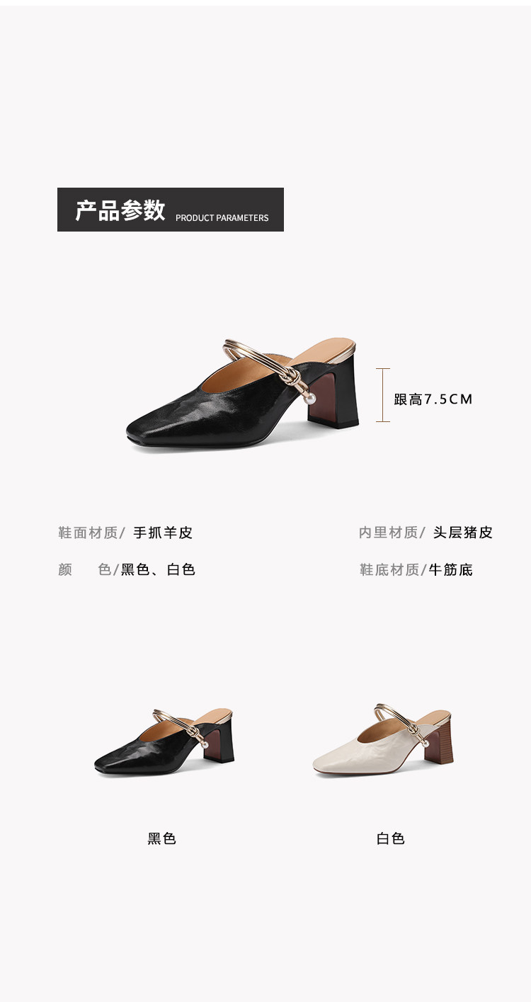 7cm羊皮高跟包頭半拖鞋女夏外穿穆勒時尚復古方頭粗跟瑪麗珍涼拖