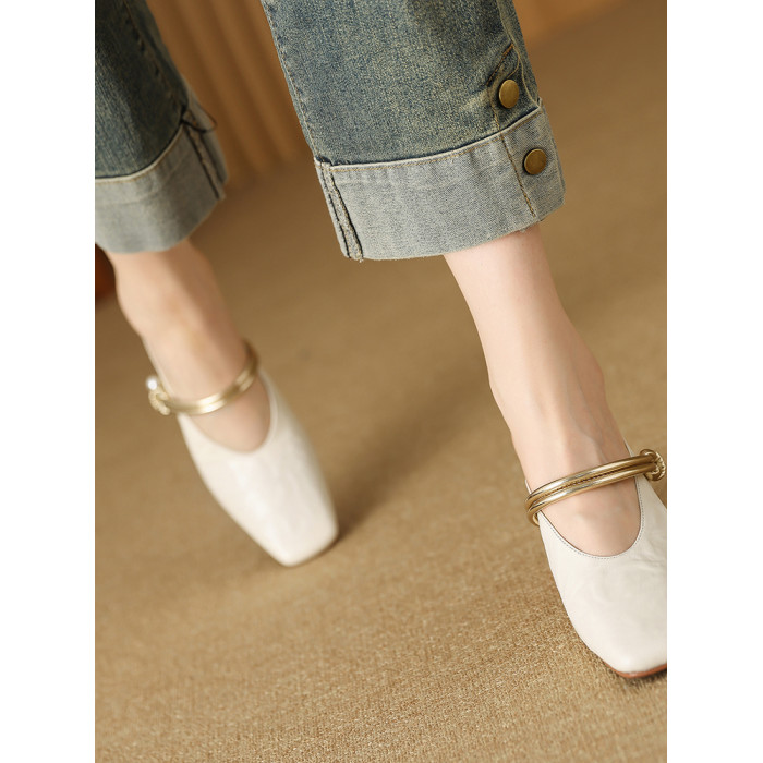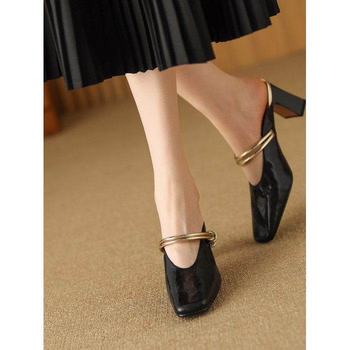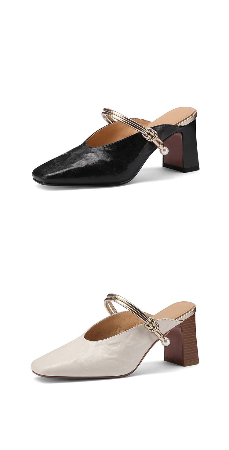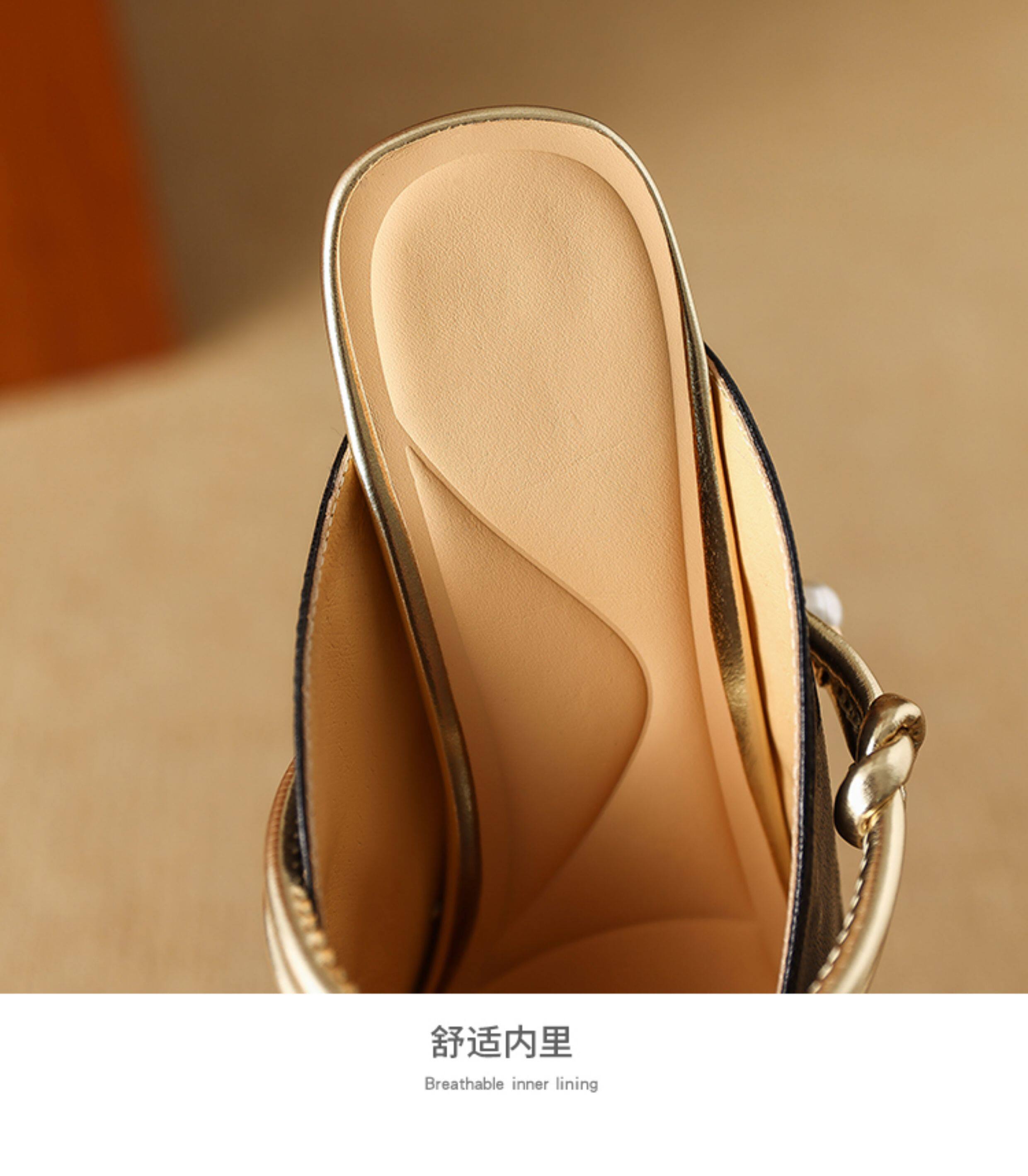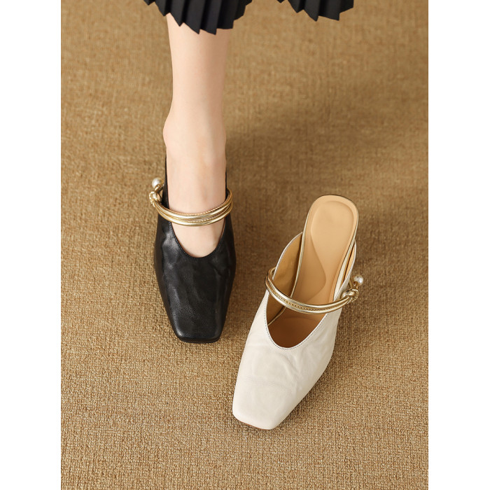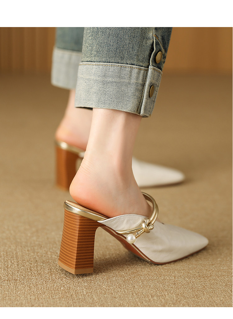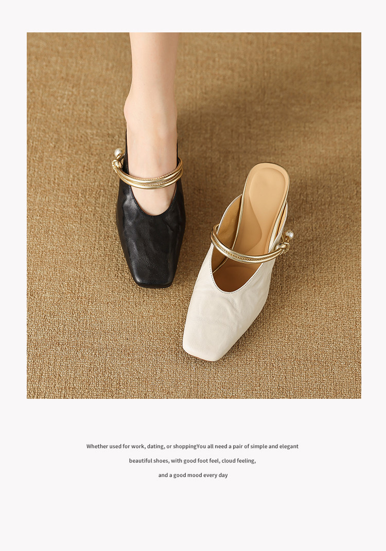 7cm羊皮高跟包頭半拖鞋女夏外穿穆勒時尚復古方頭粗跟瑪麗珍涼拖