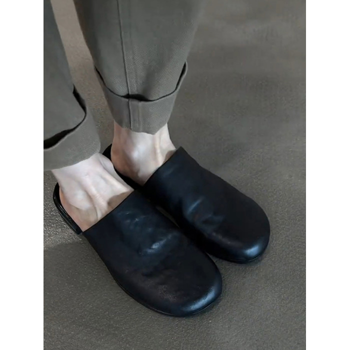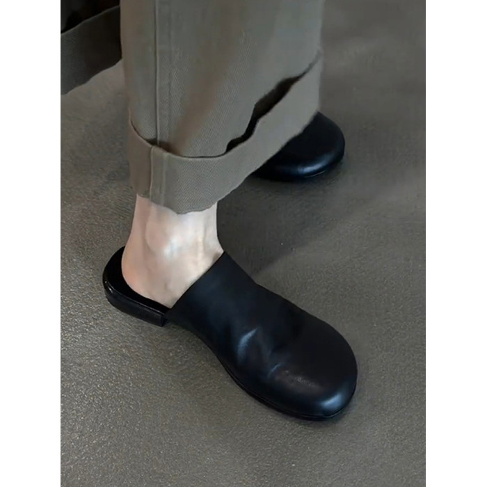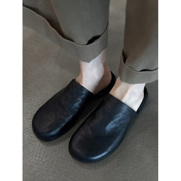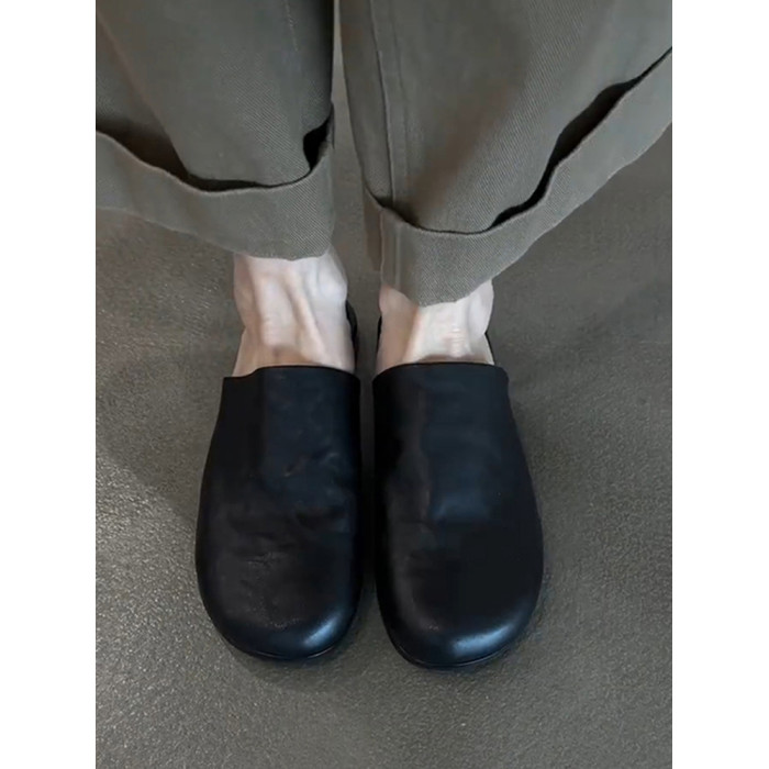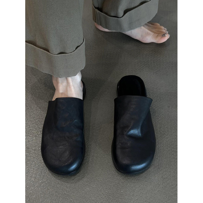 羊皮版~真皮簡約平底一腳蹬外穿包頭半拖鞋女百搭黑色穆勒鞋涼拖