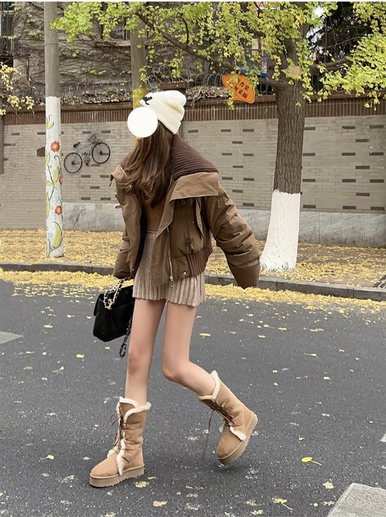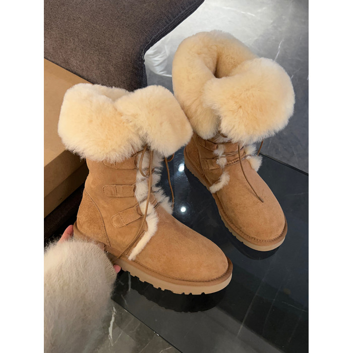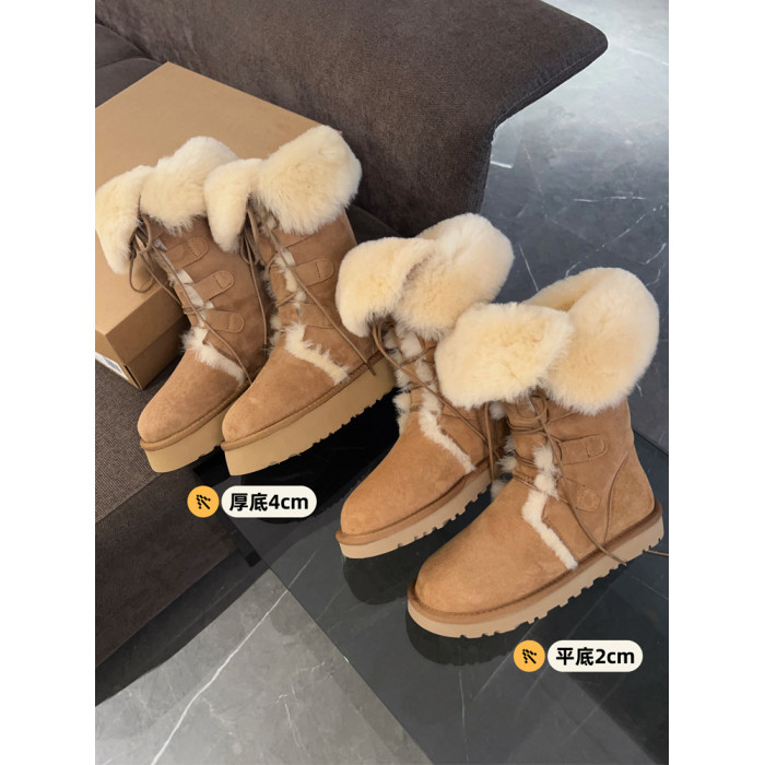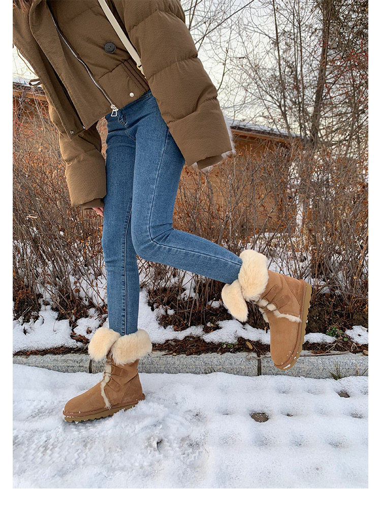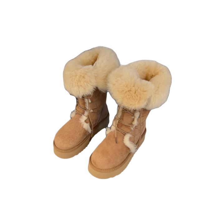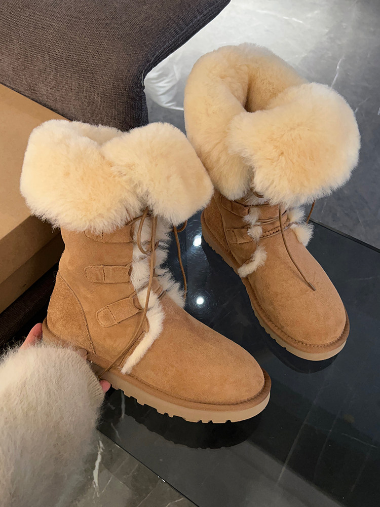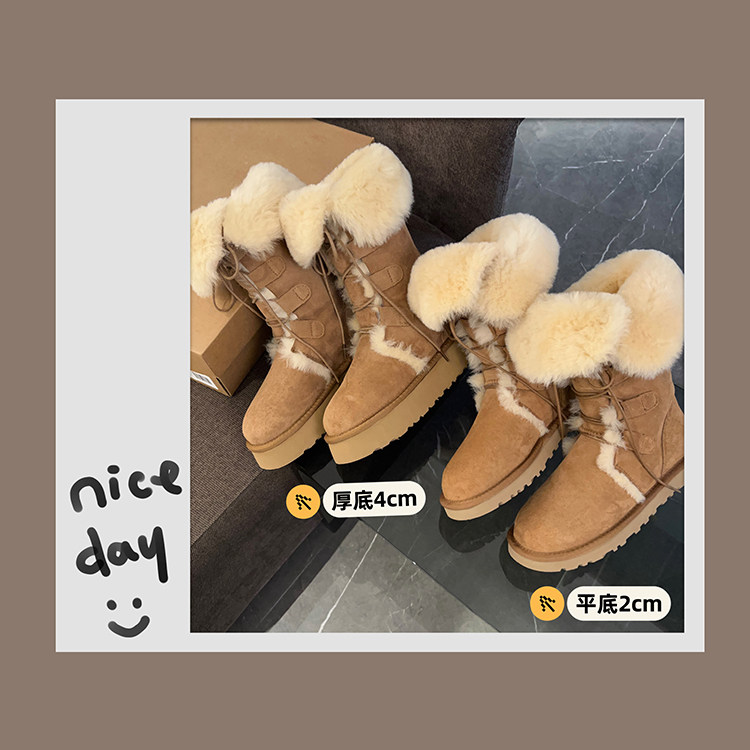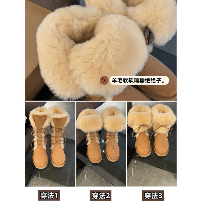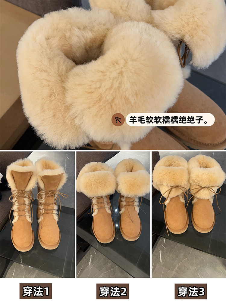 羊皮毛一體繙毛皮系帶雪地靴女冬季保暖毛絨中筒靴舒適防滑棉靴