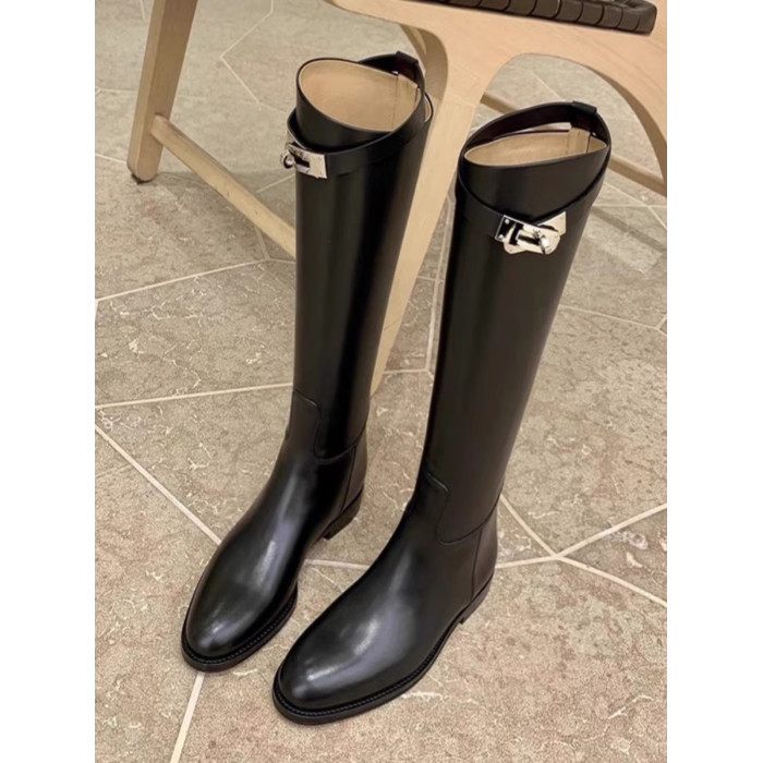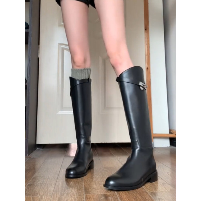 羊皮版~真皮長筒靴斜口鎖釦帶粗跟高筒騎士靴女英倫秋冬加絨長靴