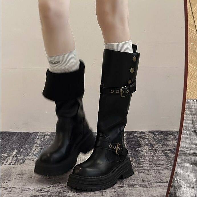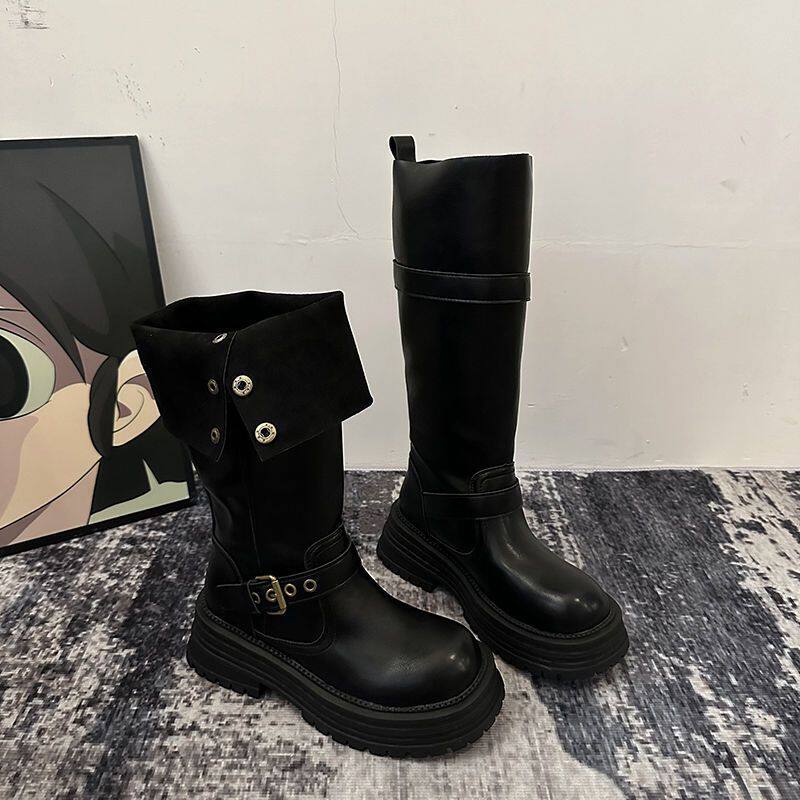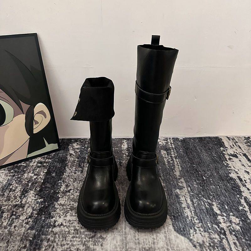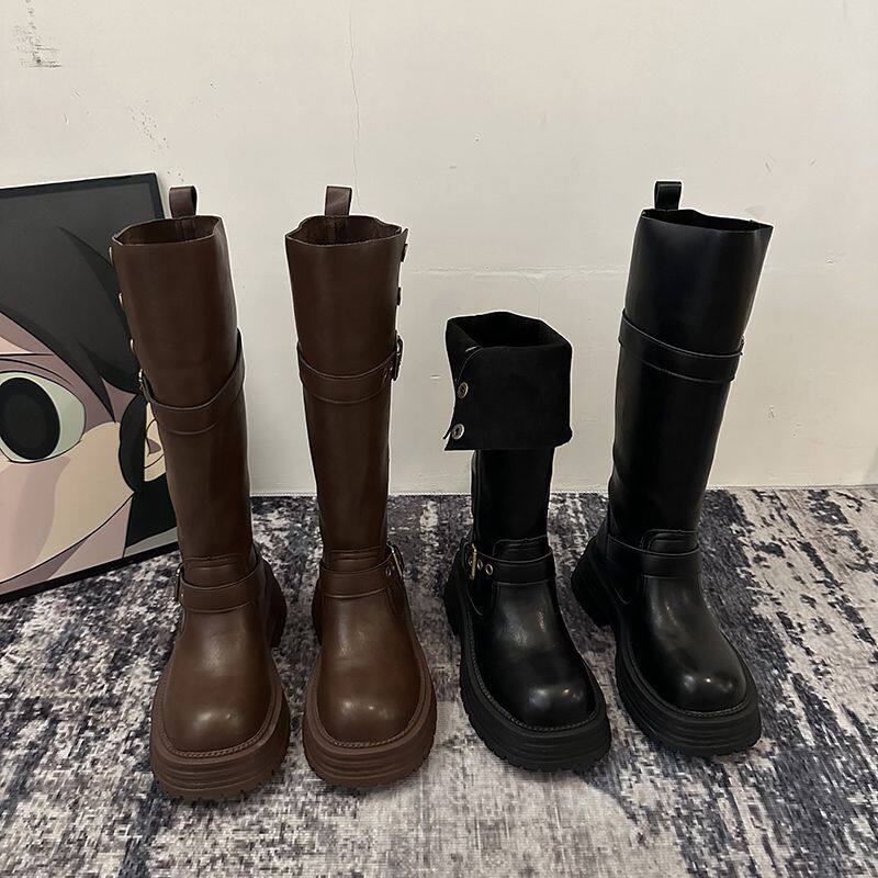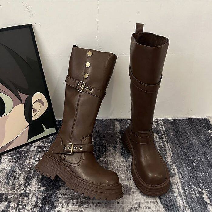 假不賈長筒靴女2025新款夏季棕色高筒靴子美拉德騎士靴厚底馬丁靴