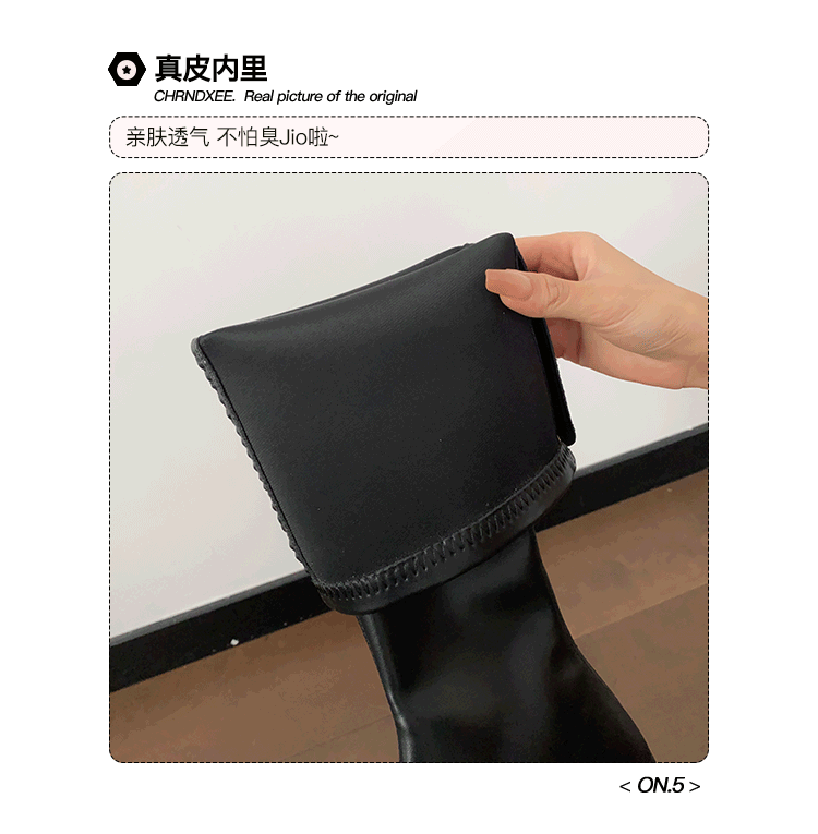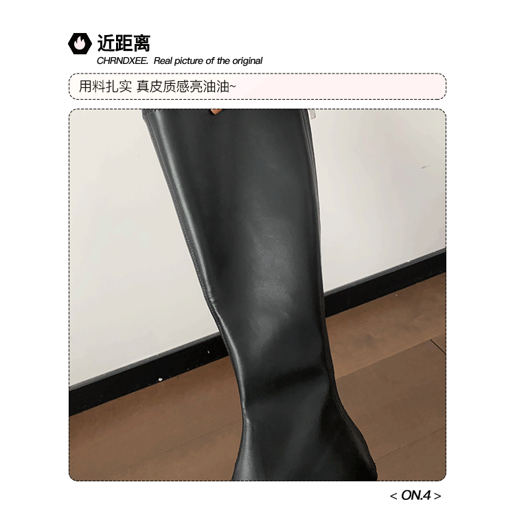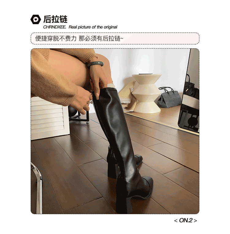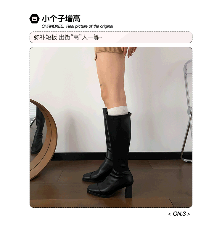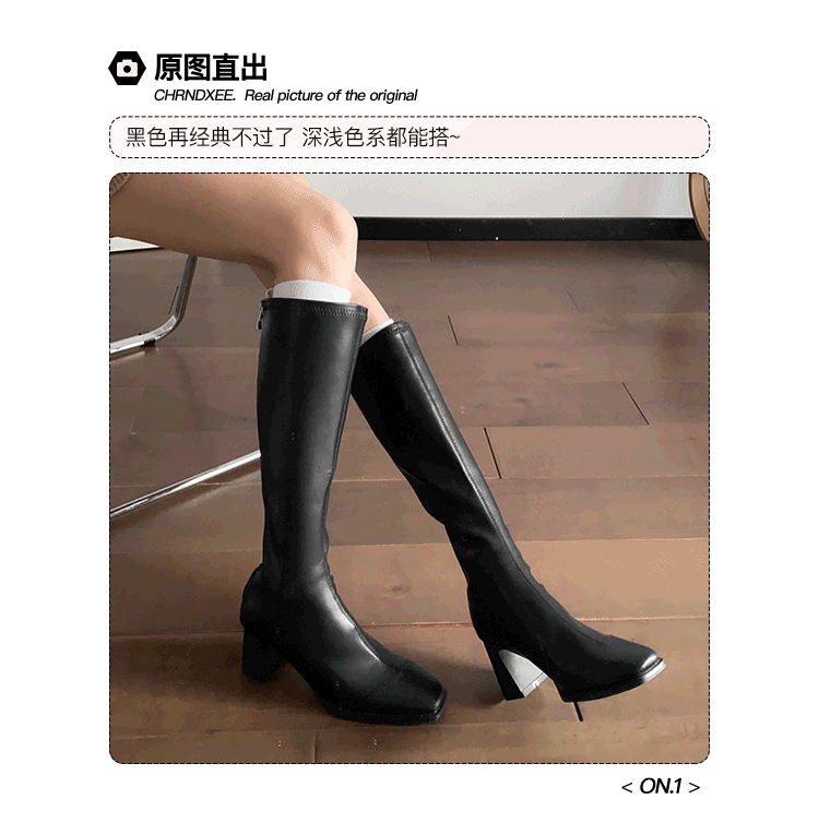 牛皮版~英倫方頭粗跟長筒彈力瘦瘦靴女後拉鍊高跟長靴高筒騎士靴