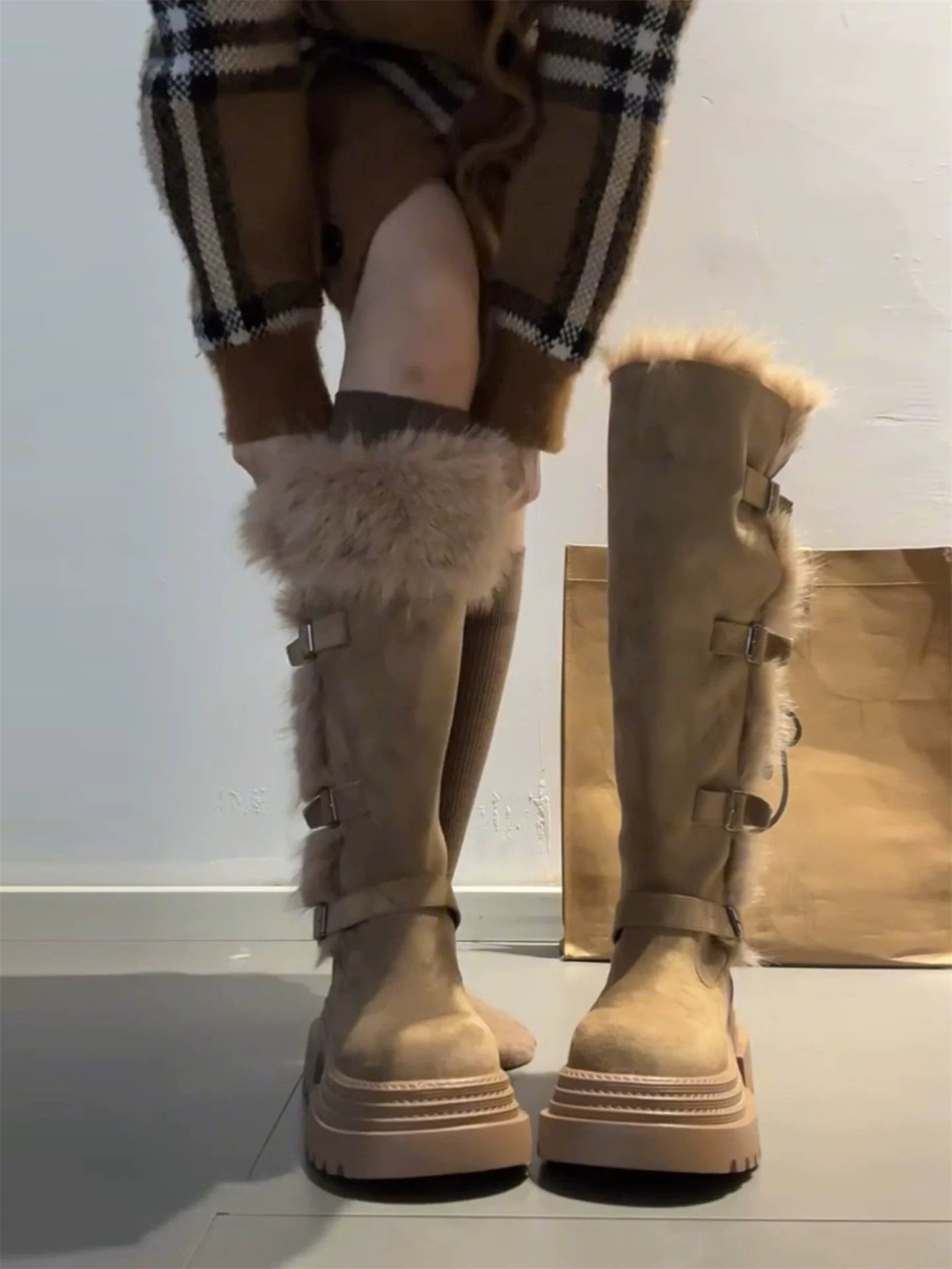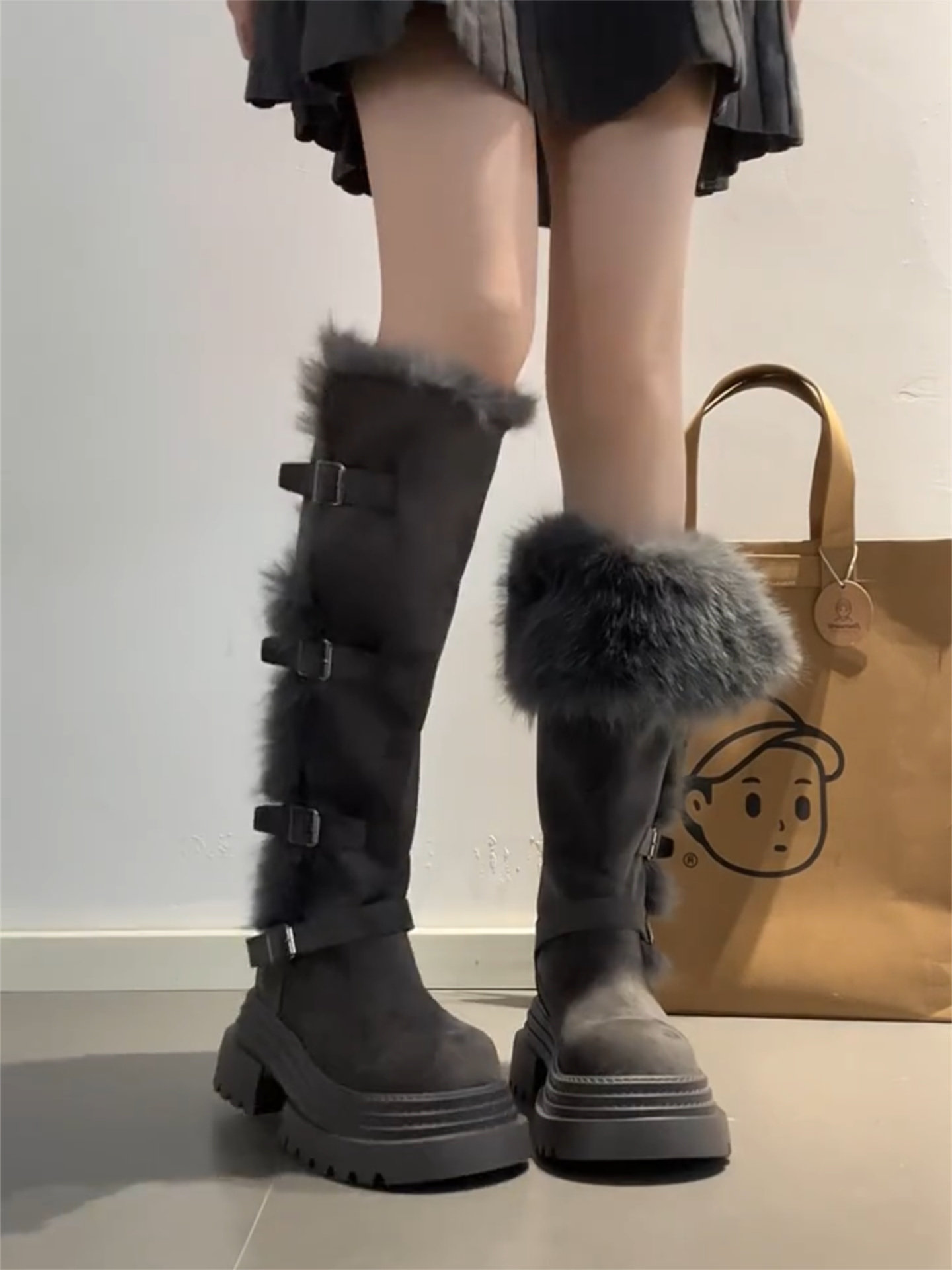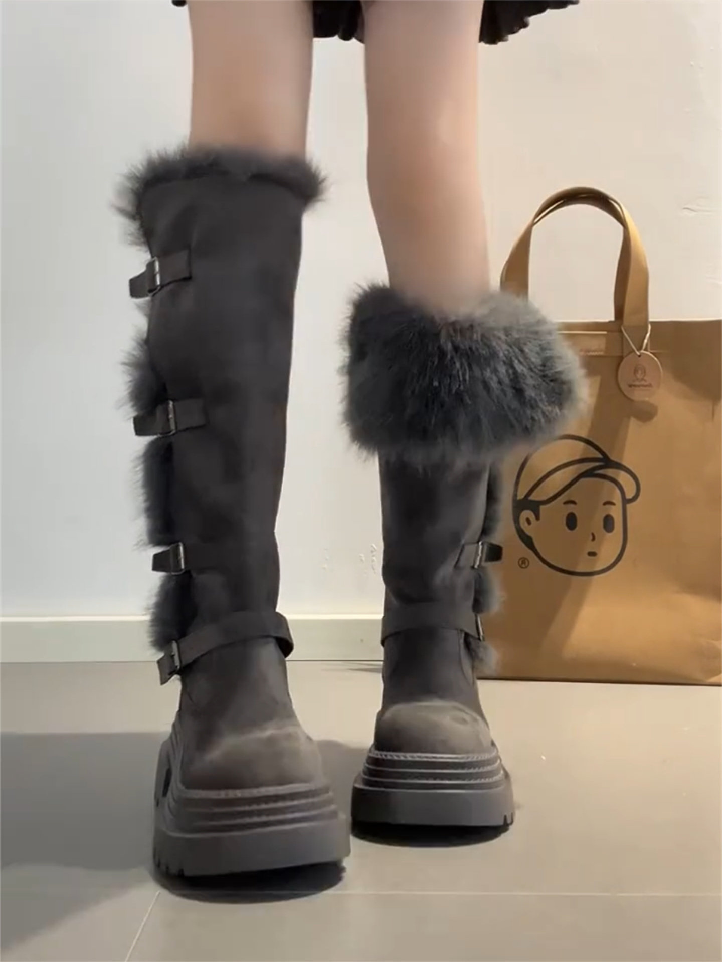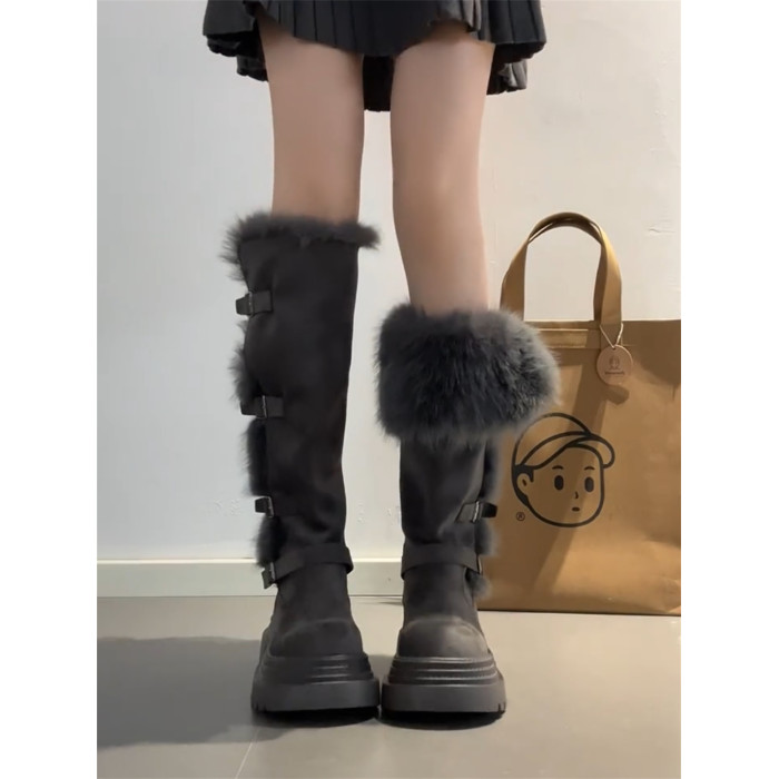 桃小姐巨好看厚底灰色長筒靴女2025新款冬季加絨毛毛雪地靴騎士靴