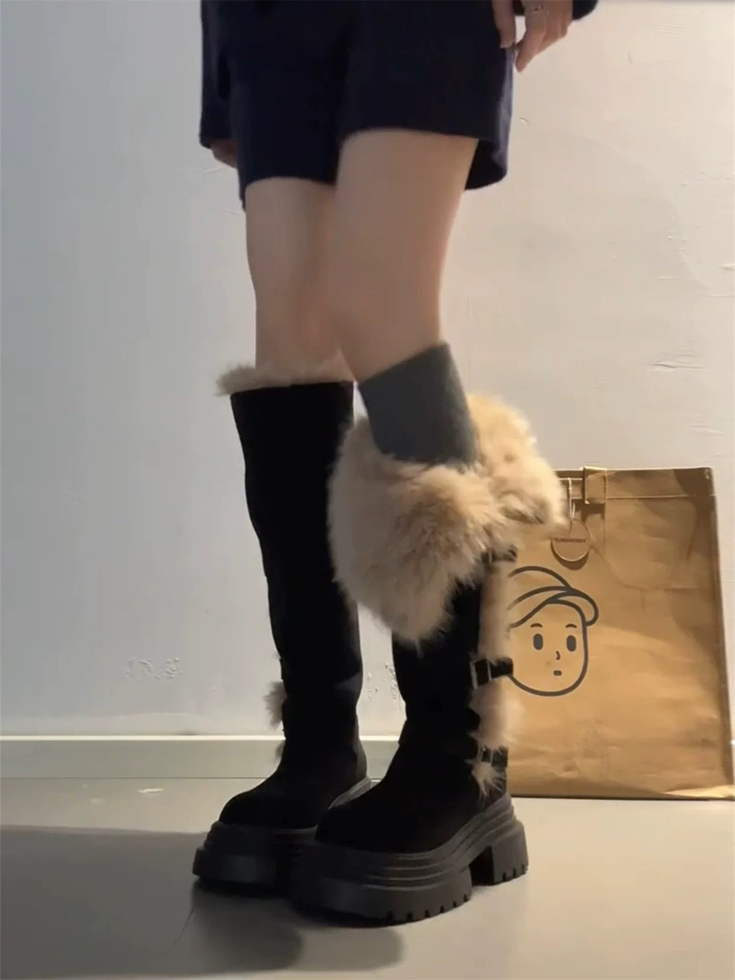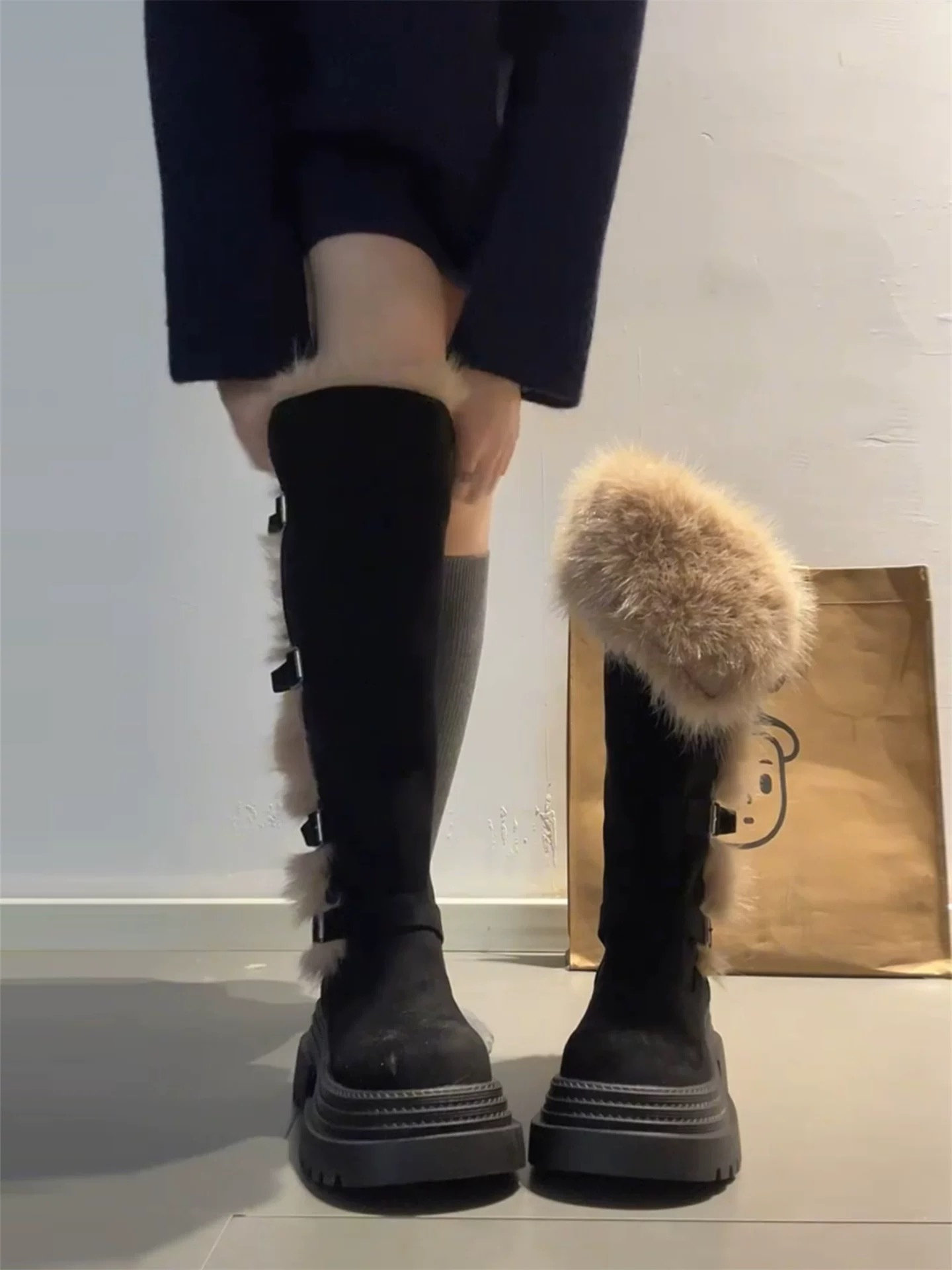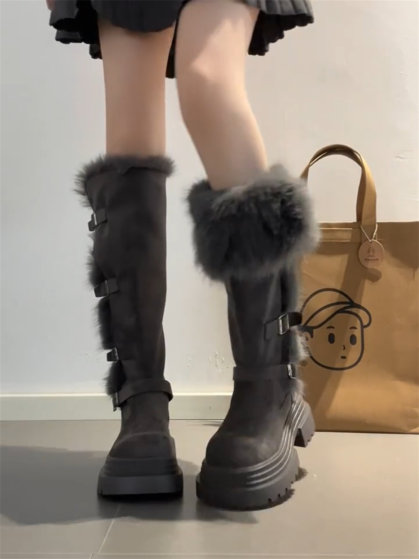 桃小姐巨好看厚底灰色長筒靴女2025新款冬季加絨毛毛雪地靴騎士靴