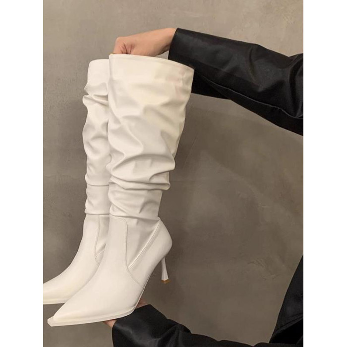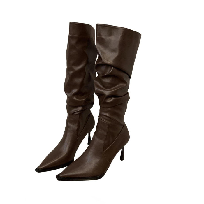 軟皮高跟鞋秋冬女細跟堆堆靴子2025新款小腿顯瘦尖頭長筒靴女