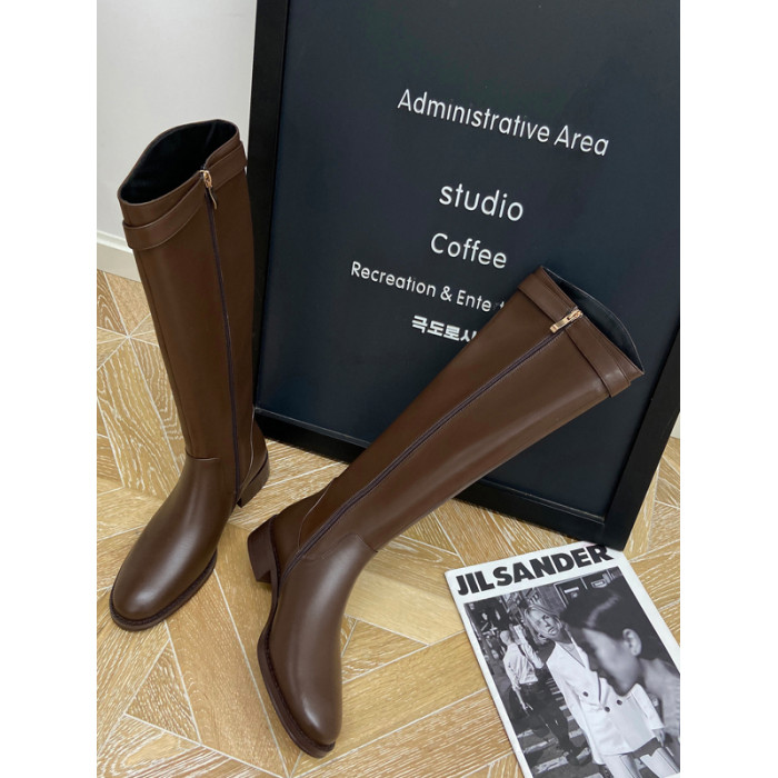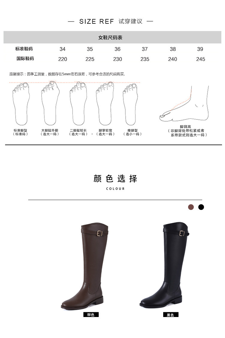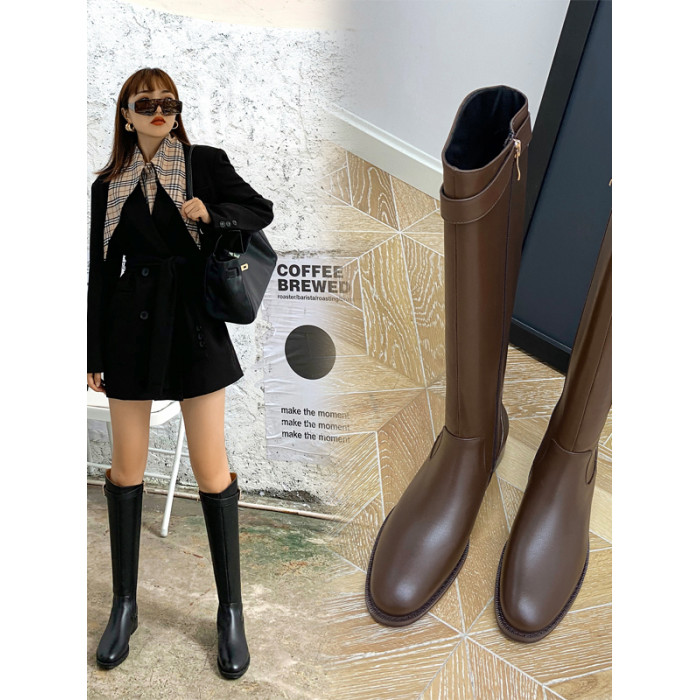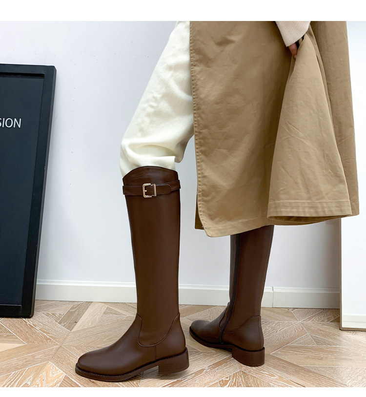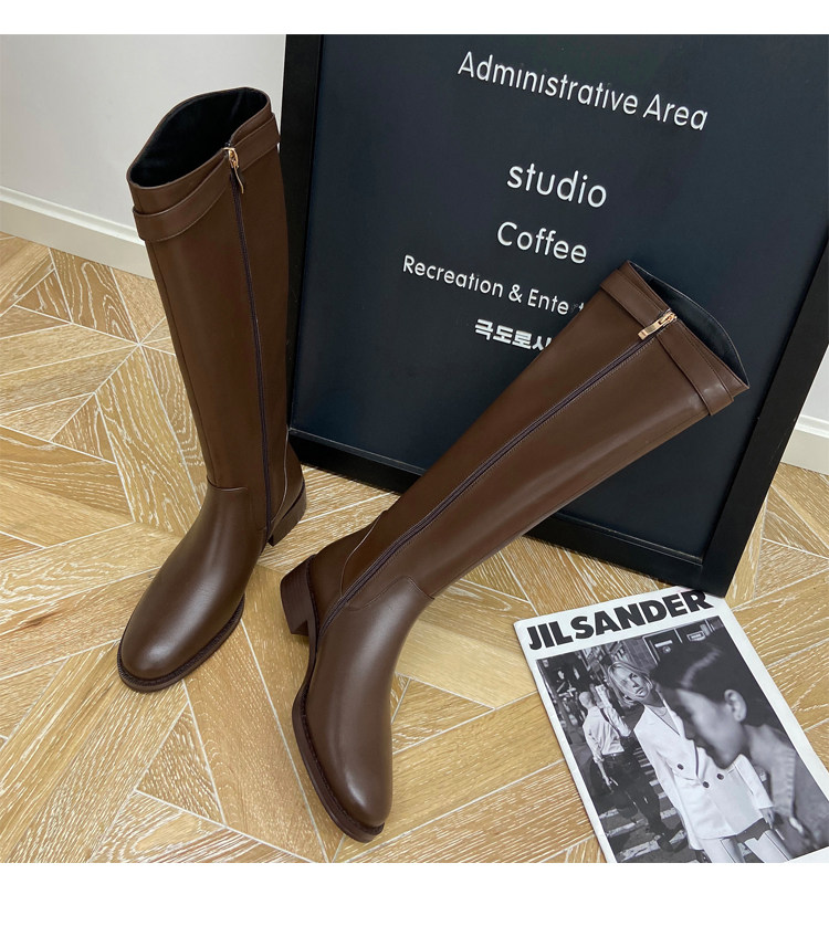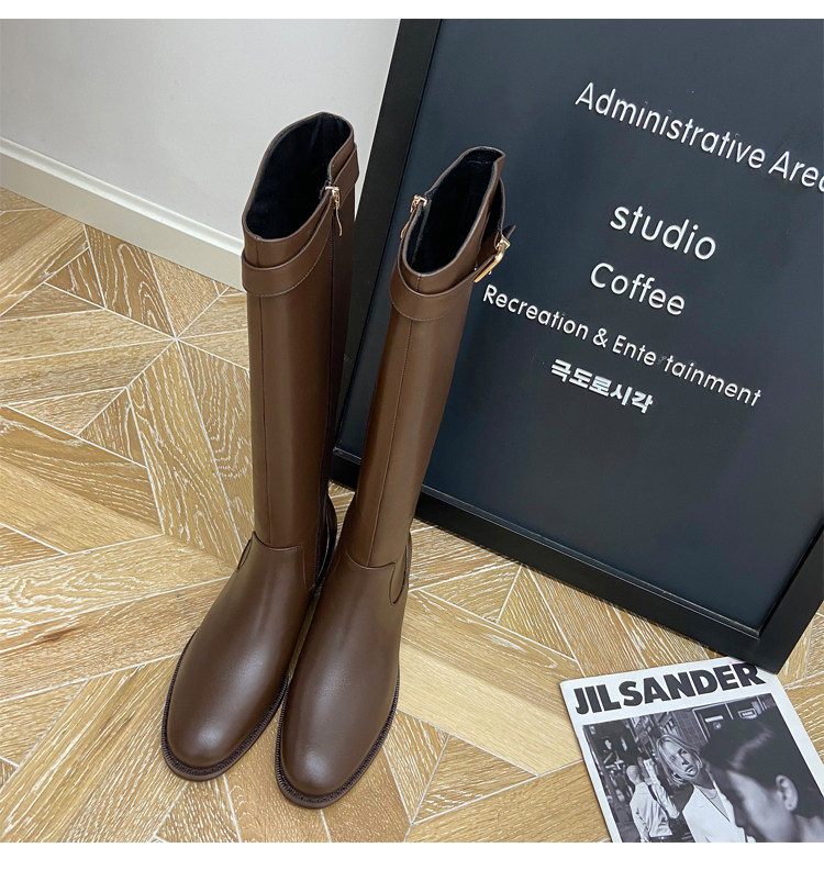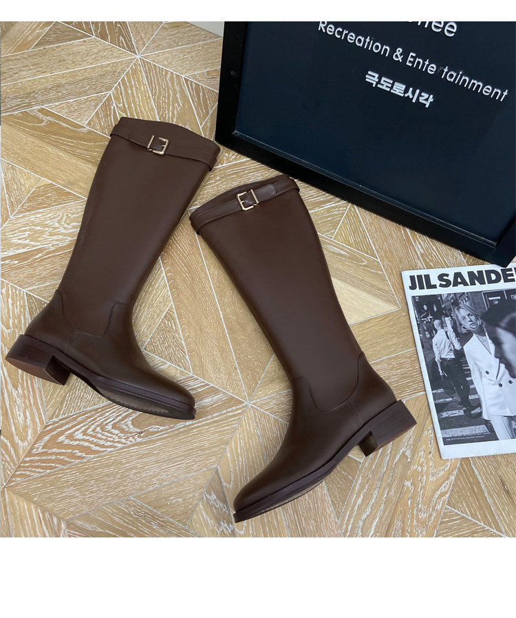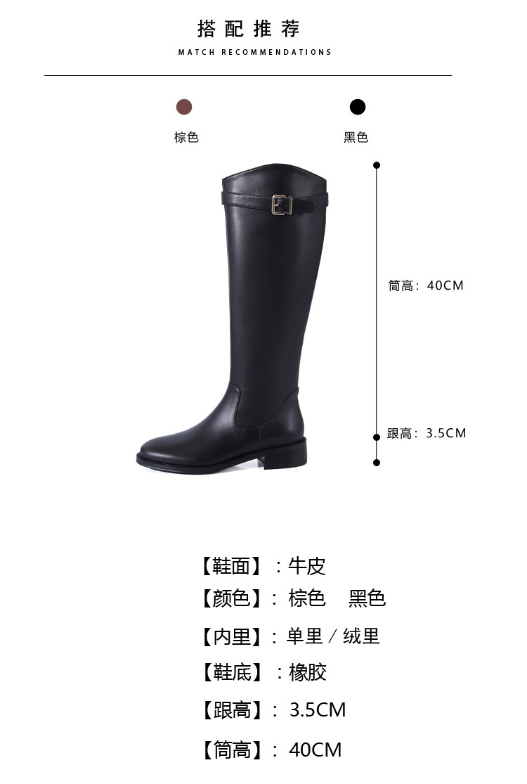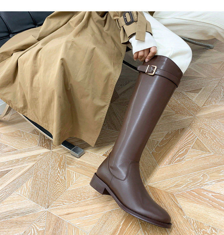 棕色平底騎士靴女2025秋冬新款韓版小個子低跟高筒靴顯瘦真皮長靴