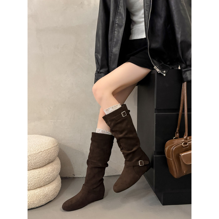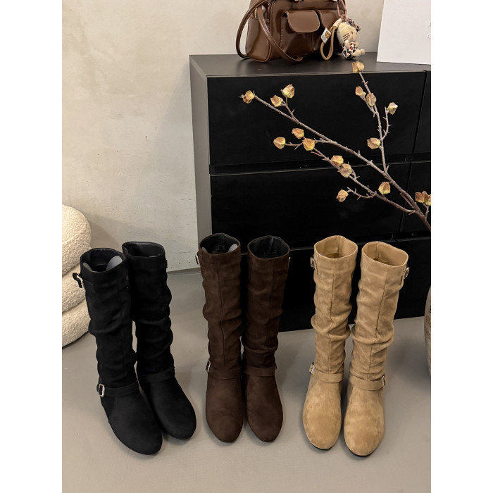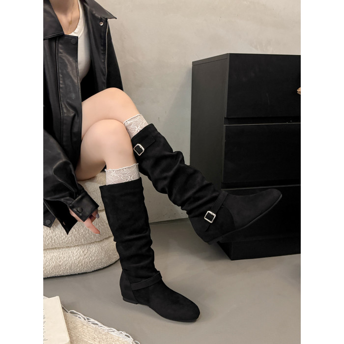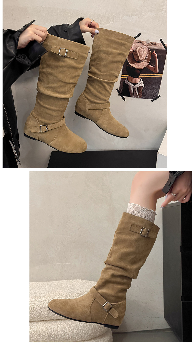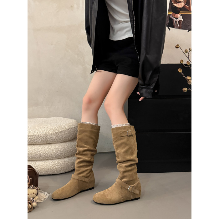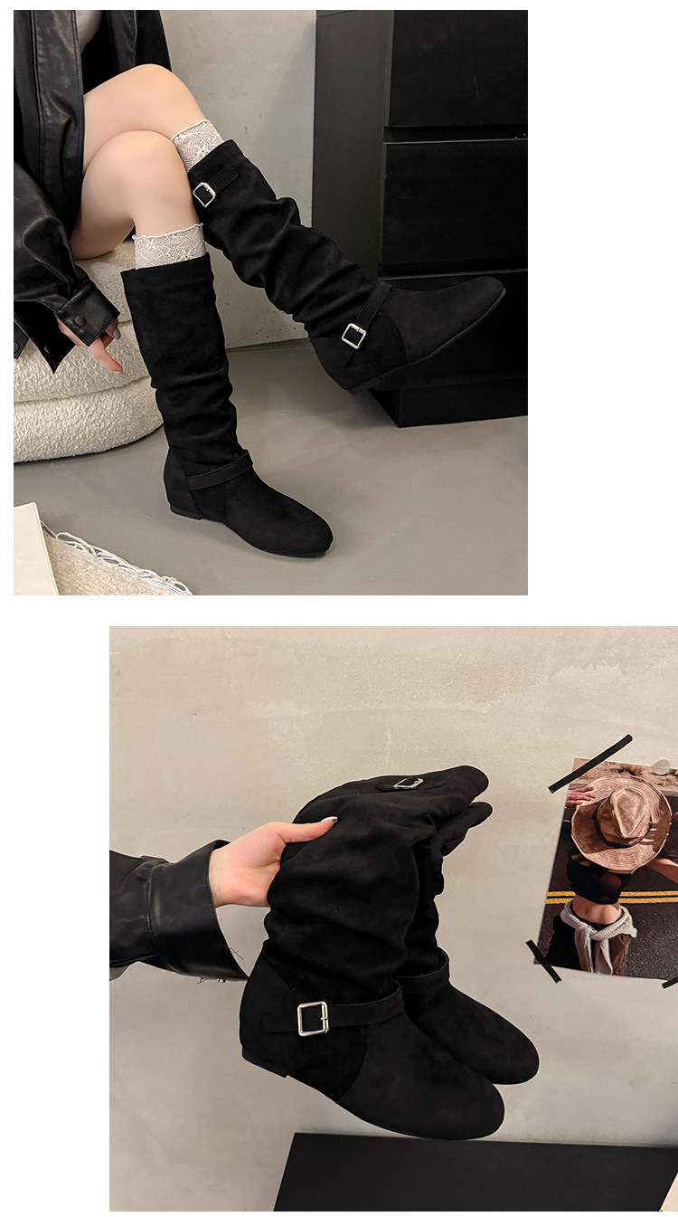 復古堆堆長筒靴女秋冬新款平底不過膝高筒騎士靴內增高西部牛仔靴