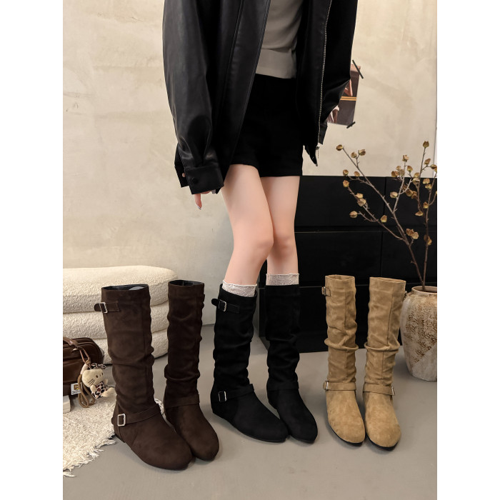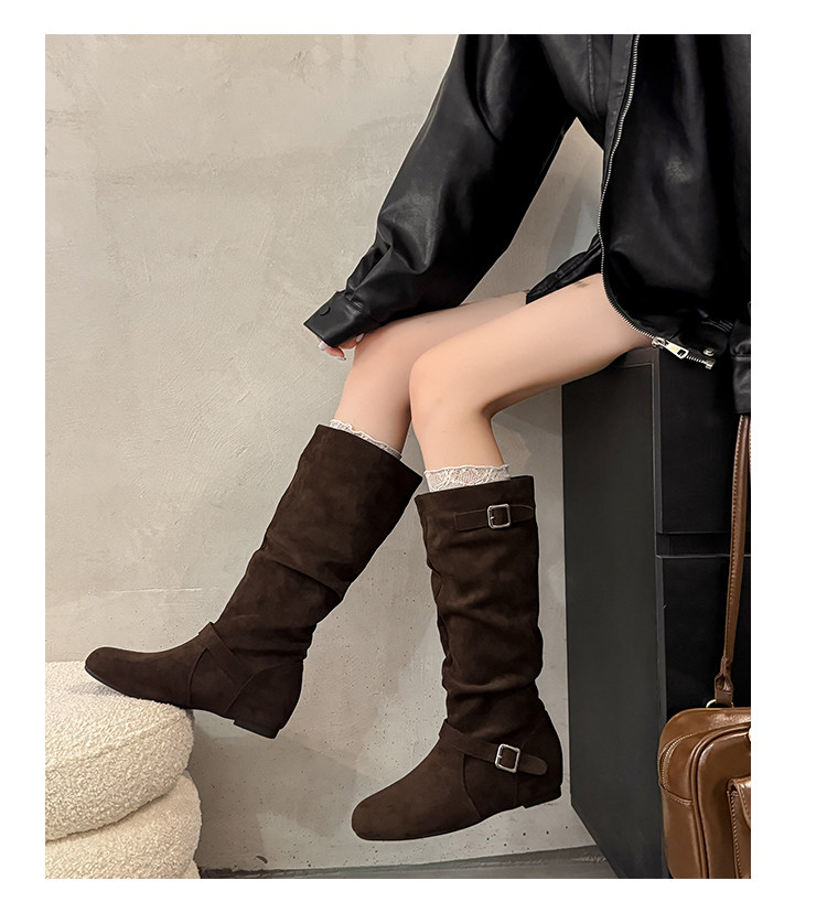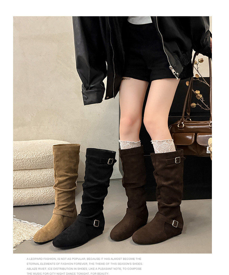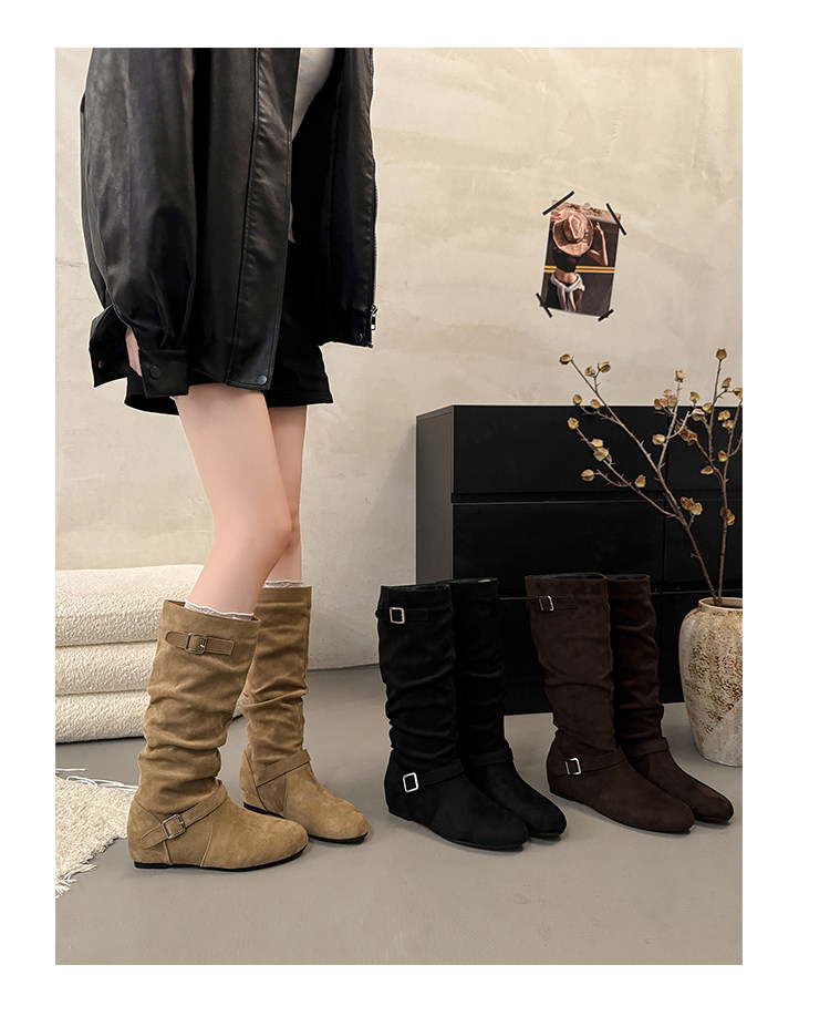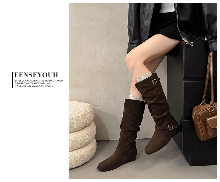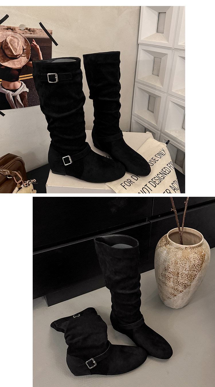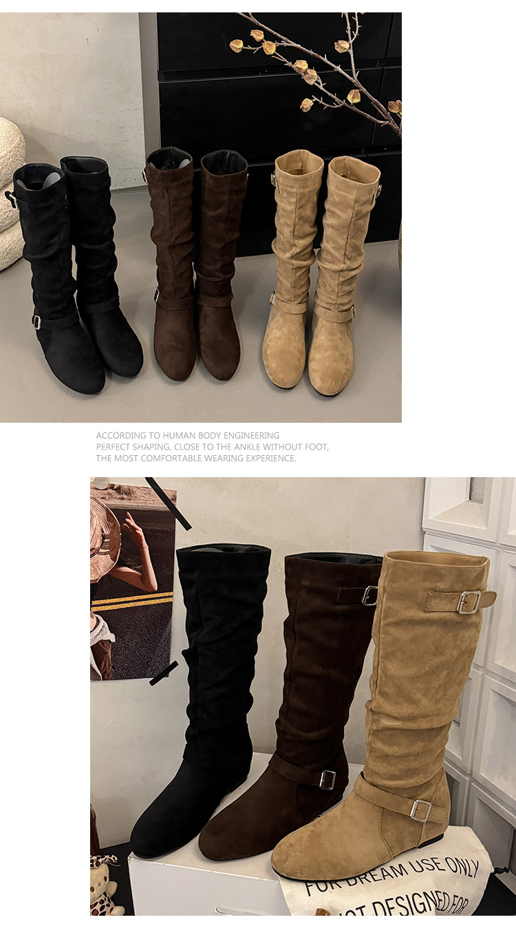 復古堆堆長筒靴女秋冬新款平底不過膝高筒騎士靴內增高西部牛仔靴