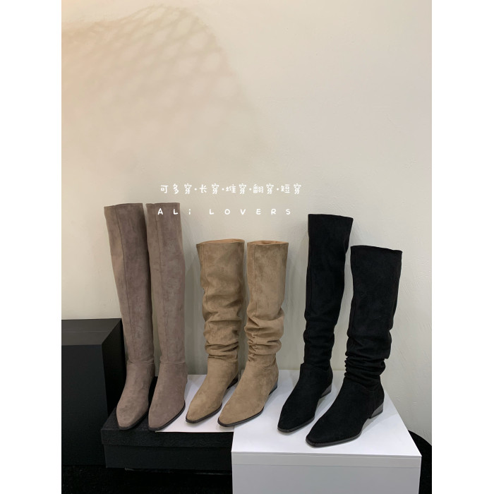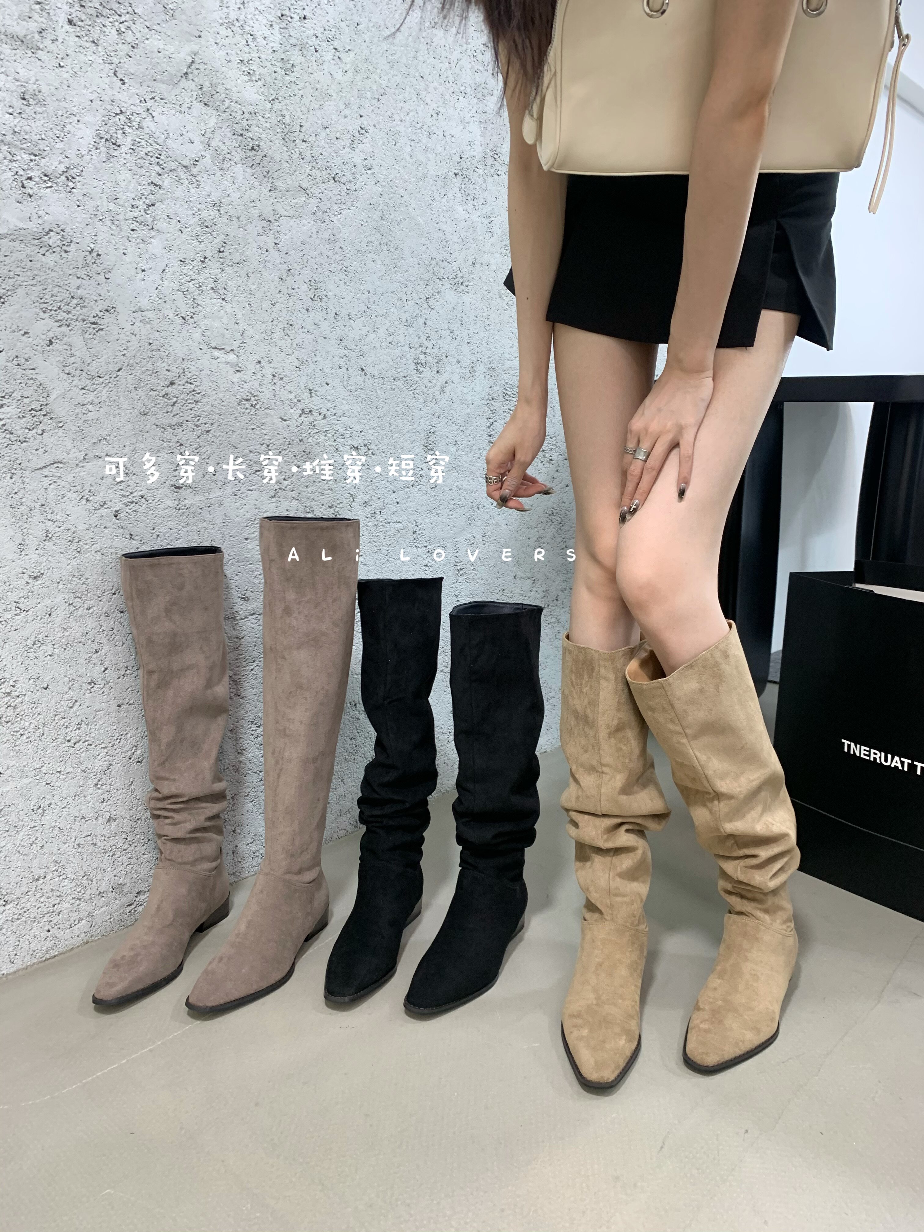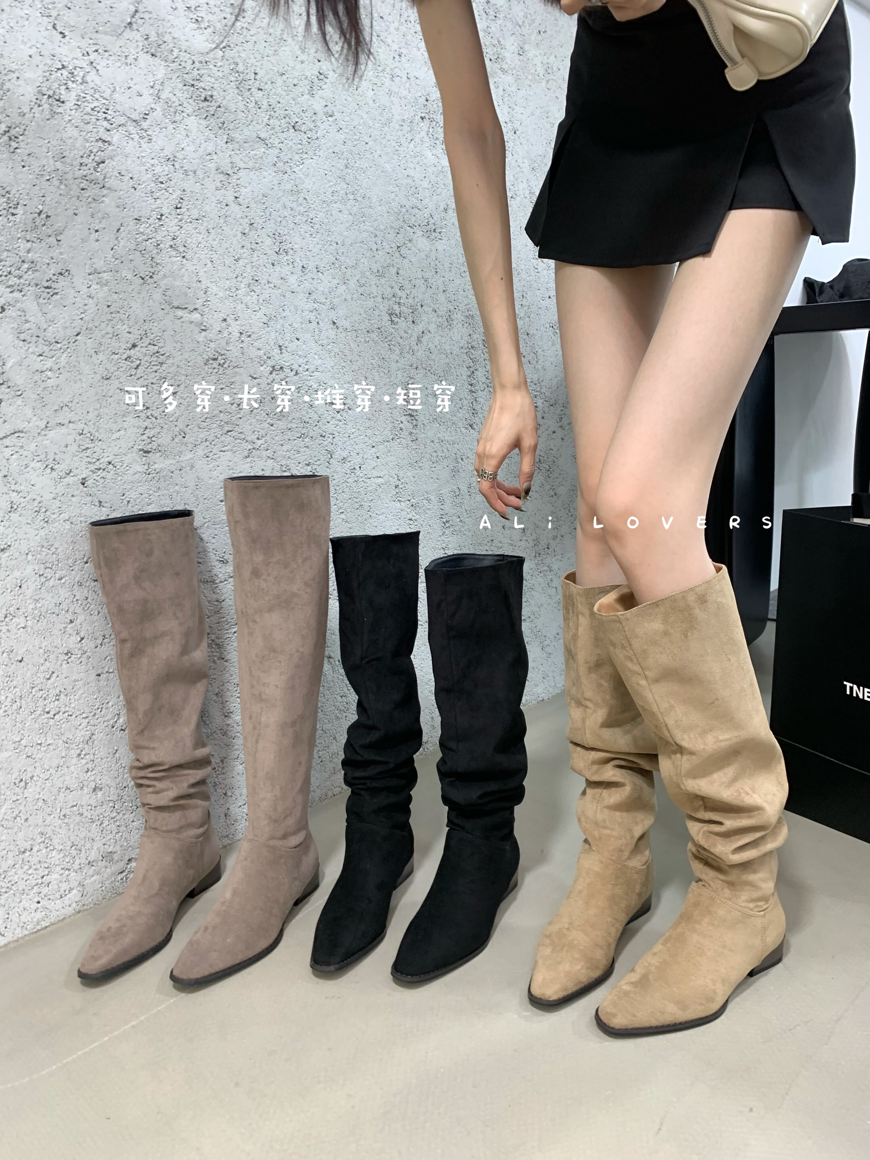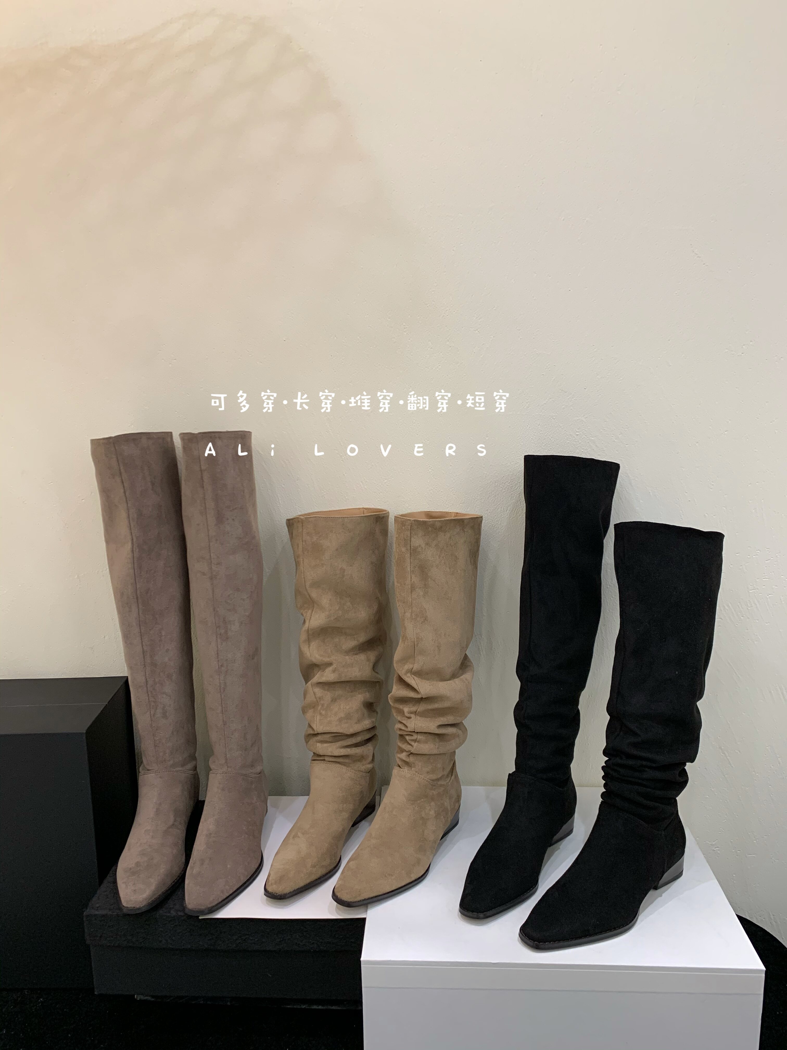 FQ3 實拍Alilover新款高筒靴女不過膝長靴絨面粗跟中跟騎士靴女靴