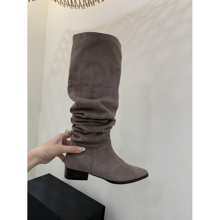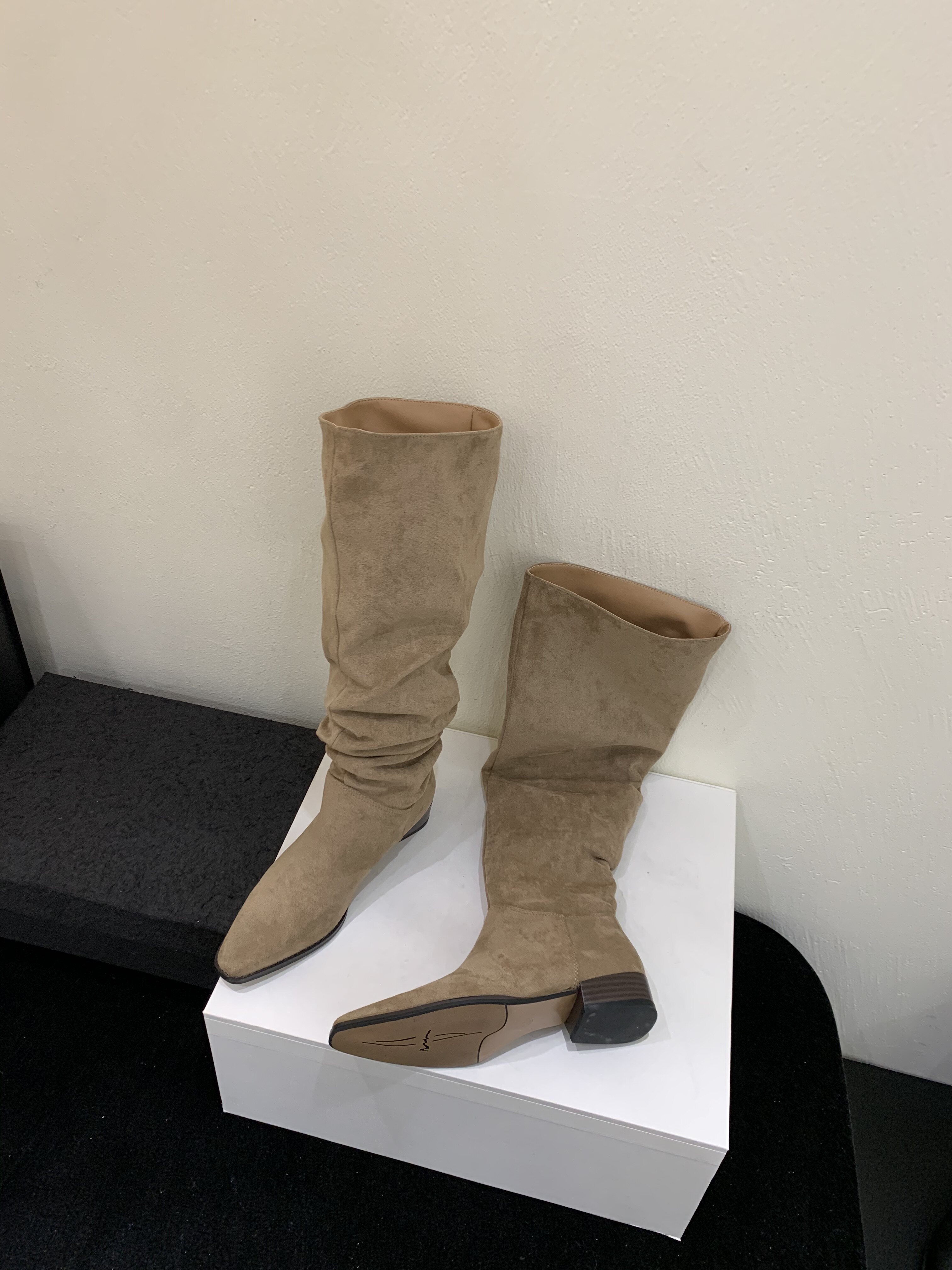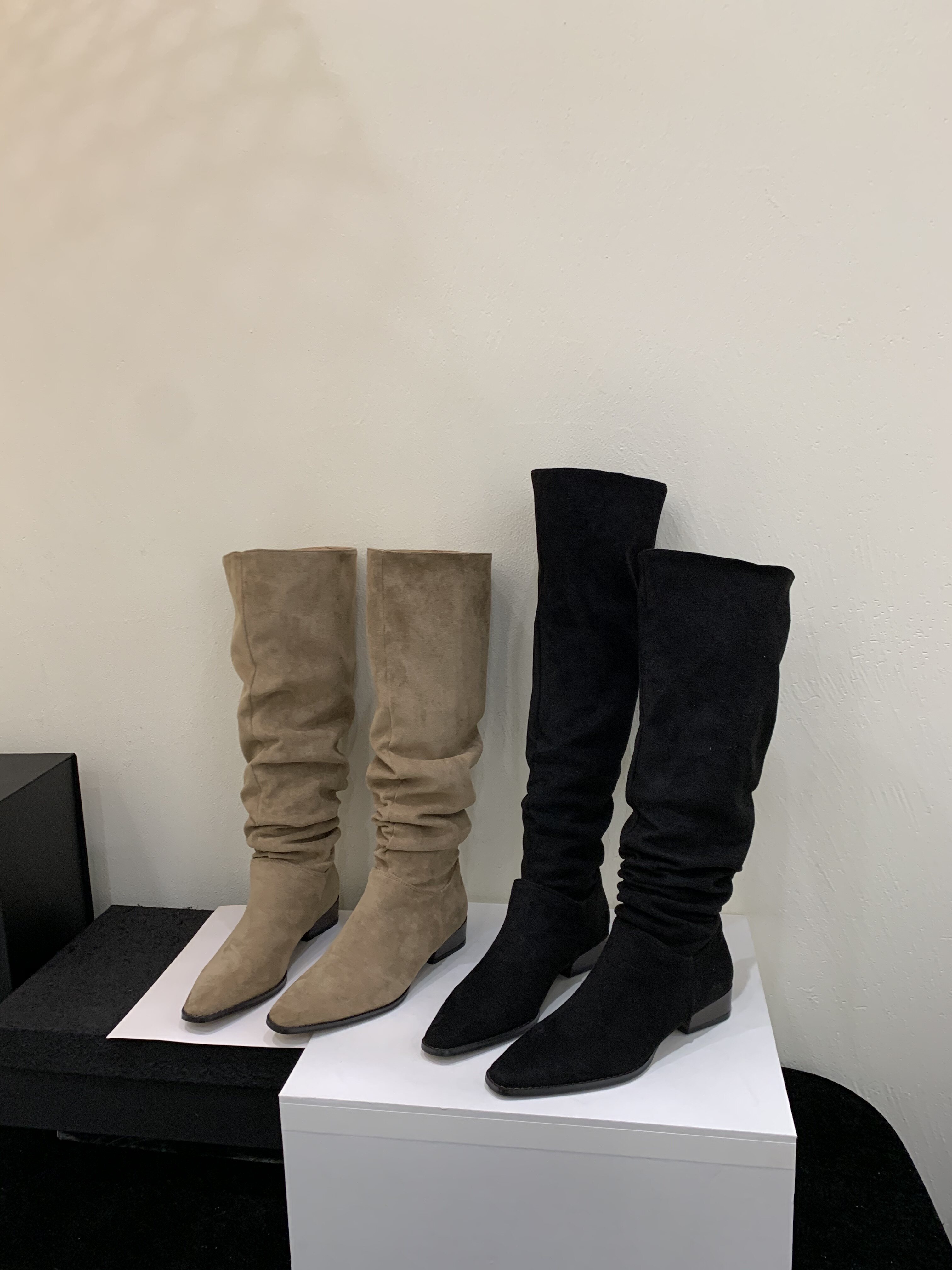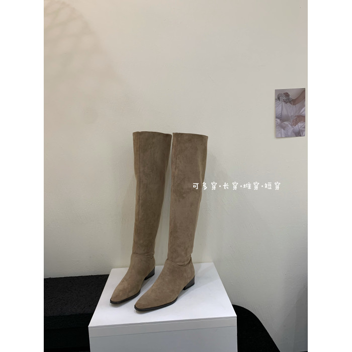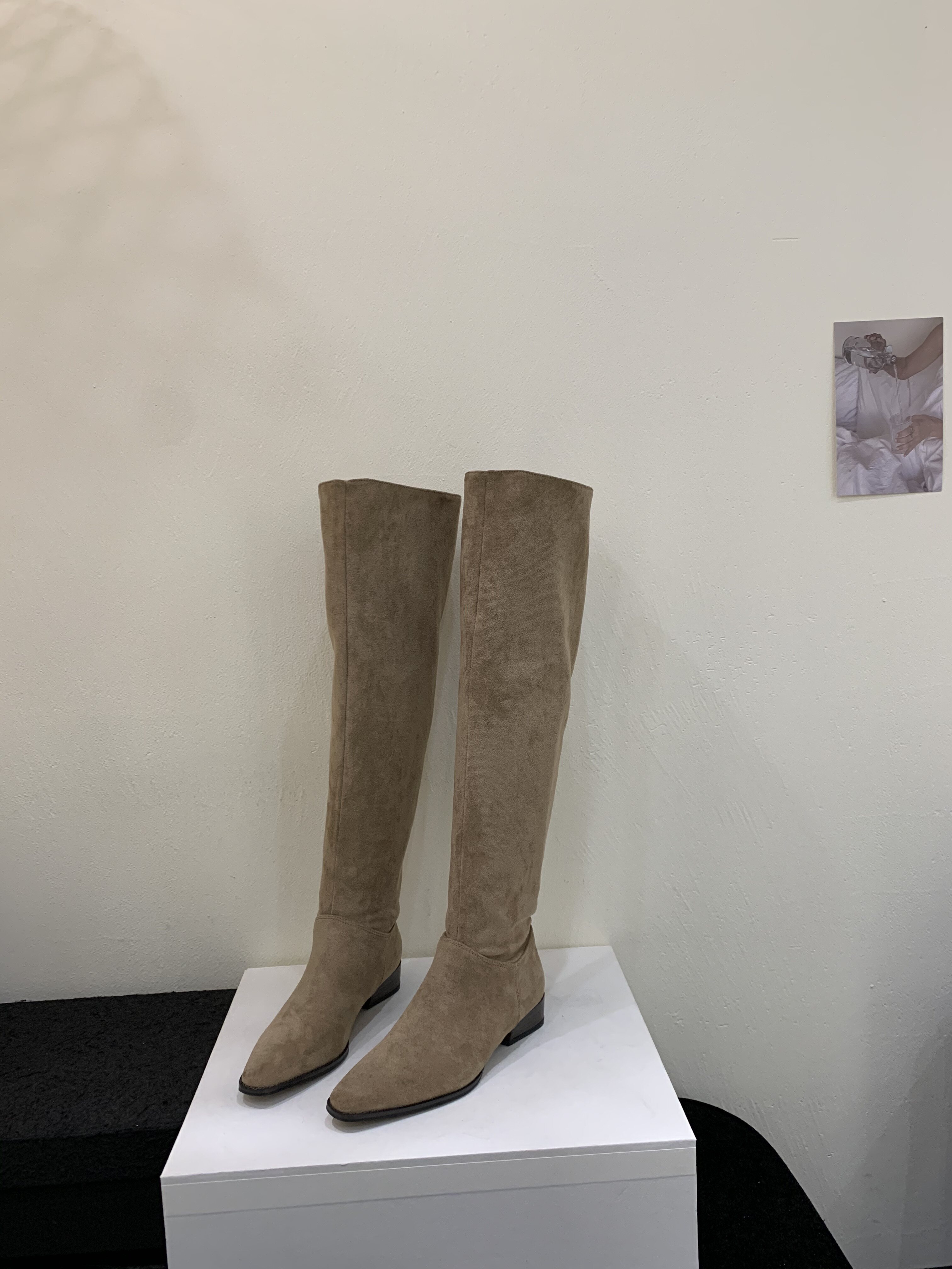 FQ3 實拍Alilover新款高筒靴女不過膝長靴絨面粗跟中跟騎士靴女靴