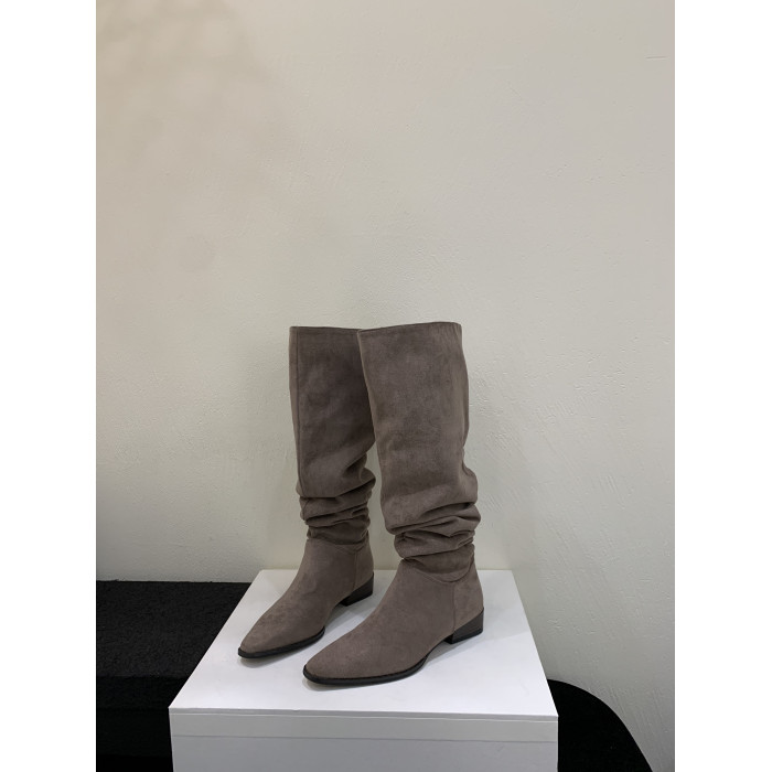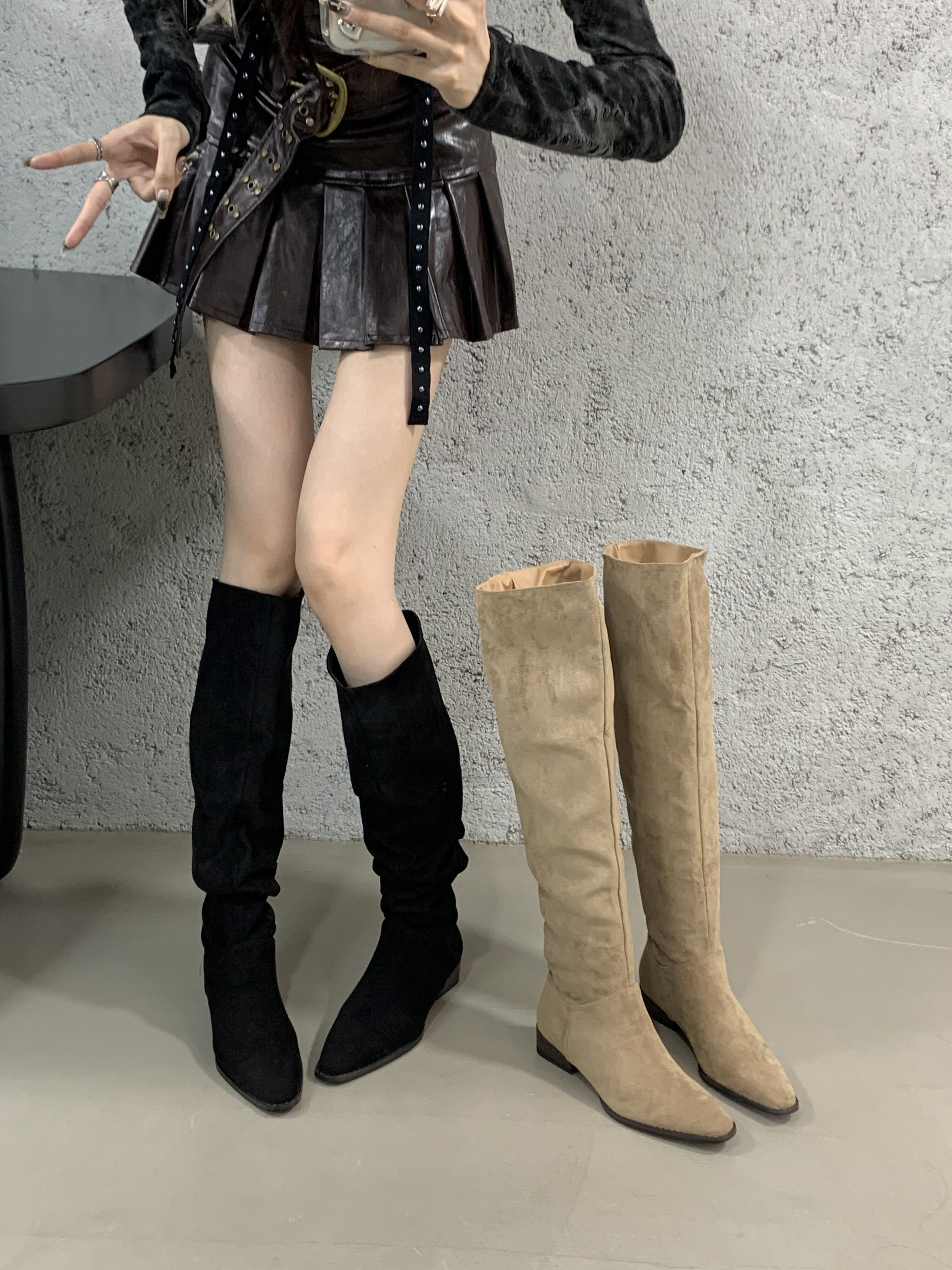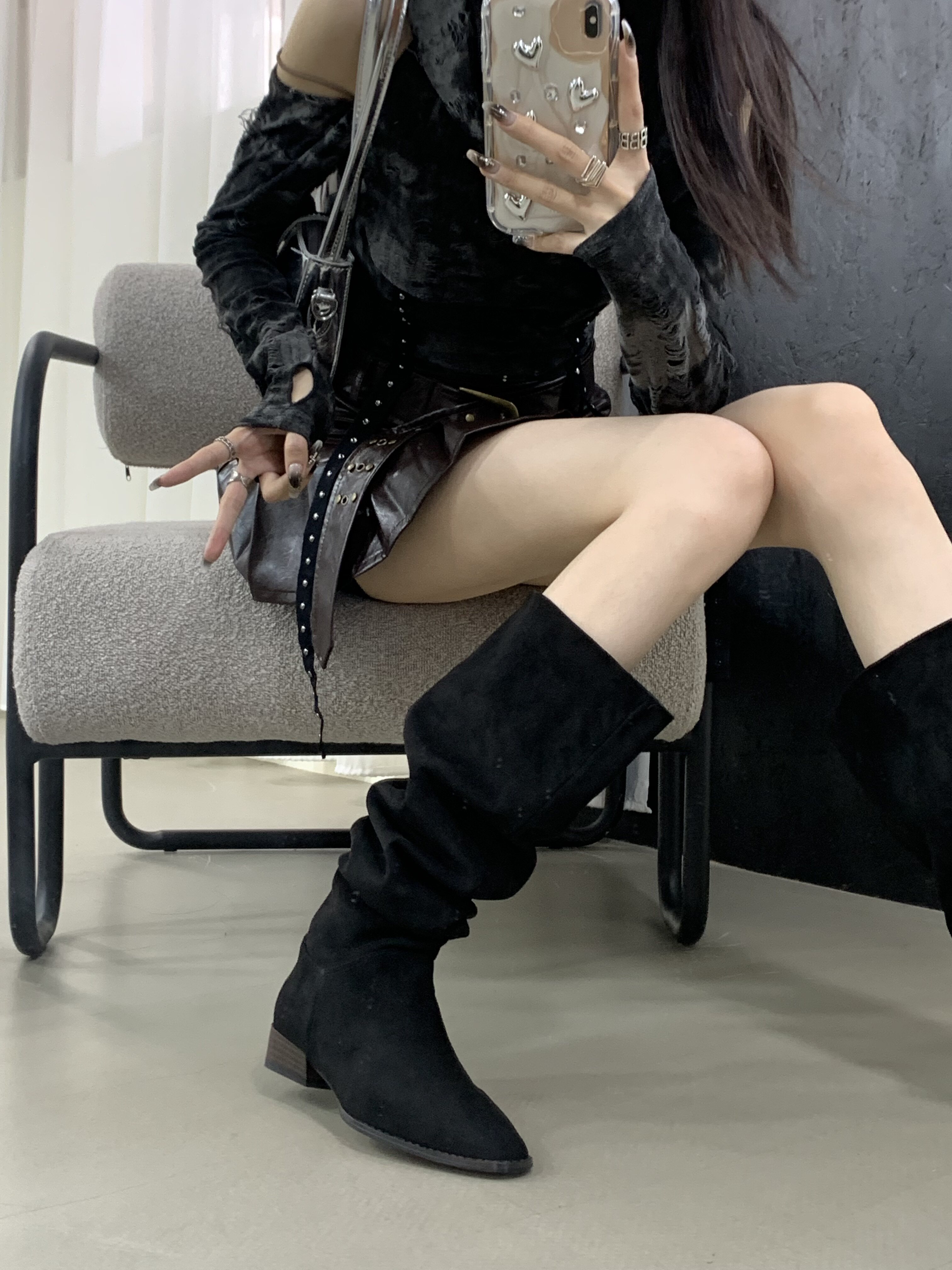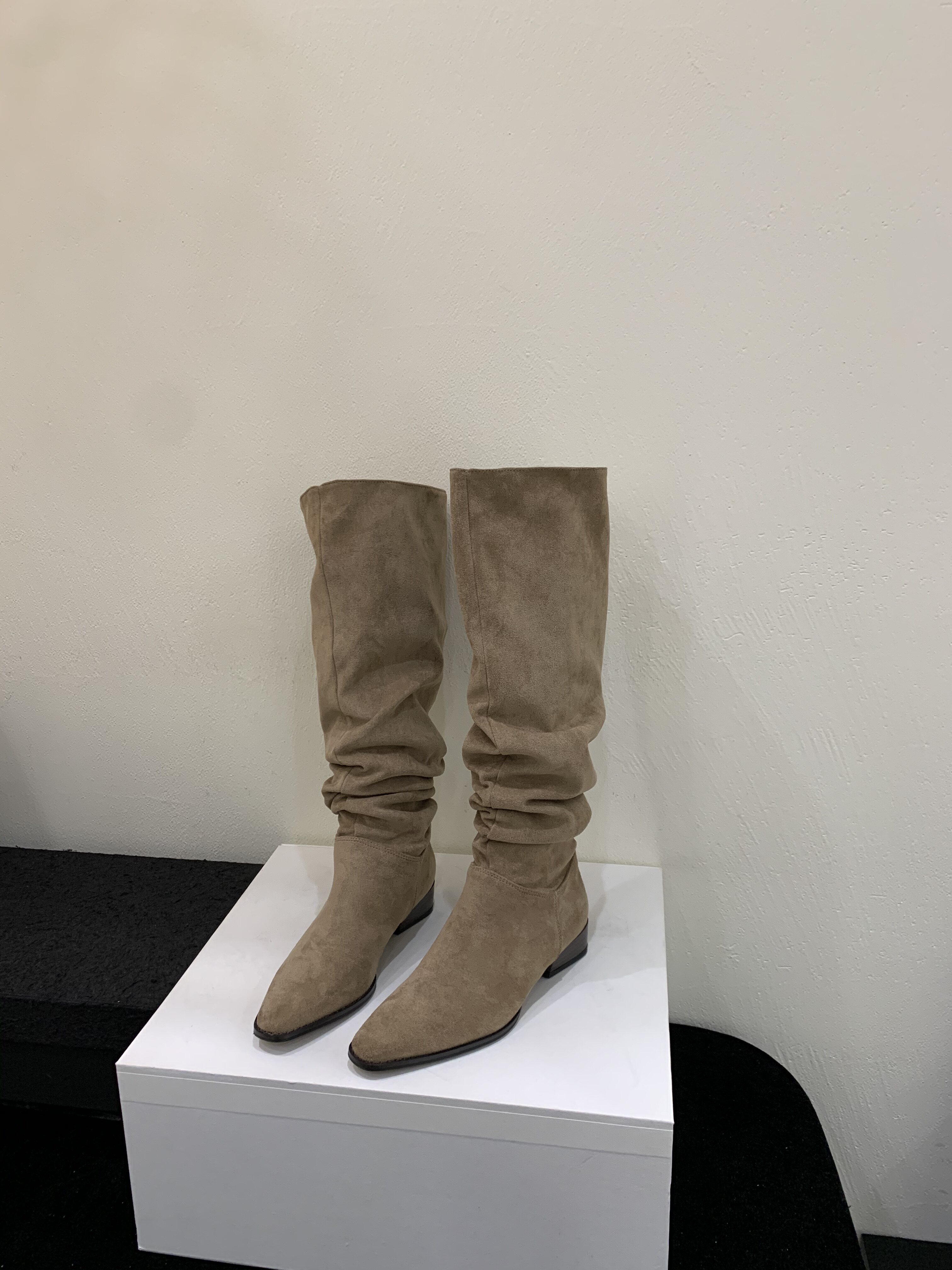 FQ3 實拍Alilover新款高筒靴女不過膝長靴絨面粗跟中跟騎士靴女靴