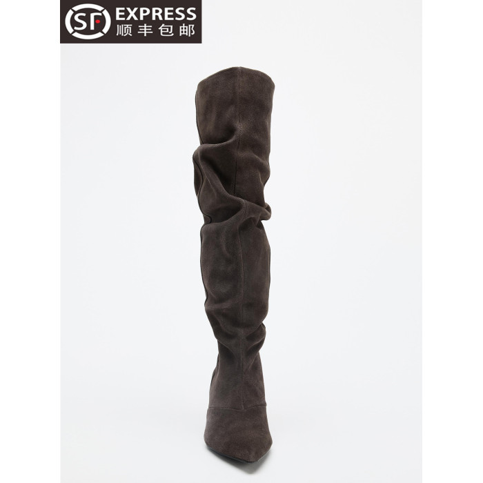 ZA女鞋2025秋冬季新款尖頭褶皺長靴牛反絨堆堆高筒靴貓跟過膝女靴