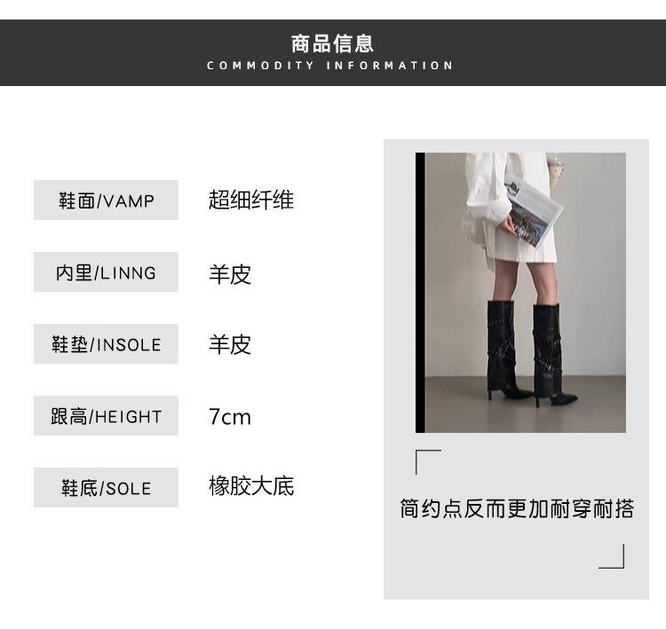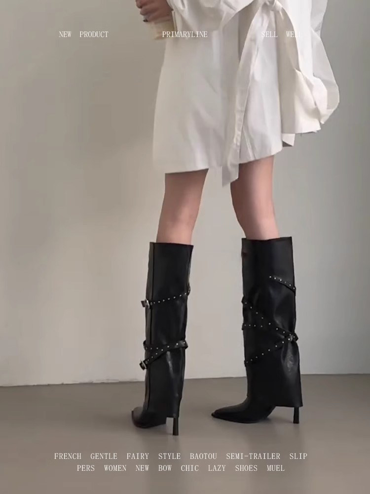 復古真皮不過膝長靴女2025新款黑色尖頭細跟褲琯靴顯瘦高跟機車靴
