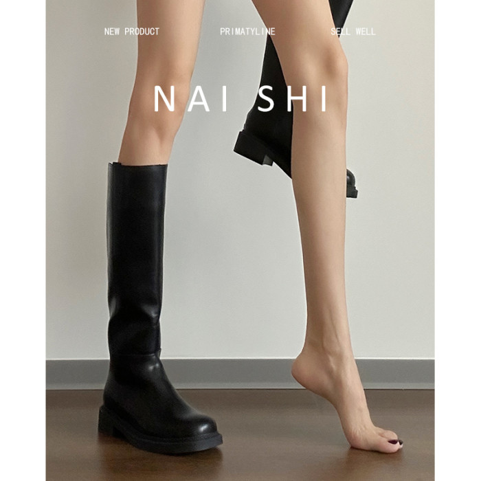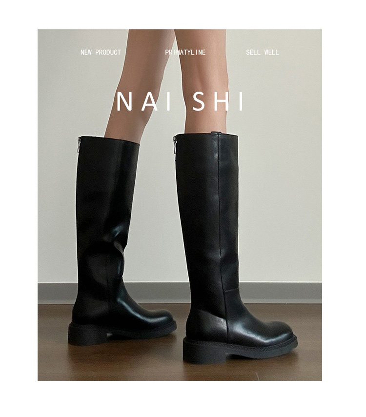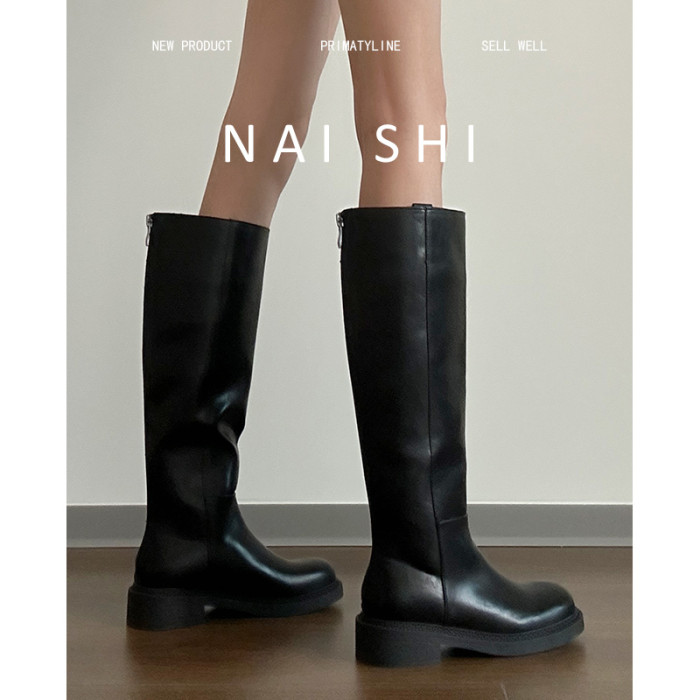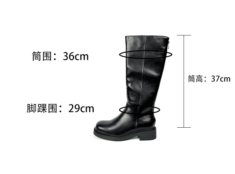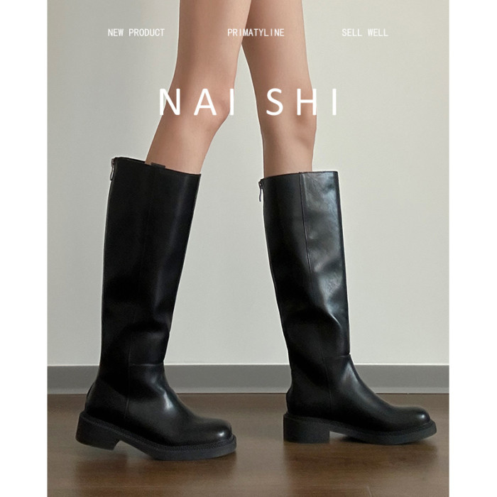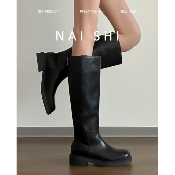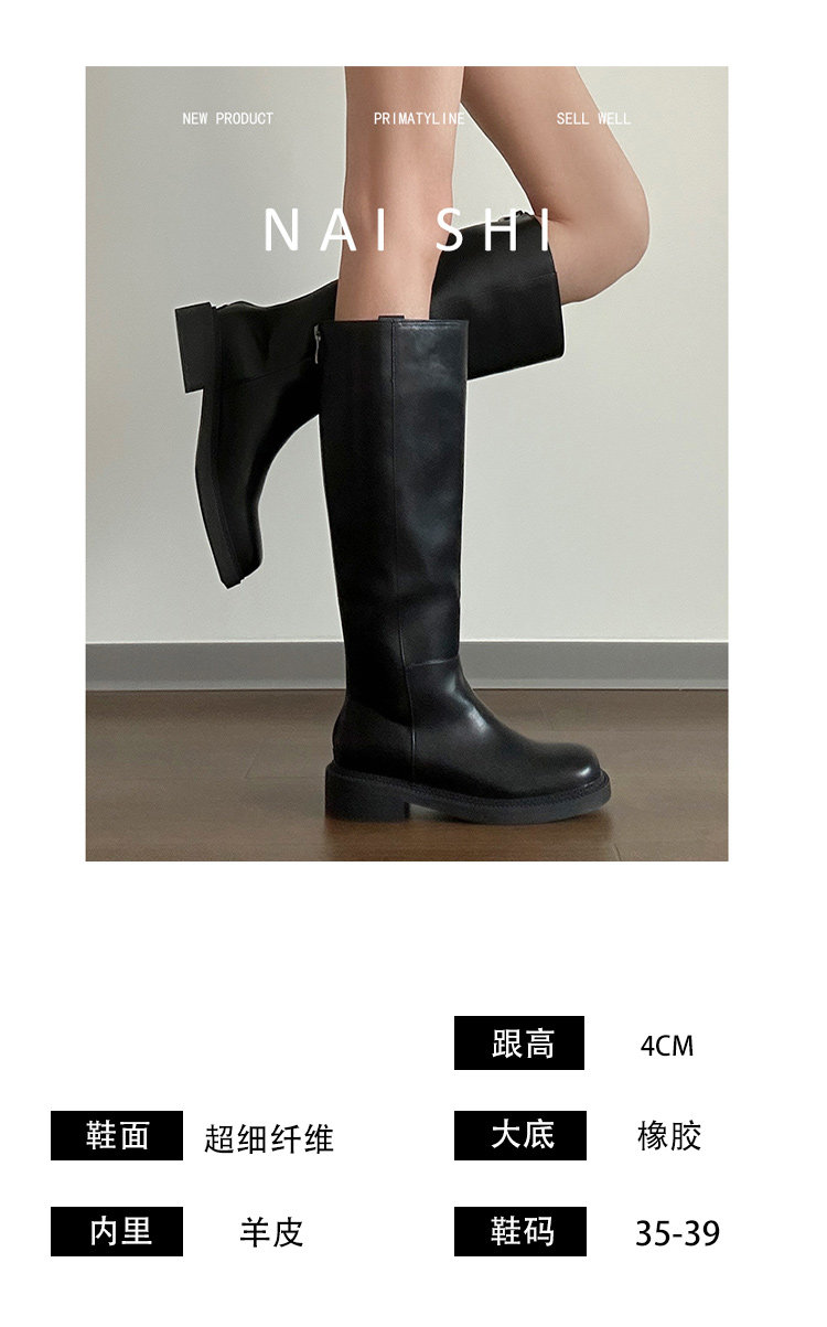 羊皮版!復古長筒靴女不過膝黑色騎士靴後拉鍊粗跟寬筒真皮長靴