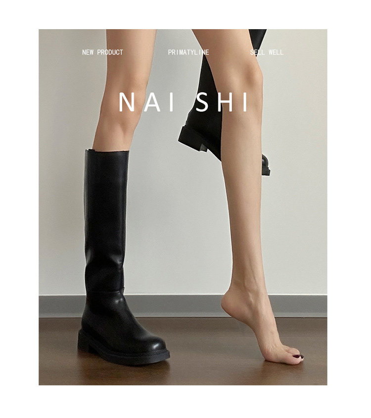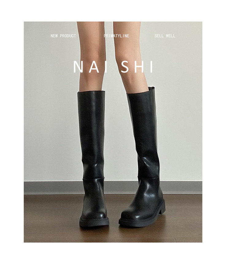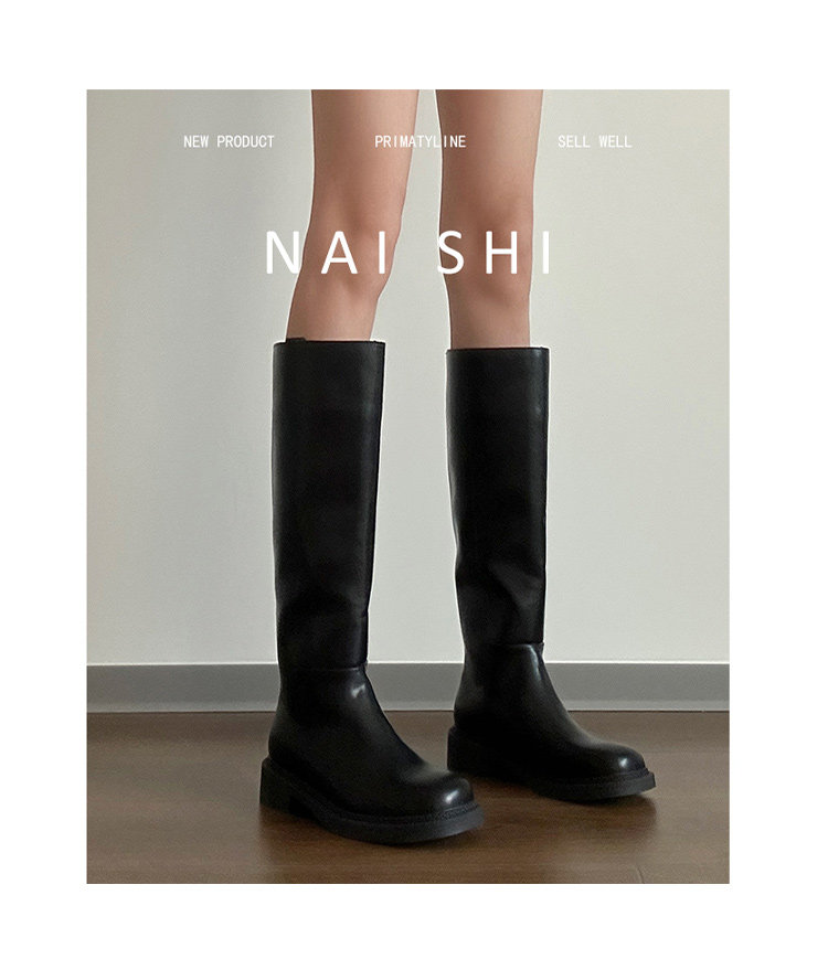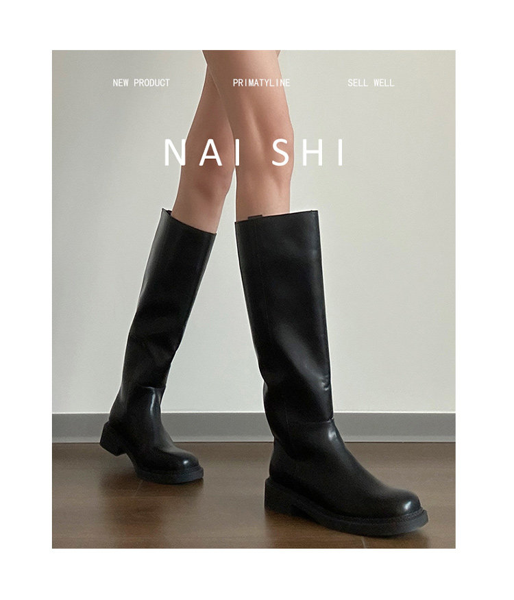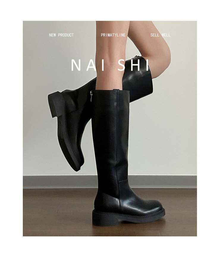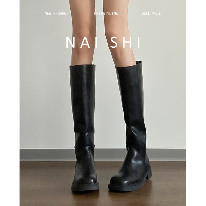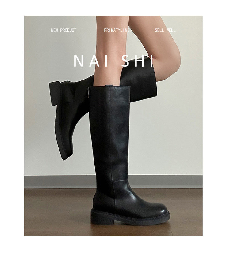羊皮版!復古長筒靴女不過膝黑色騎士靴後拉鍊粗跟寬筒真皮長靴