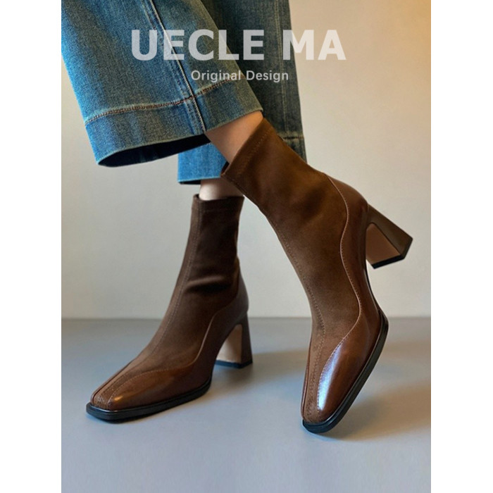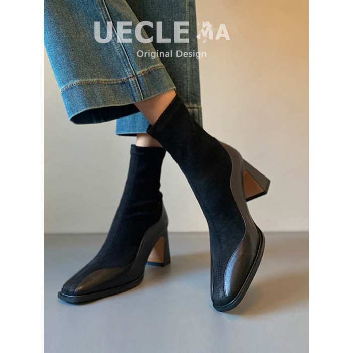 牛皮~短靴女2025新款真皮高跟鞋秋冬方頭彈力襪靴粗跟法式瘦瘦靴