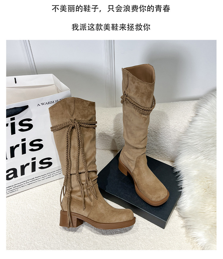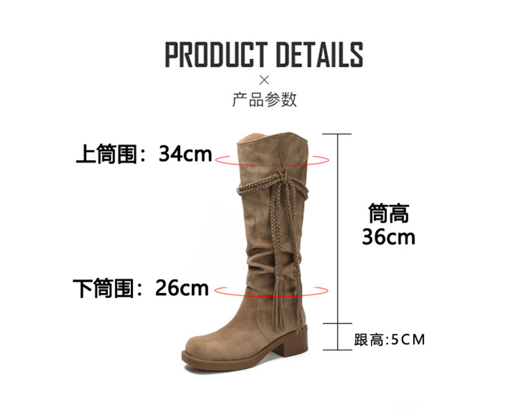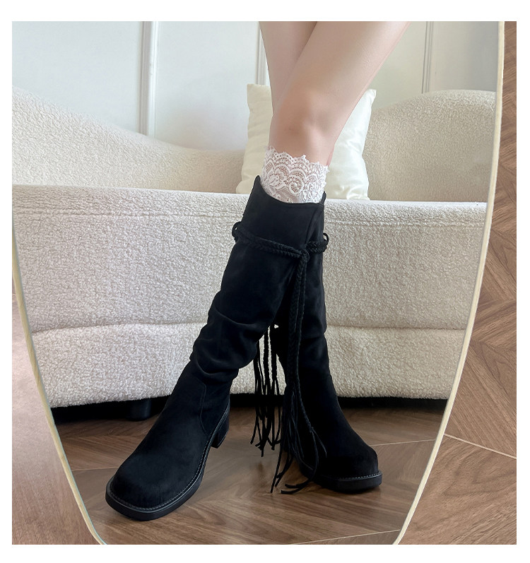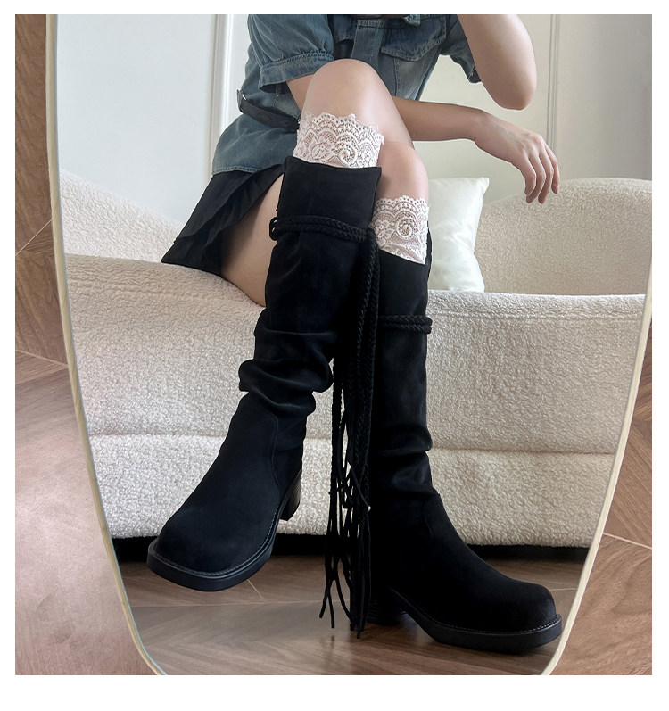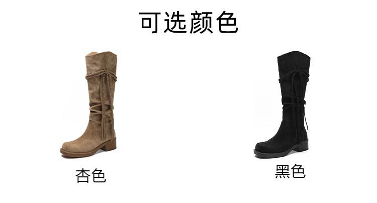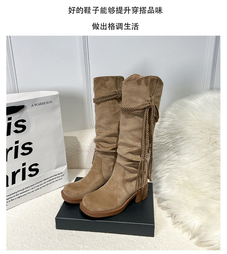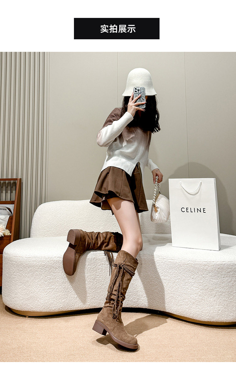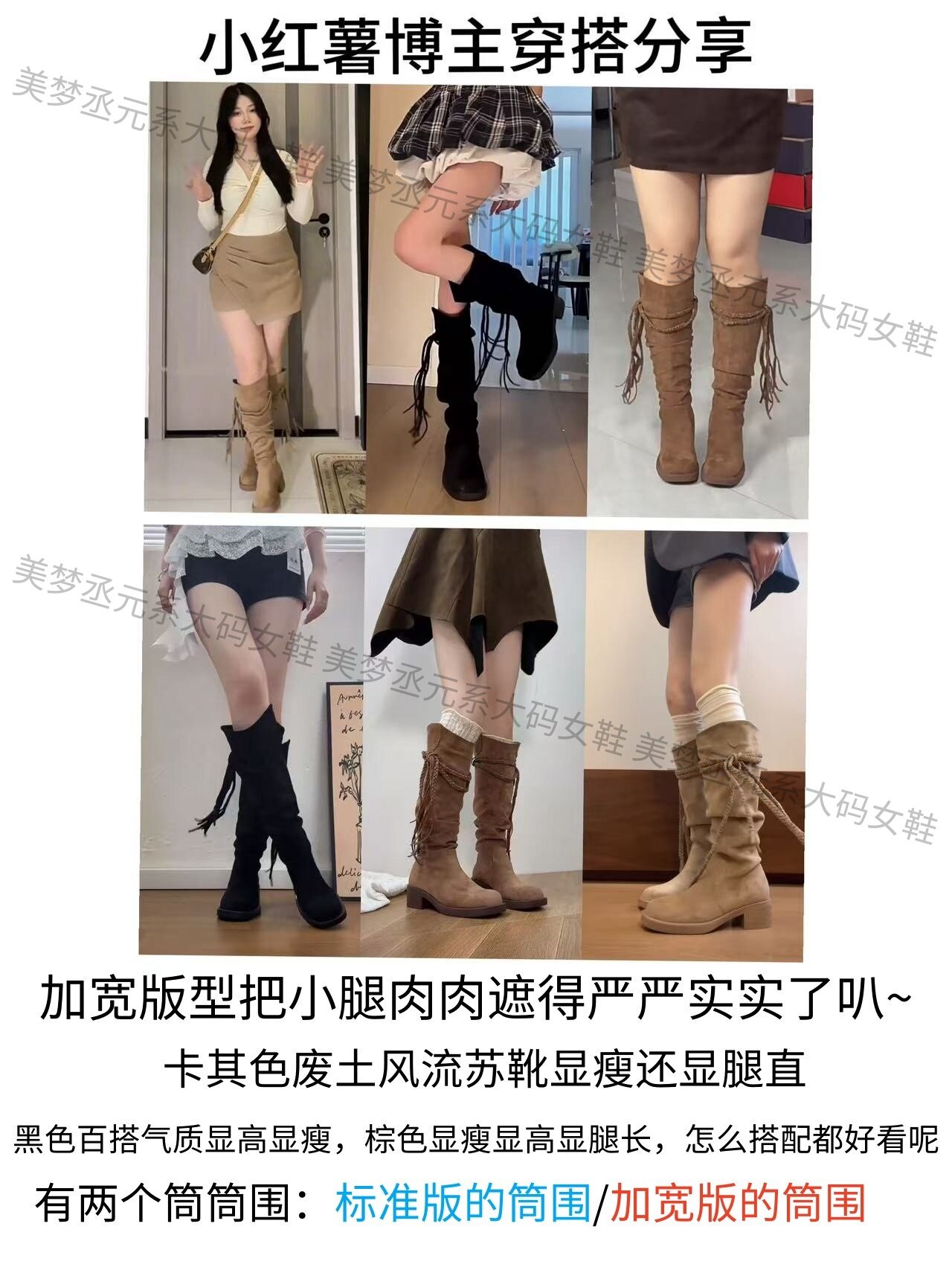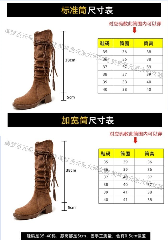 美夢丞胖mm粗腿大筒圍棕色流蘇騎士靴高跟不過膝長筒絨面堆堆靴子