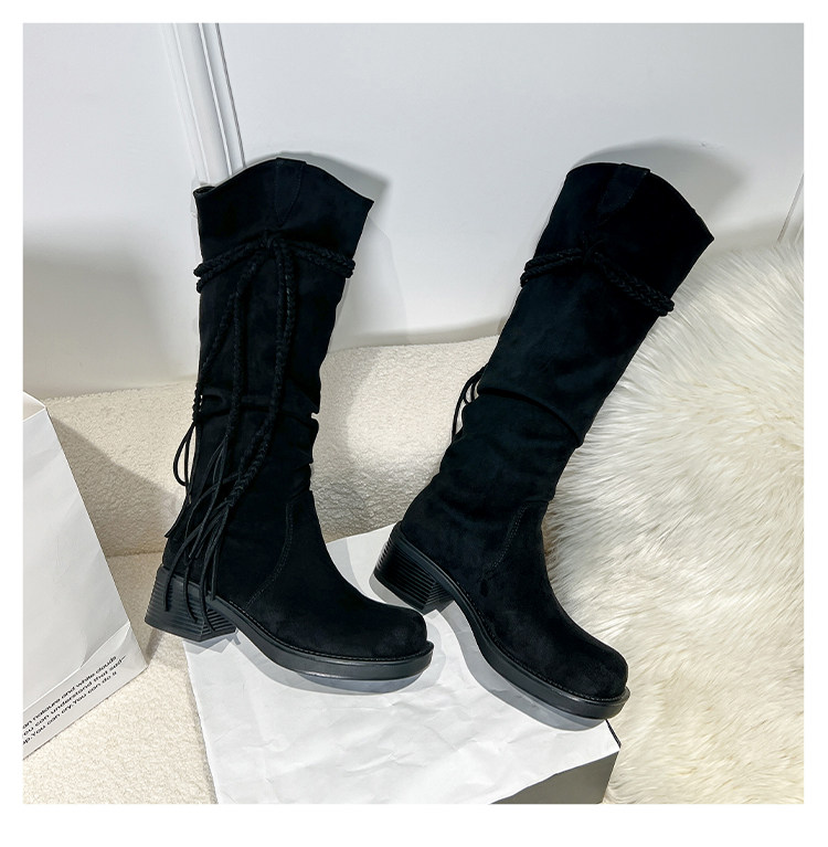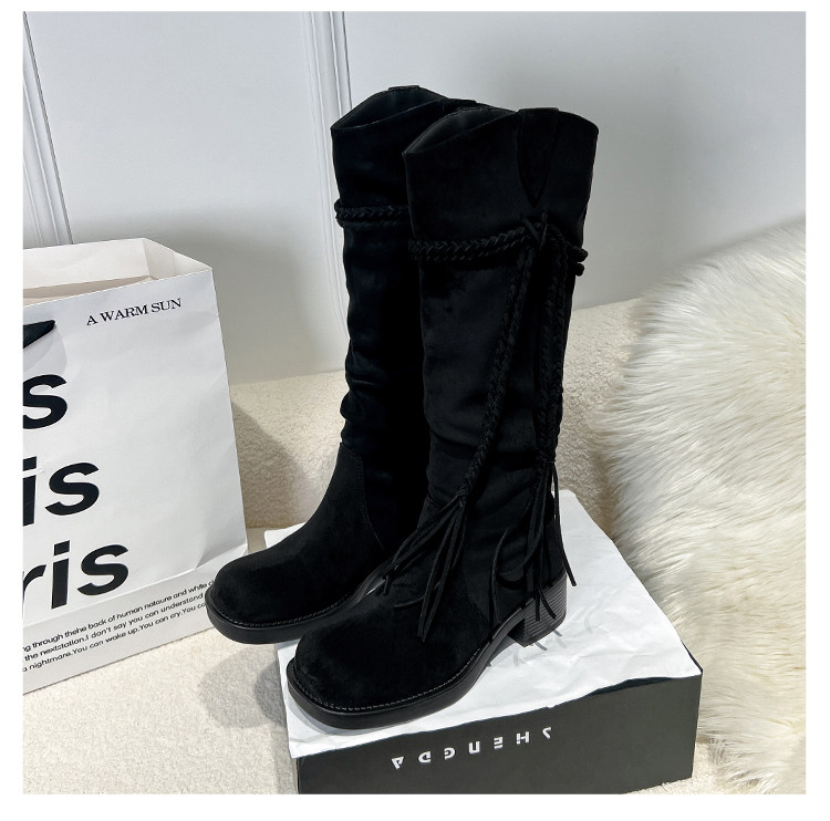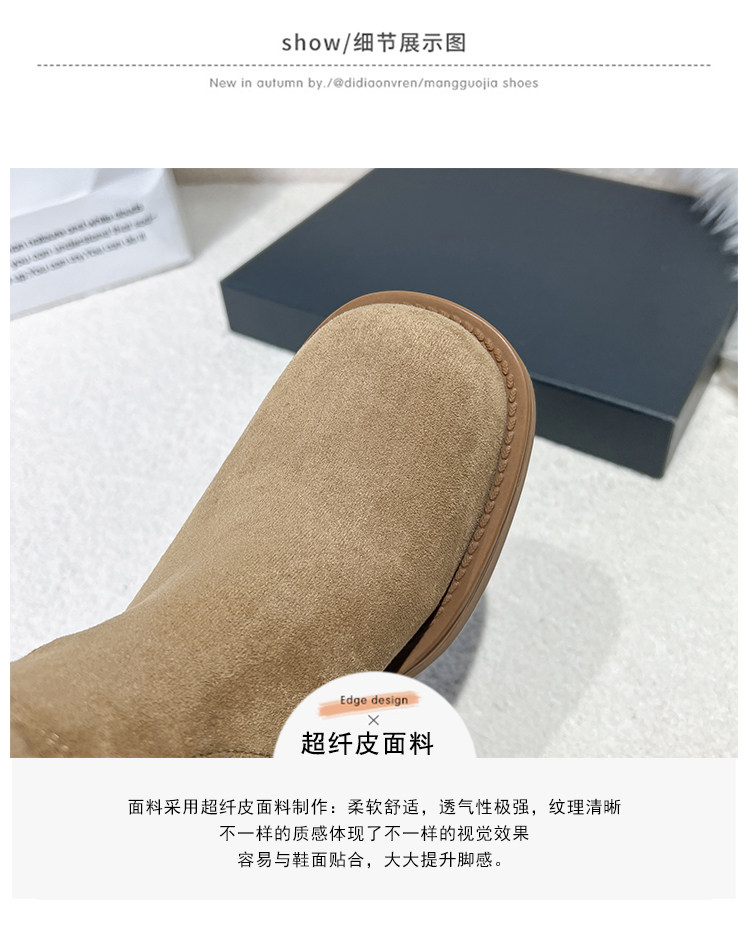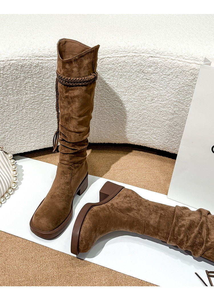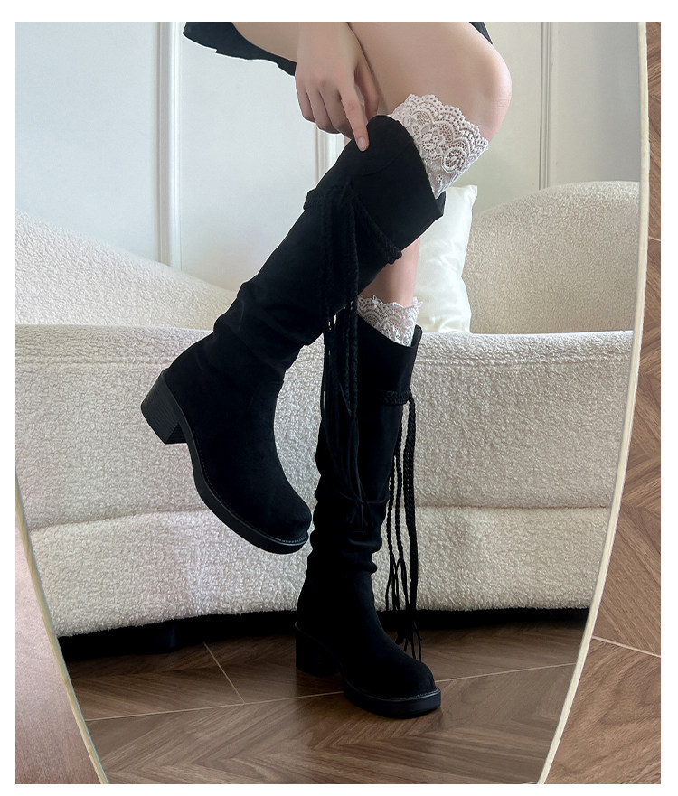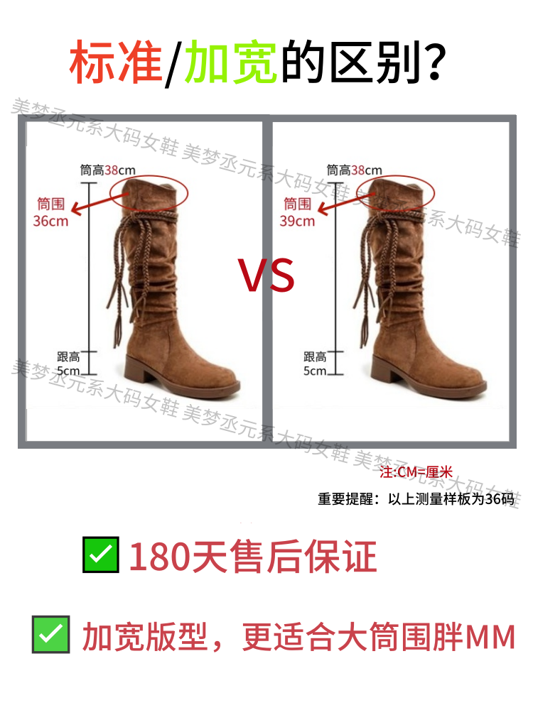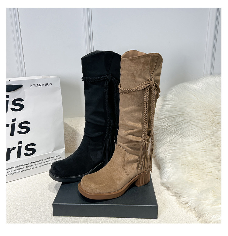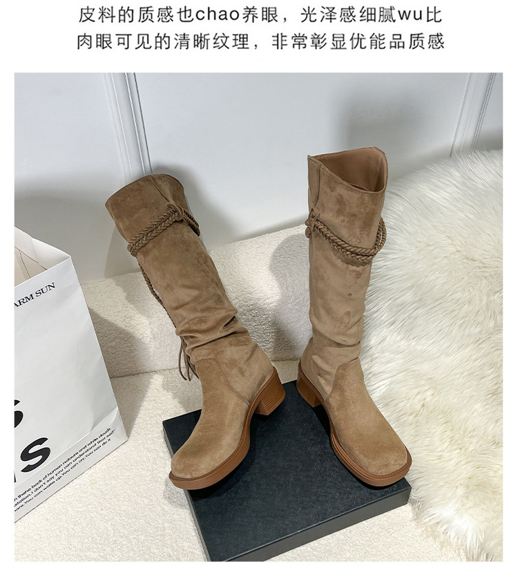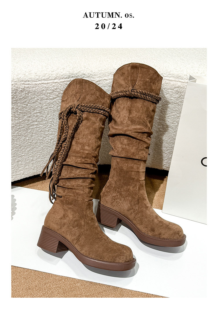 美夢丞胖mm粗腿大筒圍棕色流蘇騎士靴高跟不過膝長筒絨面堆堆靴子
