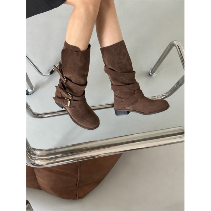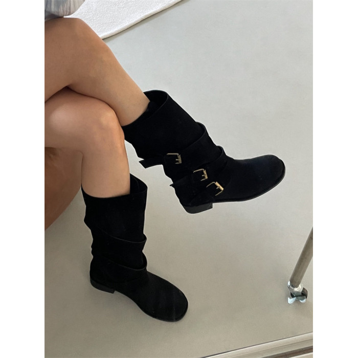 小池在首爾25年秋冬新款圓頭方跟皮帶釦騎士機車中筒絨面韓版女靴