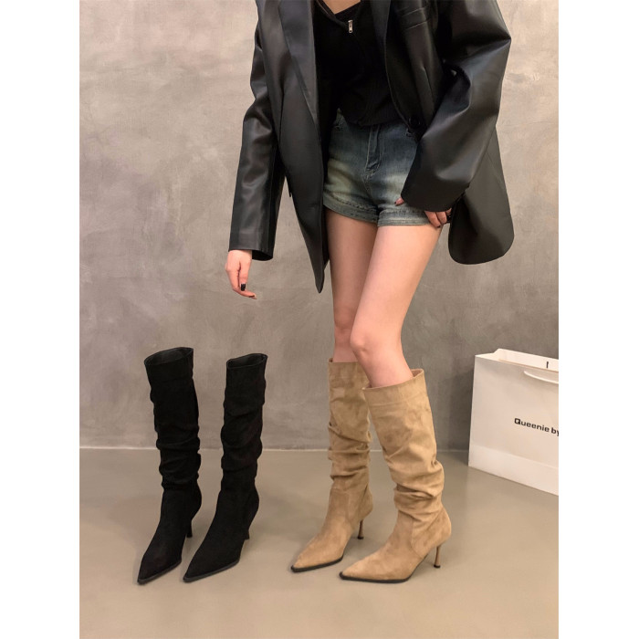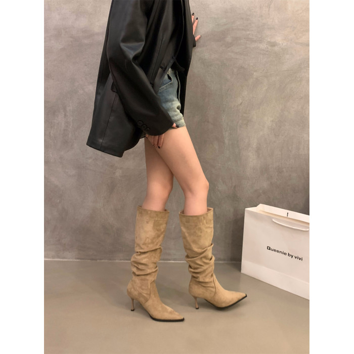 高跟尖頭卡其色絨面堆堆長靴女鞋2025春秋季單靴瘦瘦長筒騎士靴子