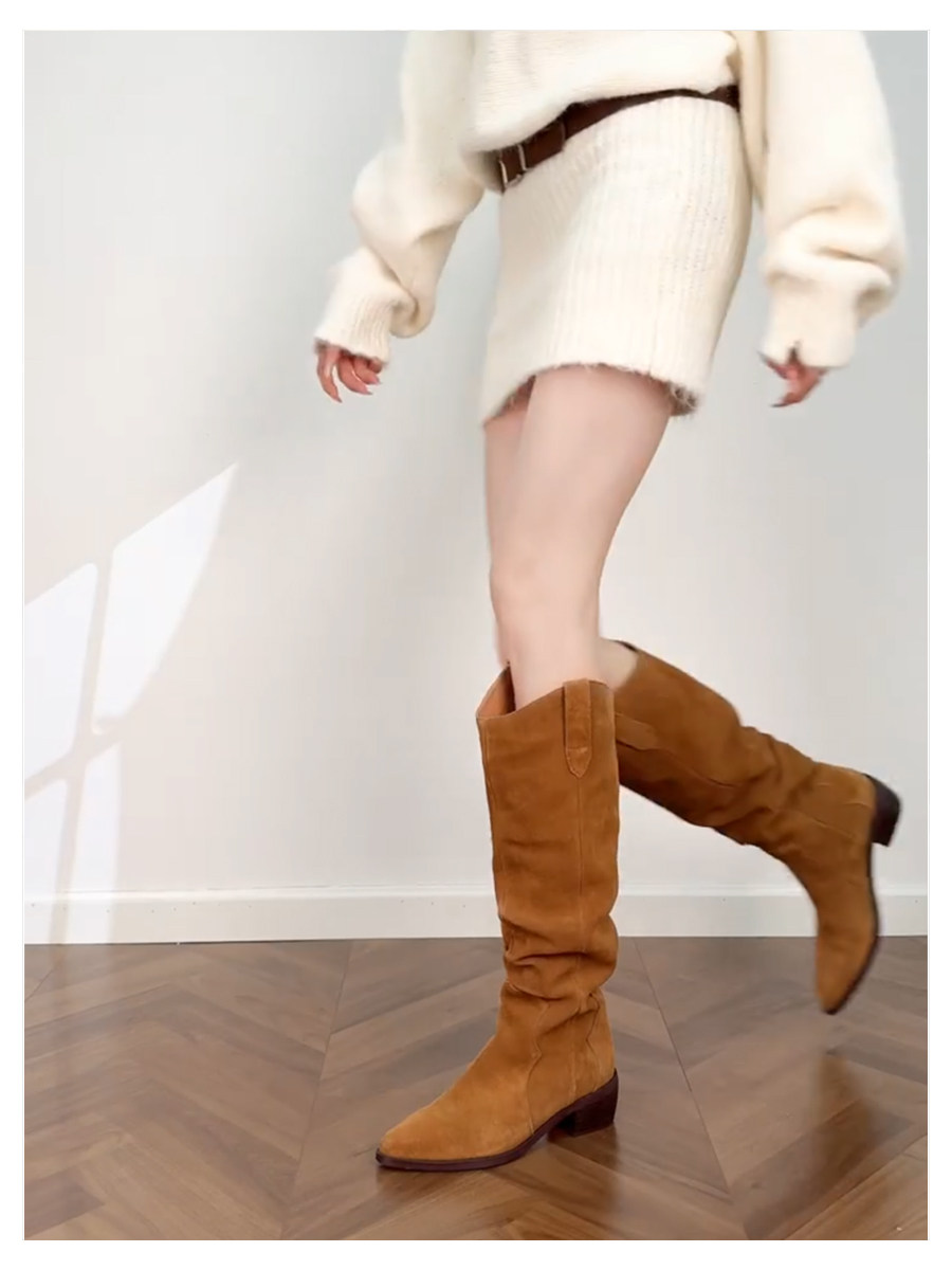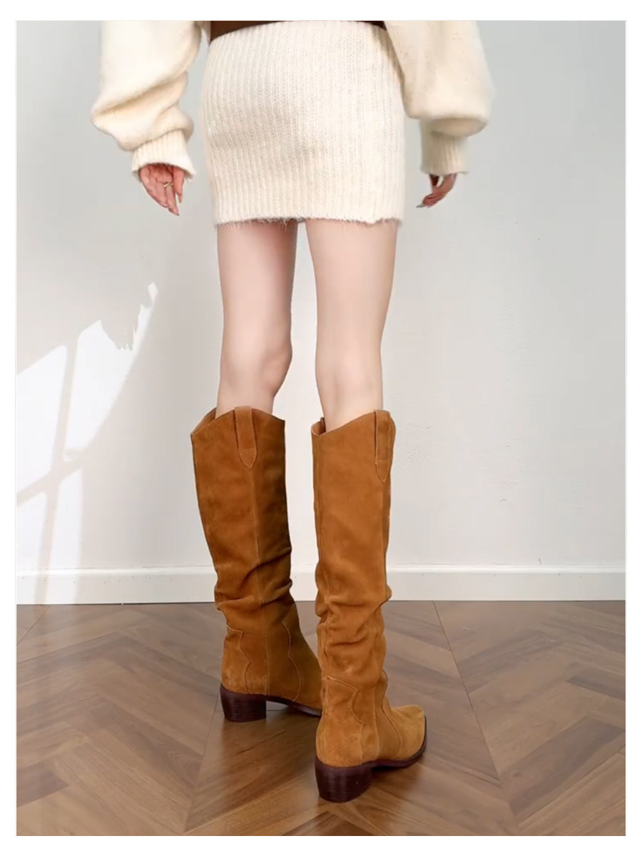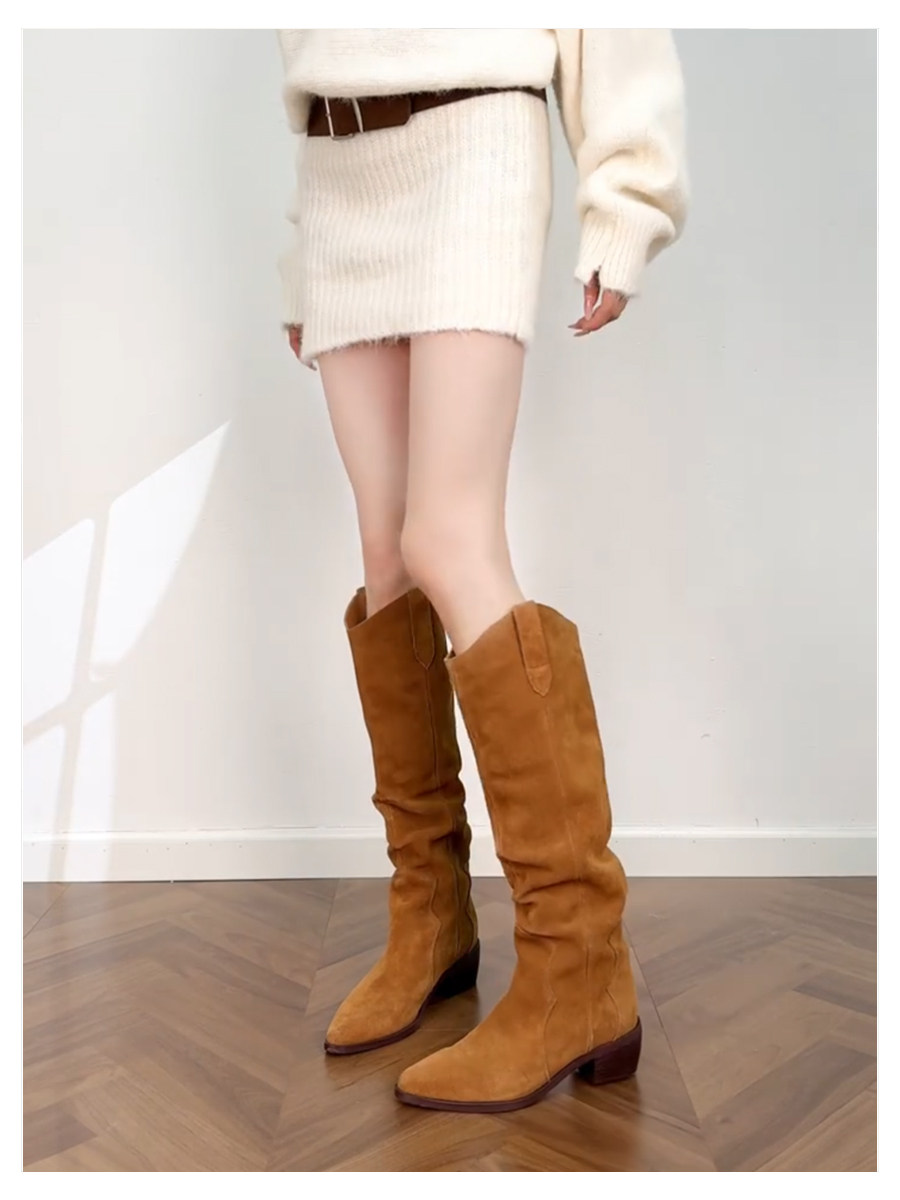 真皮尖頭西部牛仔靴女2026新款復古棕色v口堆堆靴騎士高筒長靴女