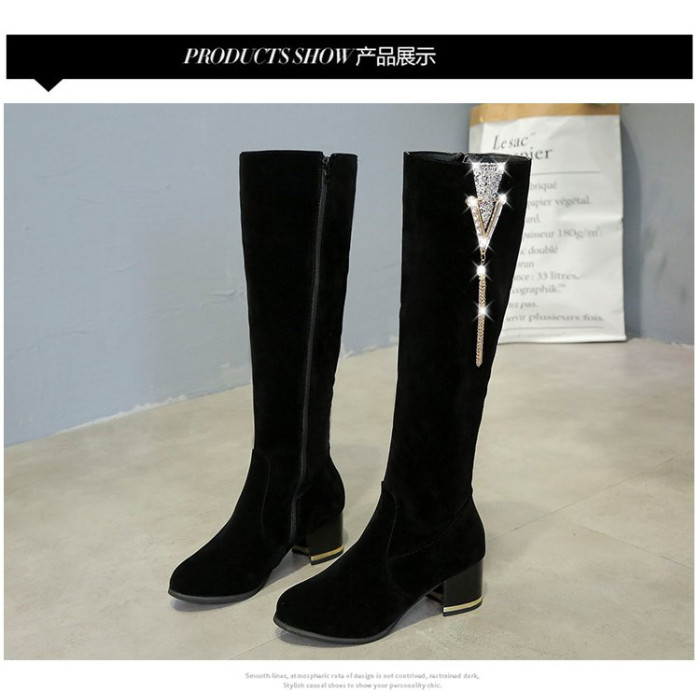 鏈子女鞋水鑽女靴新款靴子女長拉鍊冬靴高筒長靴春秋冬保暖騎士靴
