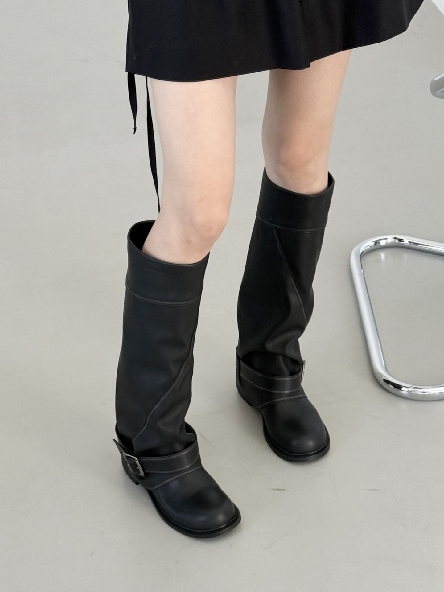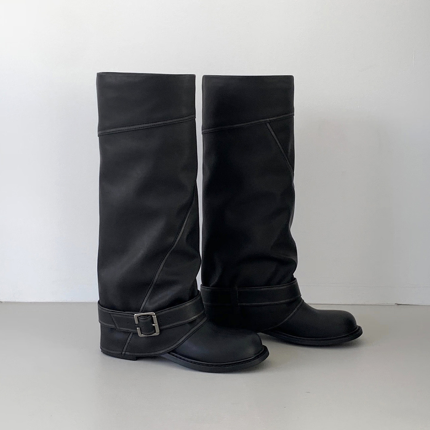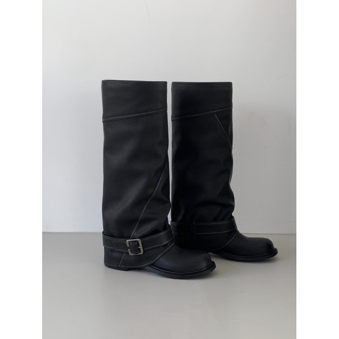 牛皮版~韓國小衆寬口顯瘦高筒褲琯靴女皮帶釦西部長靴拼接長筒靴