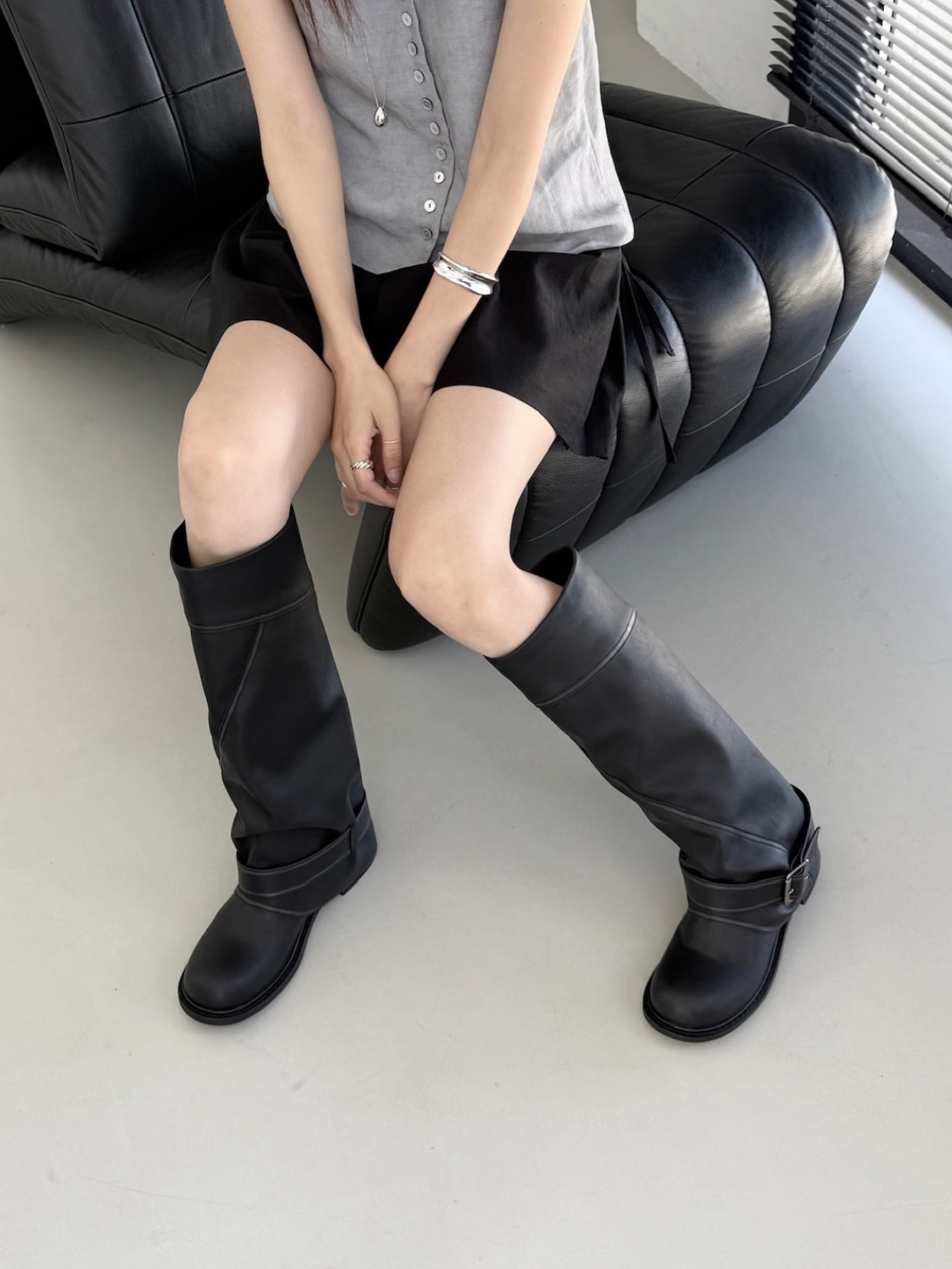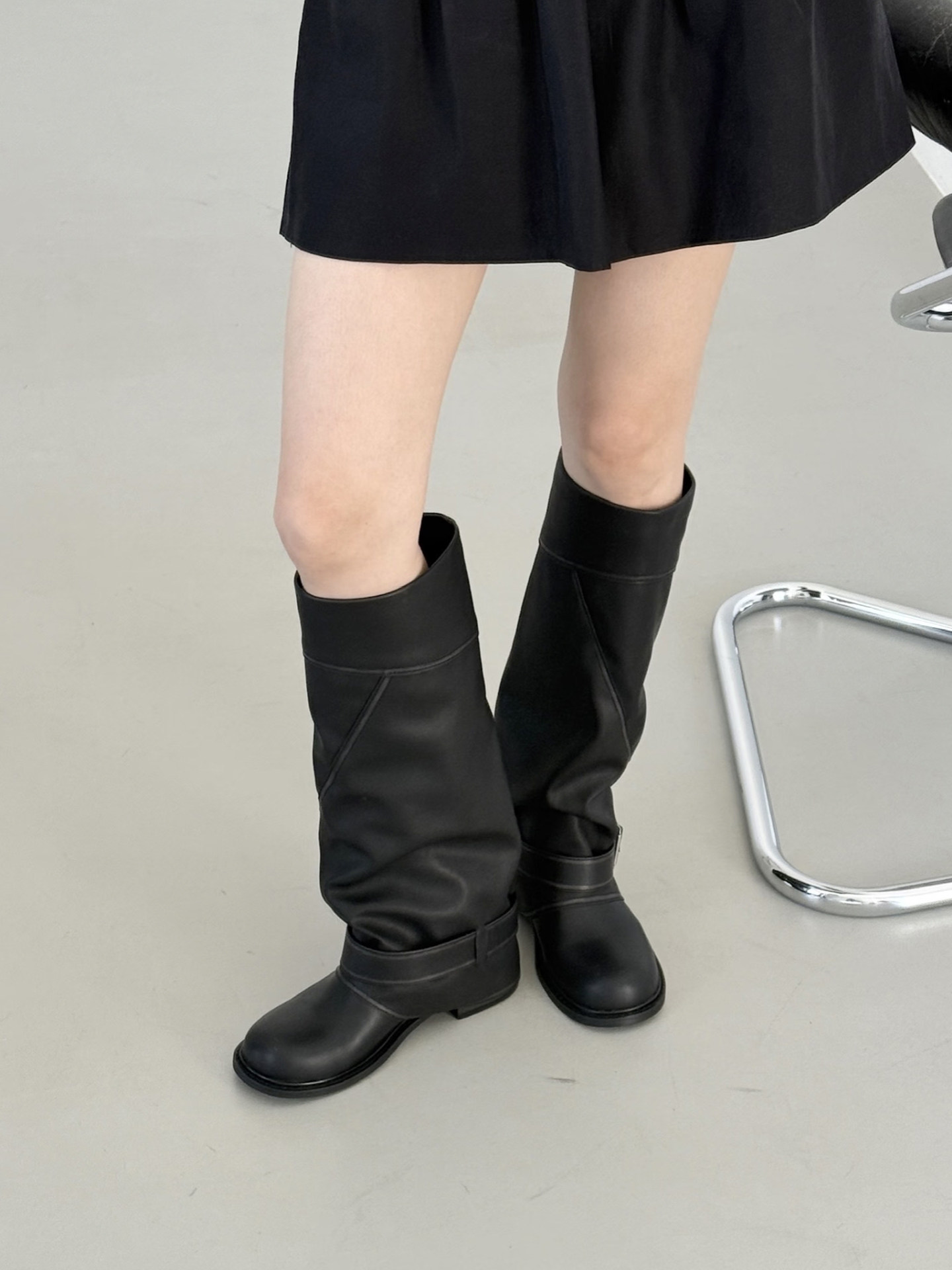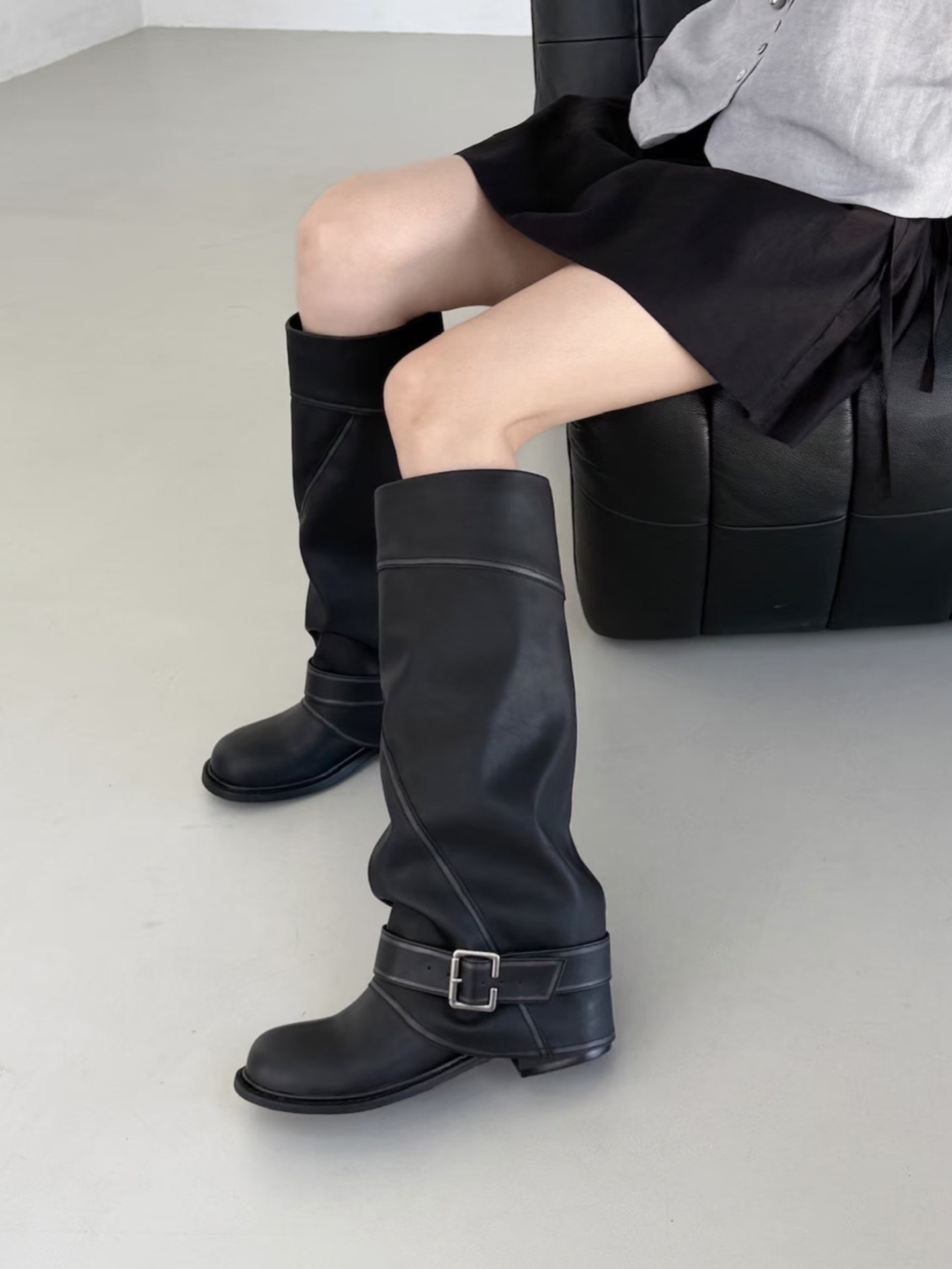 牛皮版~韓國小衆寬口顯瘦高筒褲琯靴女皮帶釦西部長靴拼接長筒靴