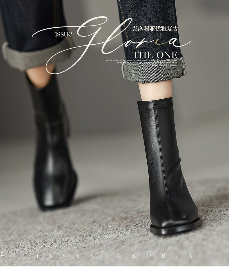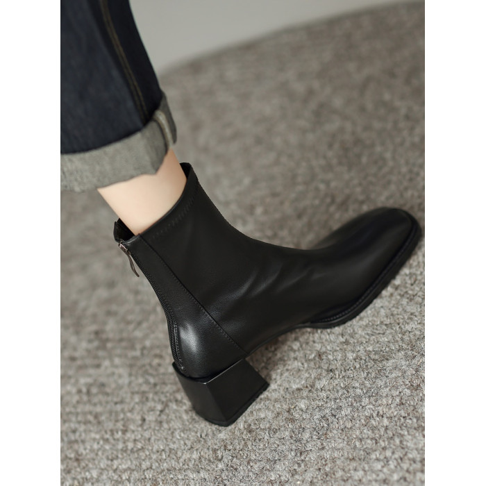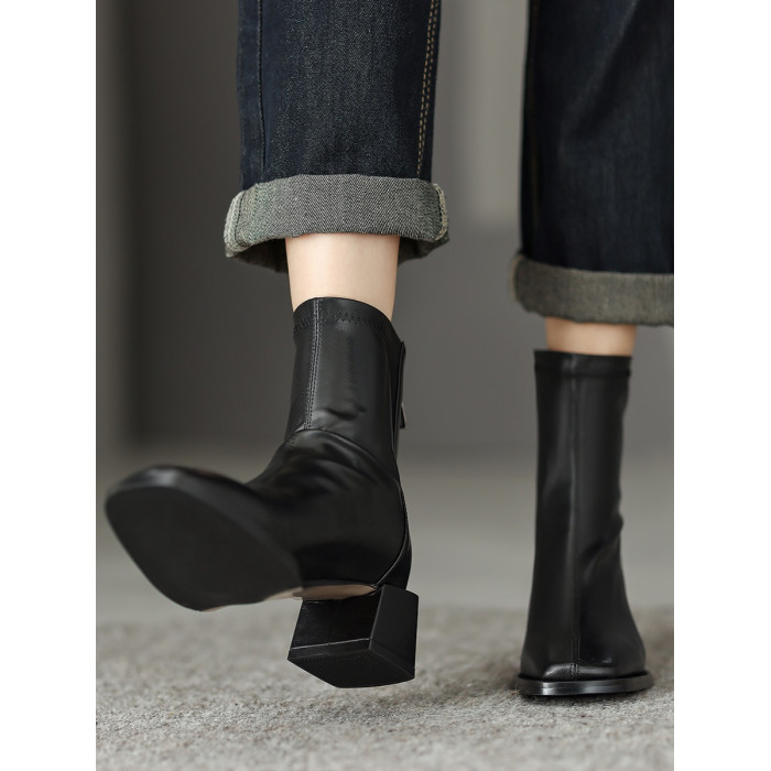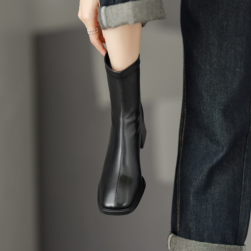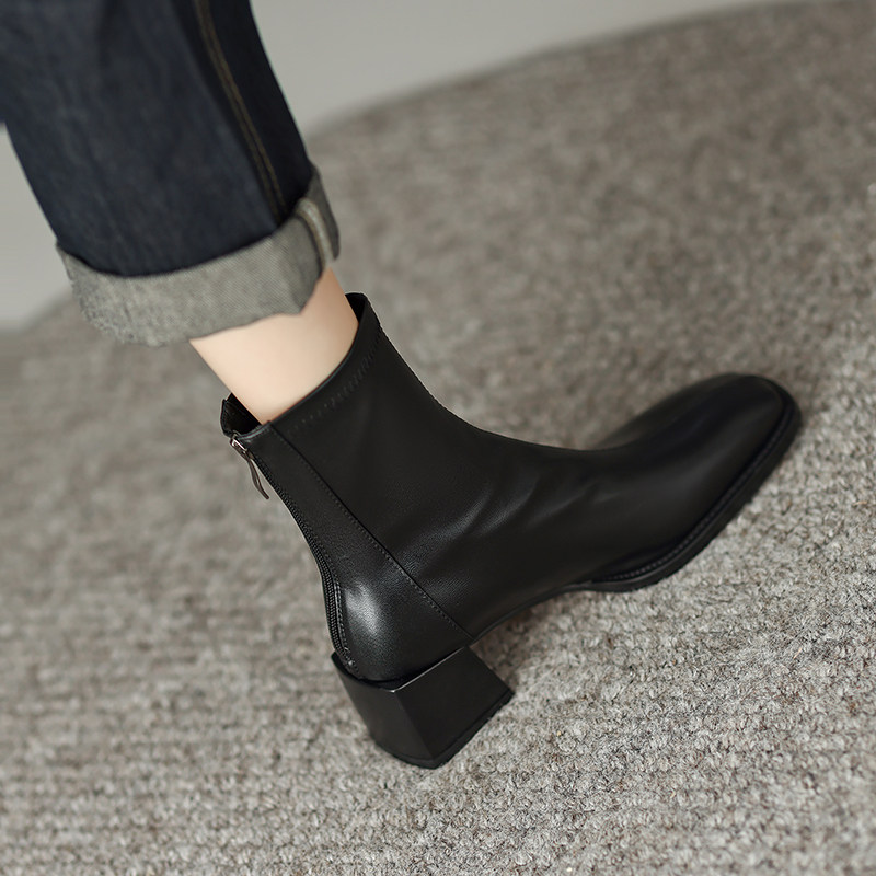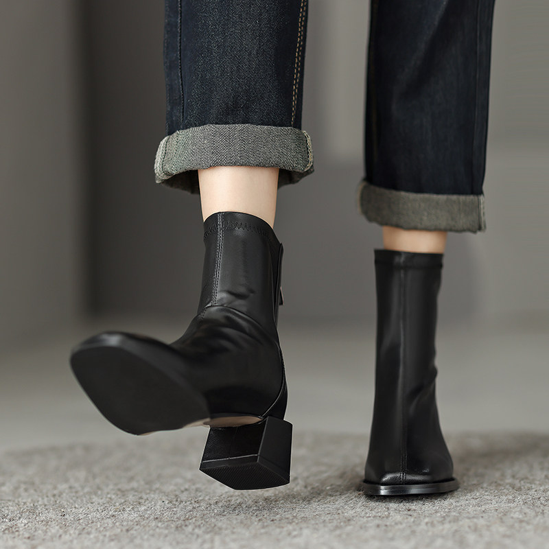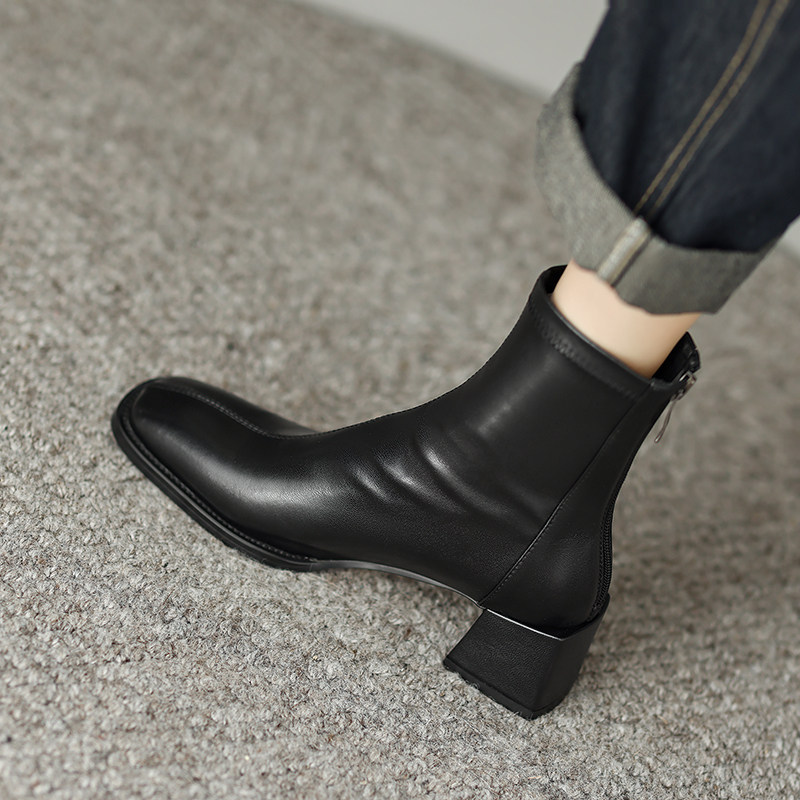 真皮方頭粗跟短靴女2025秋冬新款氣質百搭瘦瘦靴後拉鍊中跟彈力靴
