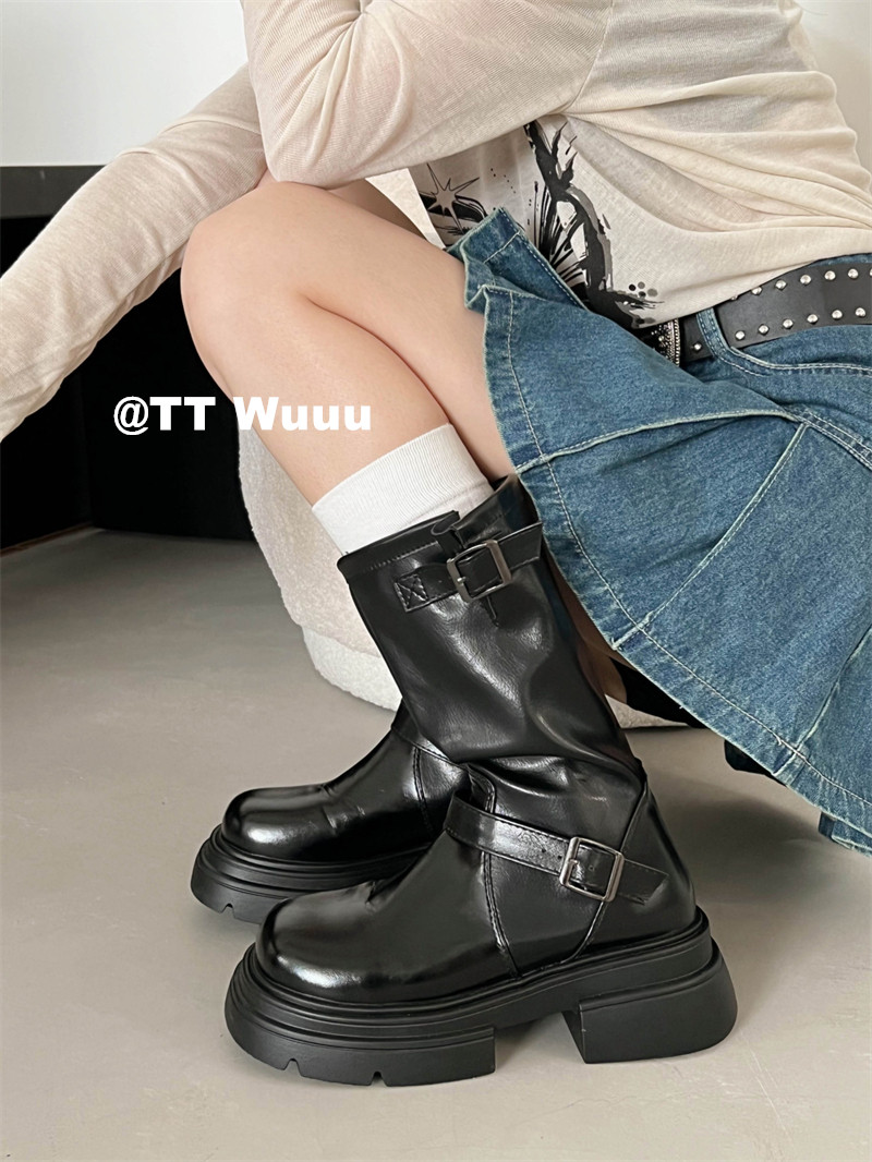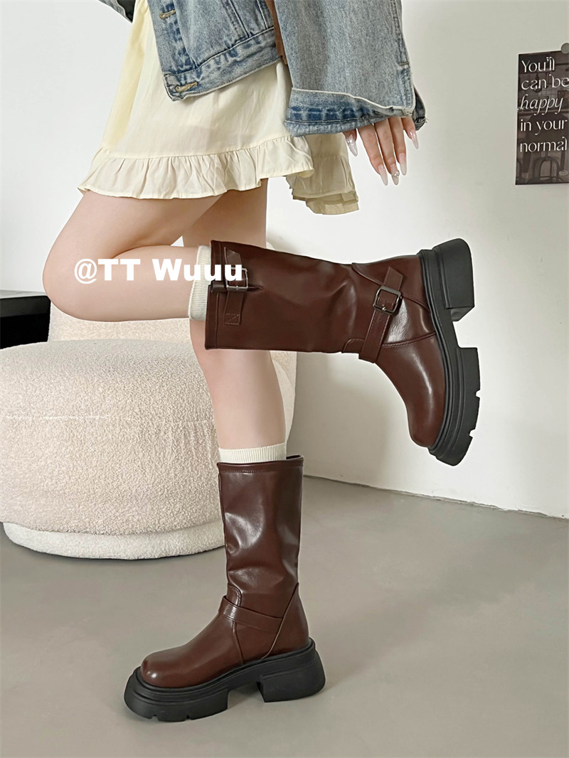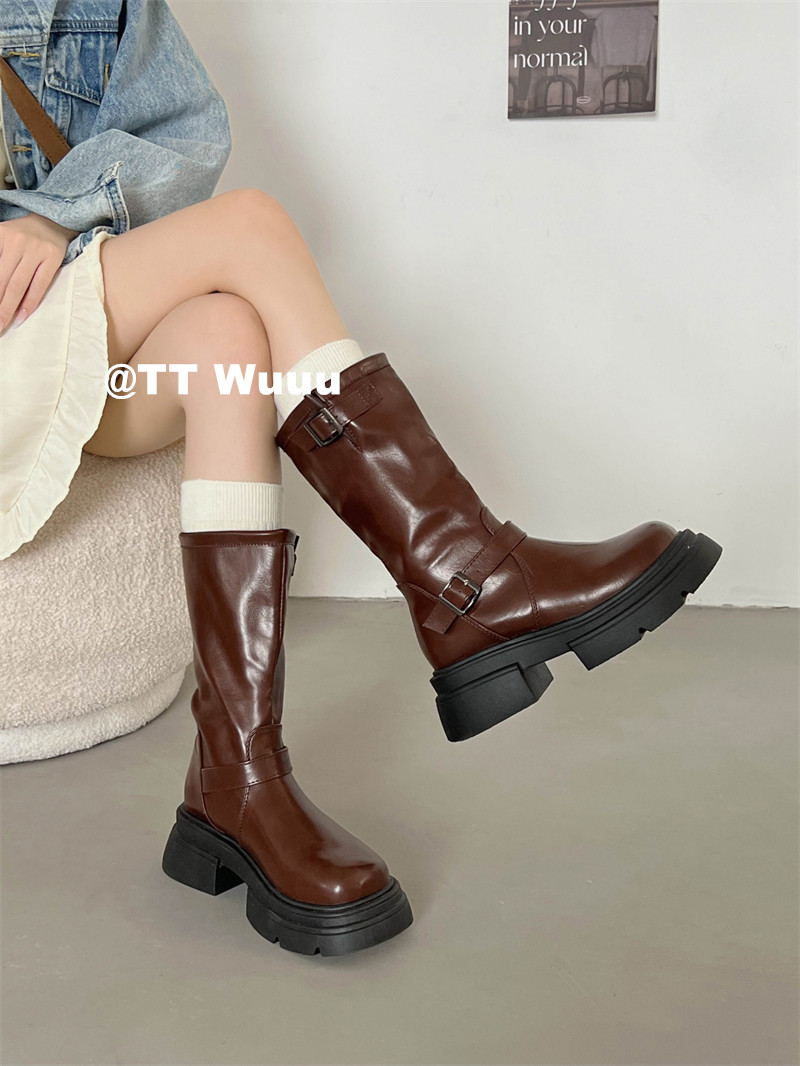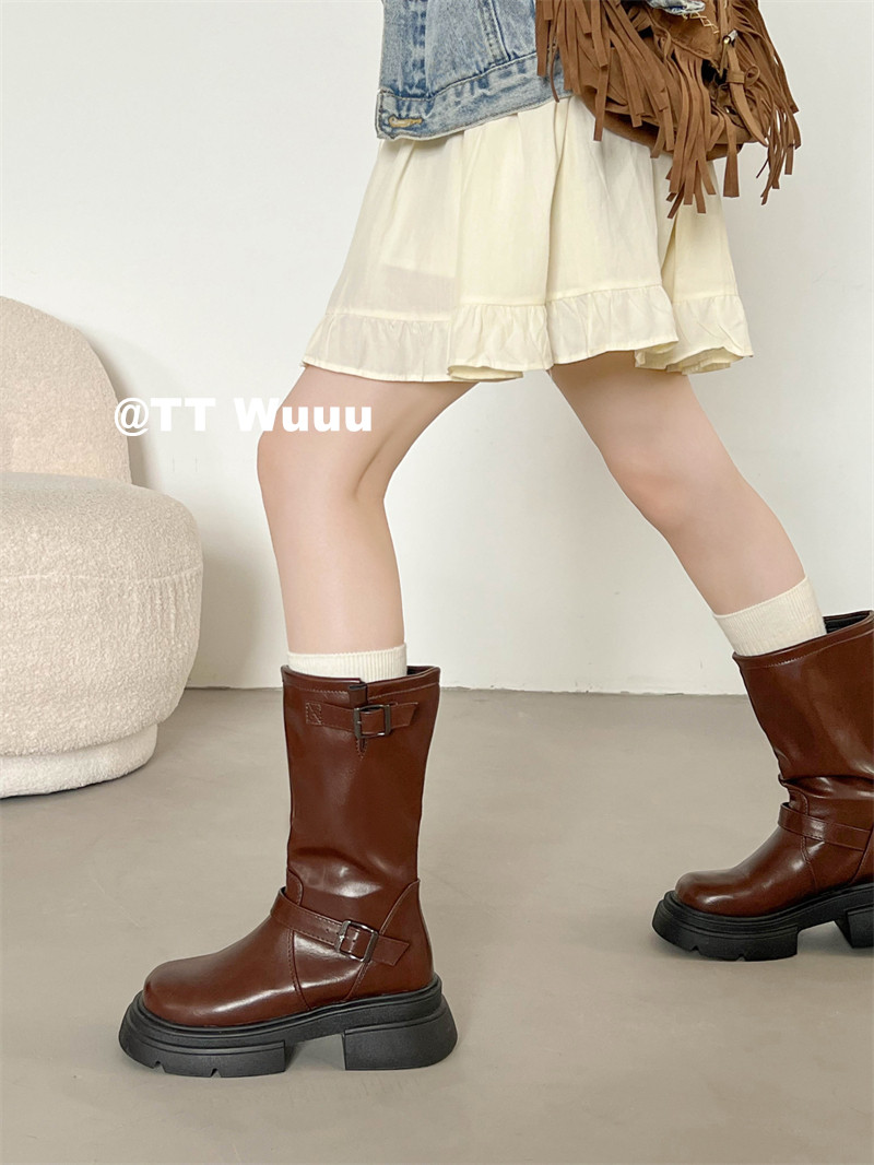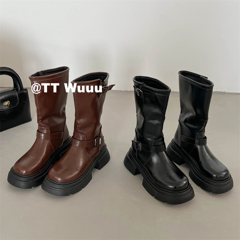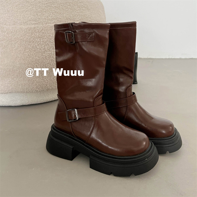 TTWuuu美拉德風厚底中高筒騎士靴復古顯瘦增高西部靴短靴小腿靴女