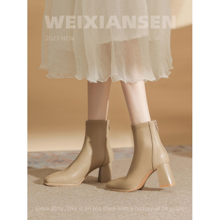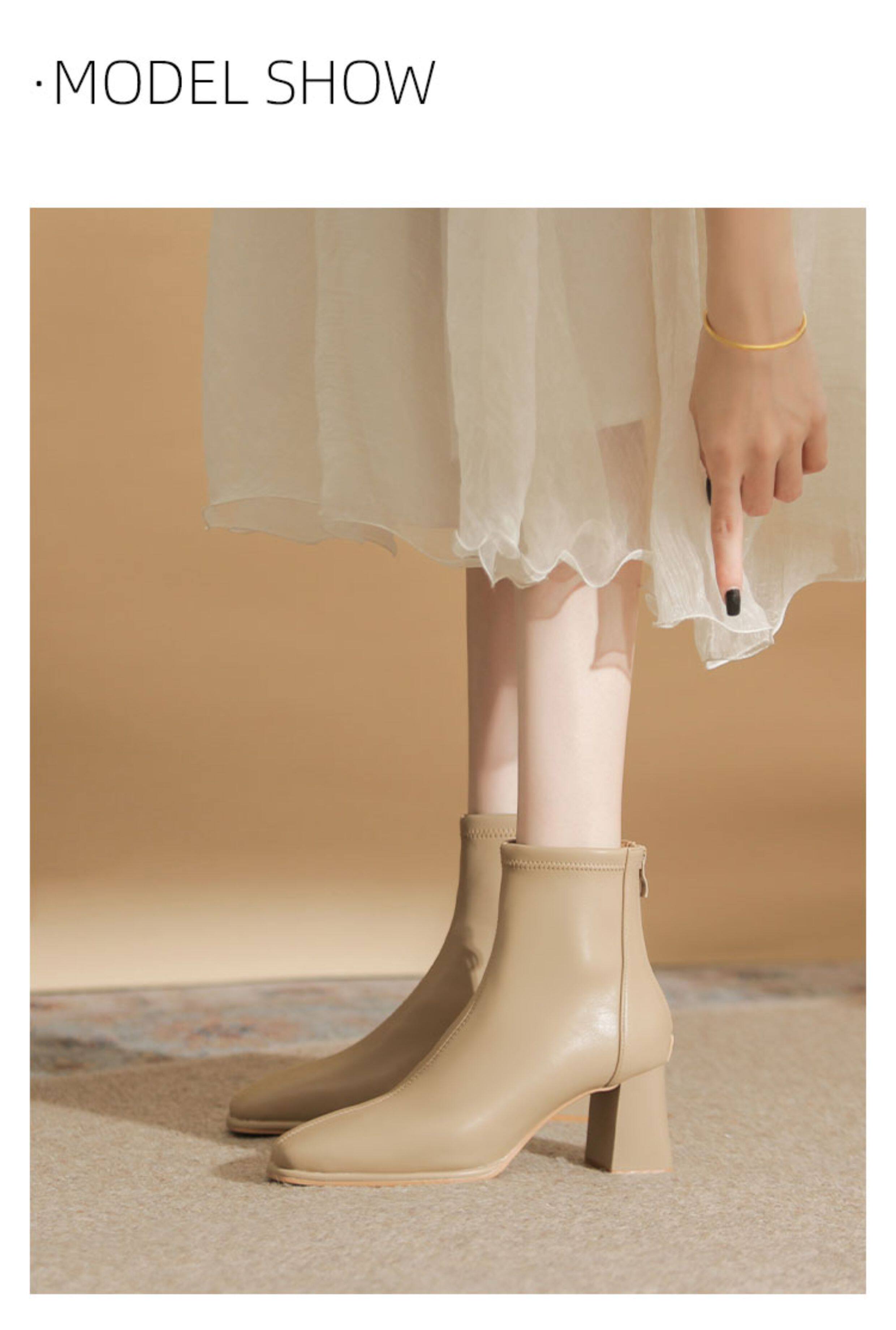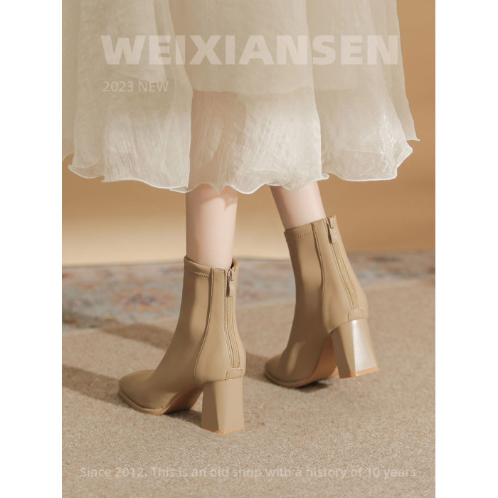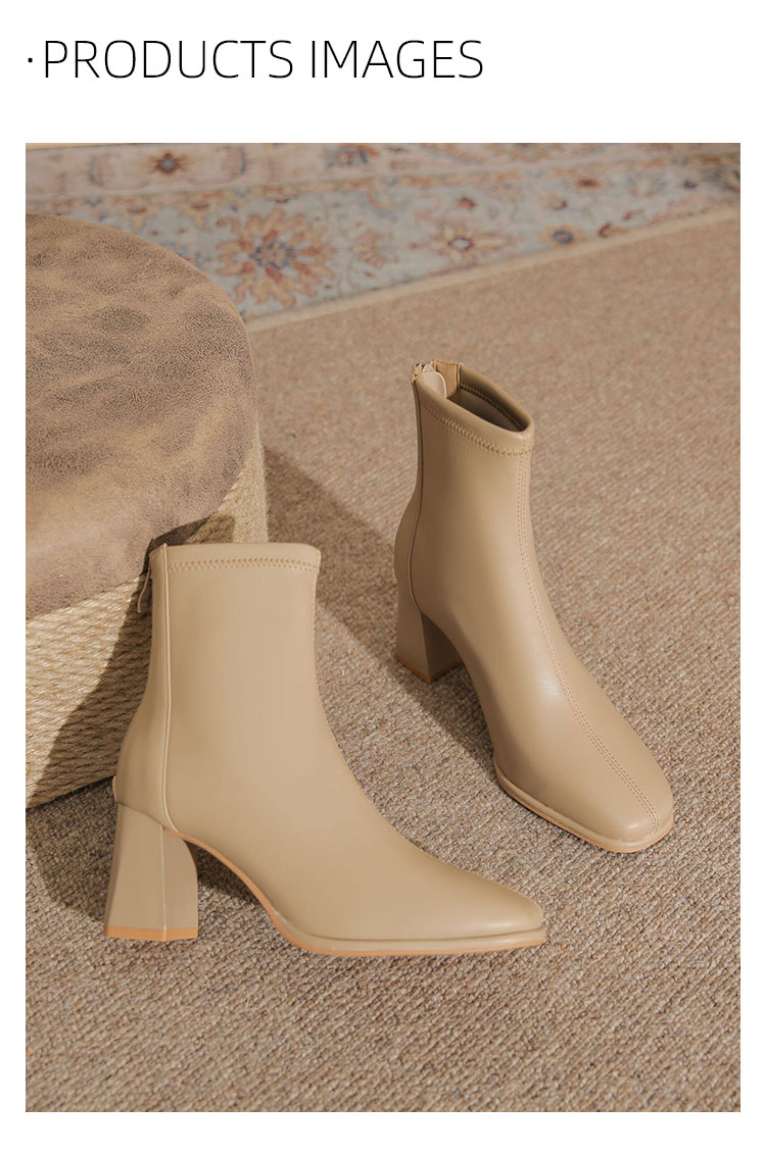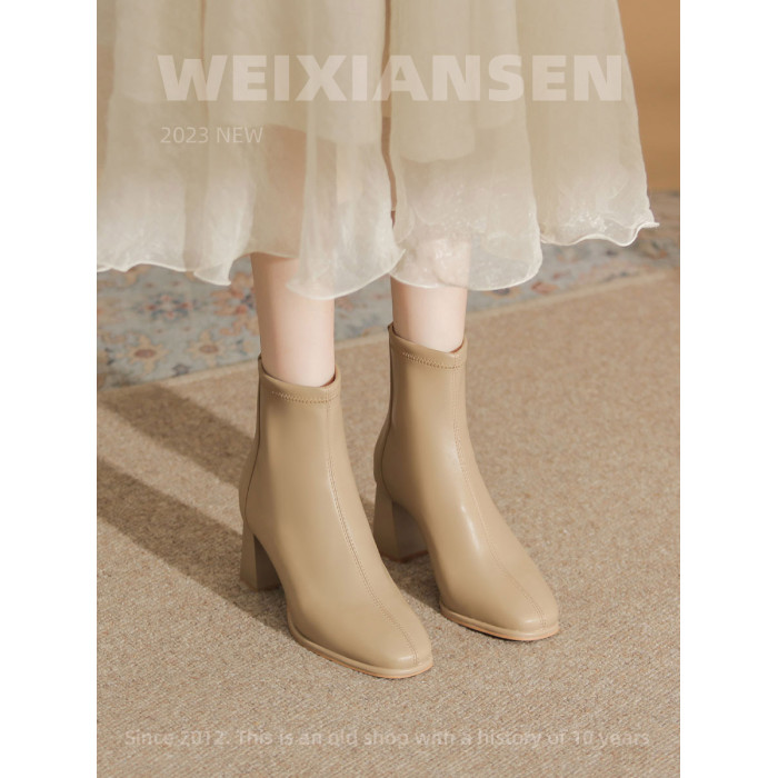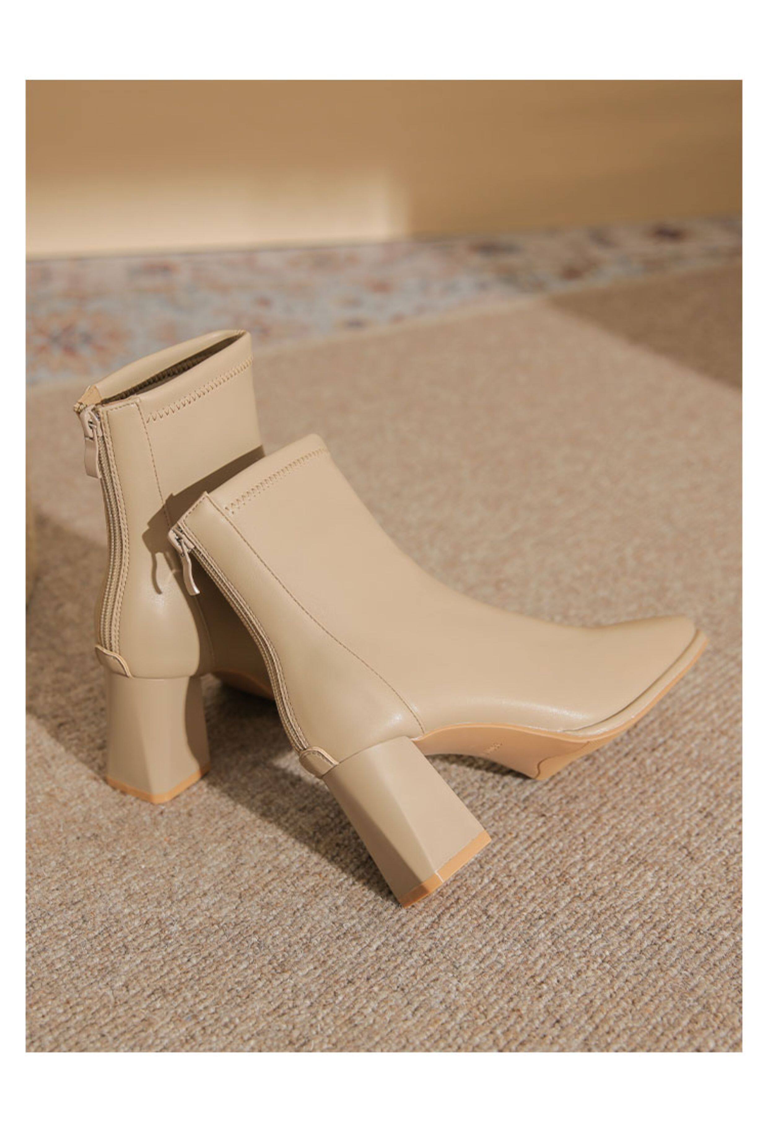 微先生美拉德風氣質高跟短靴女韓版瘦瘦靴女靴子女奶茶色粗跟短靴