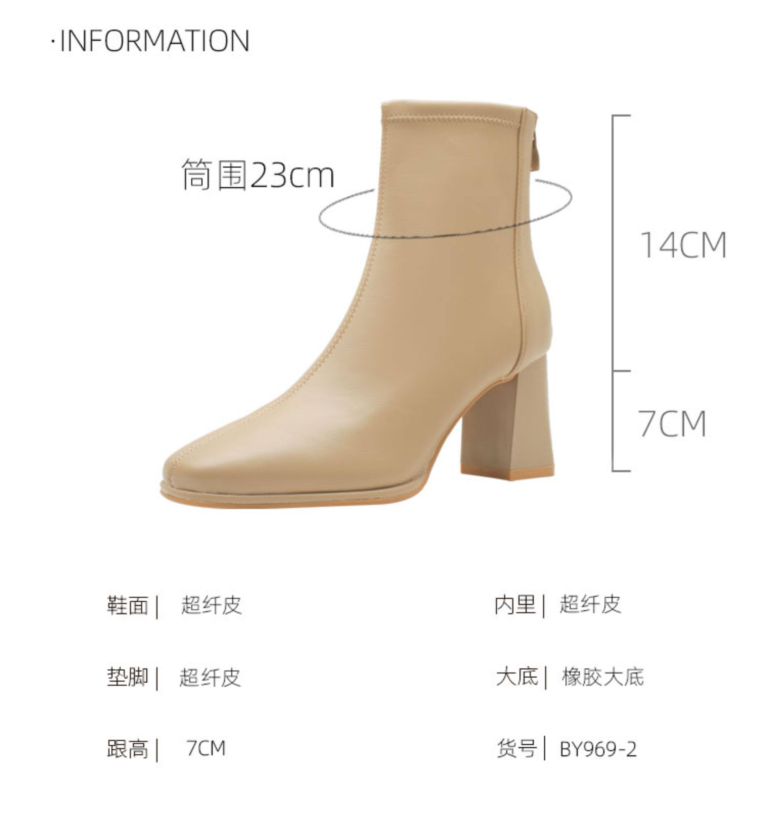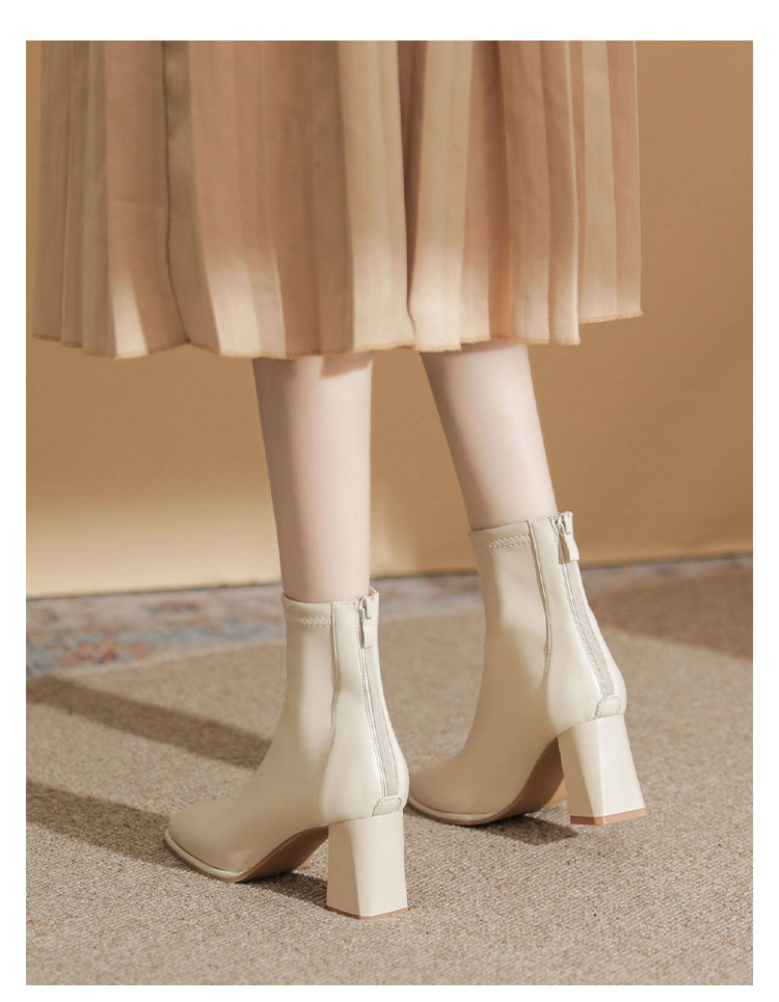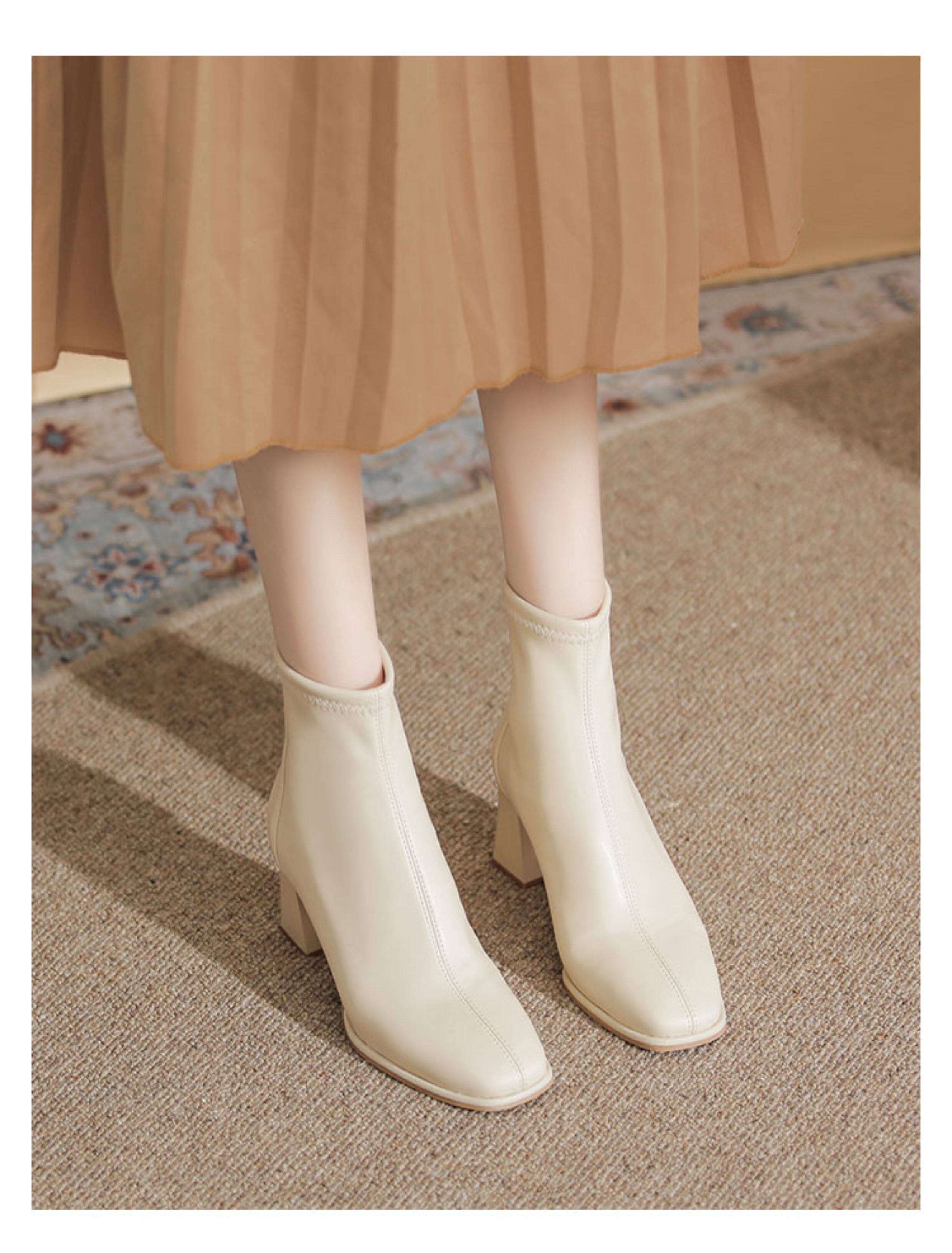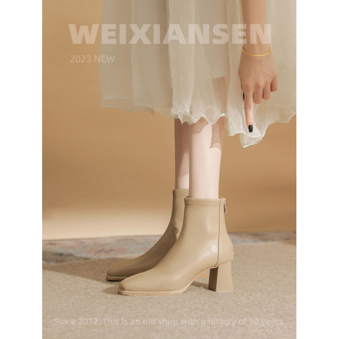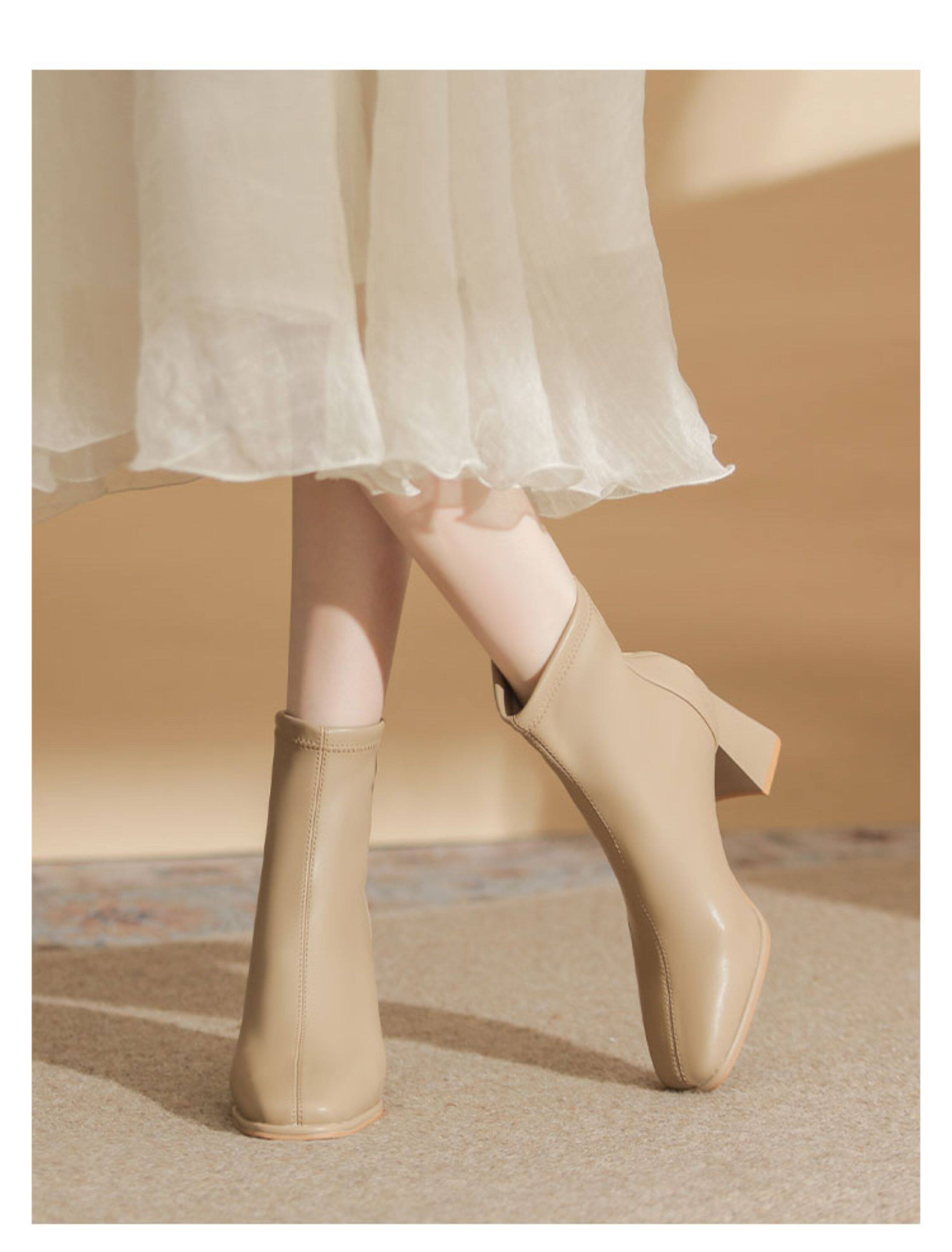 微先生美拉德風氣質高跟短靴女韓版瘦瘦靴女靴子女奶茶色粗跟短靴