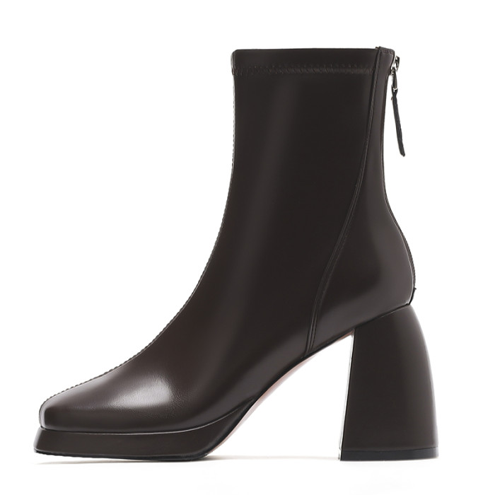 棕色高跟短靴女方頭粗跟馬丁靴女款2024新款秋冬防水台瘦瘦靴子女