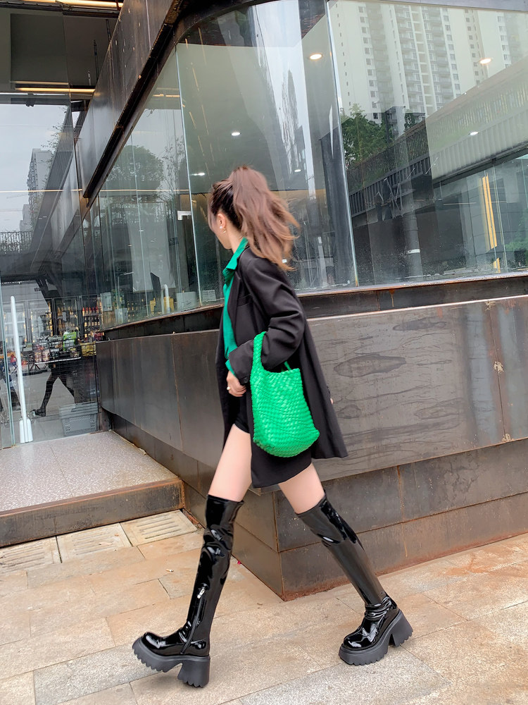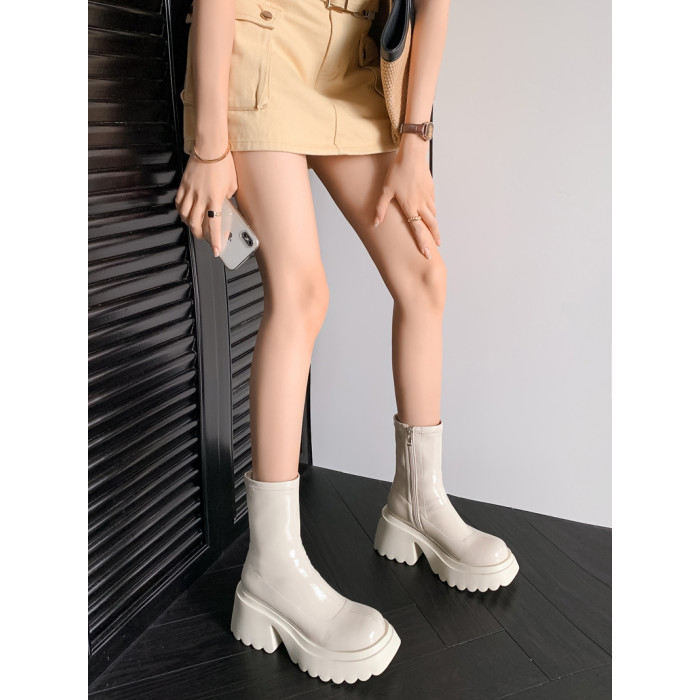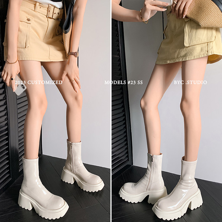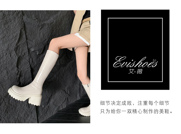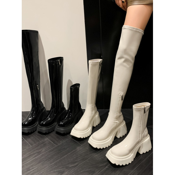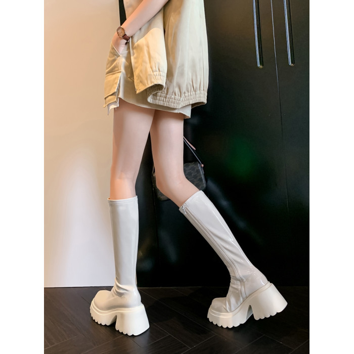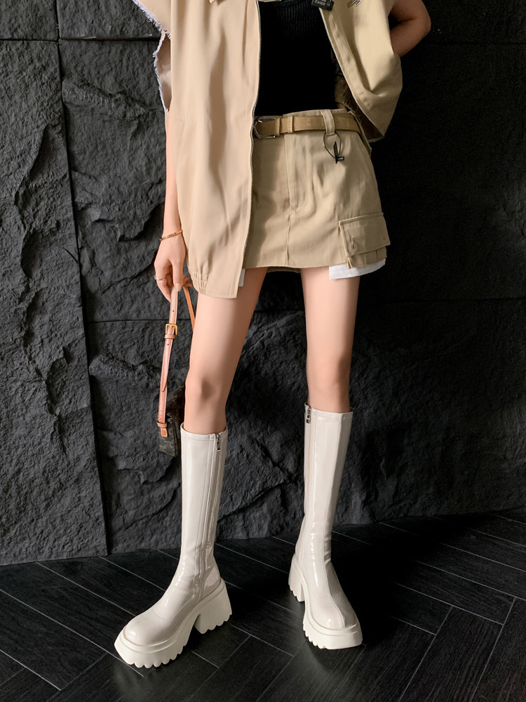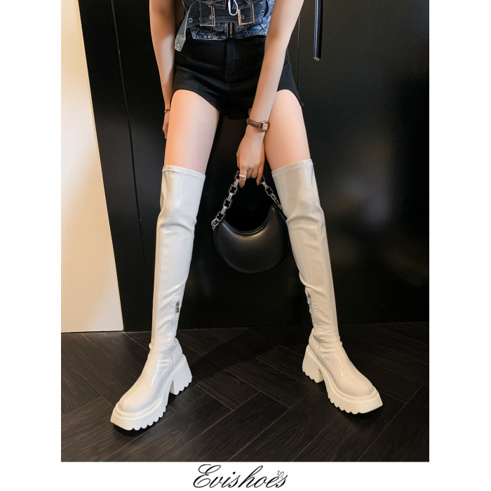 白色短靴彈力長靴子女小個子漆皮厚底高筒靴防水台過膝長筒騎士靴