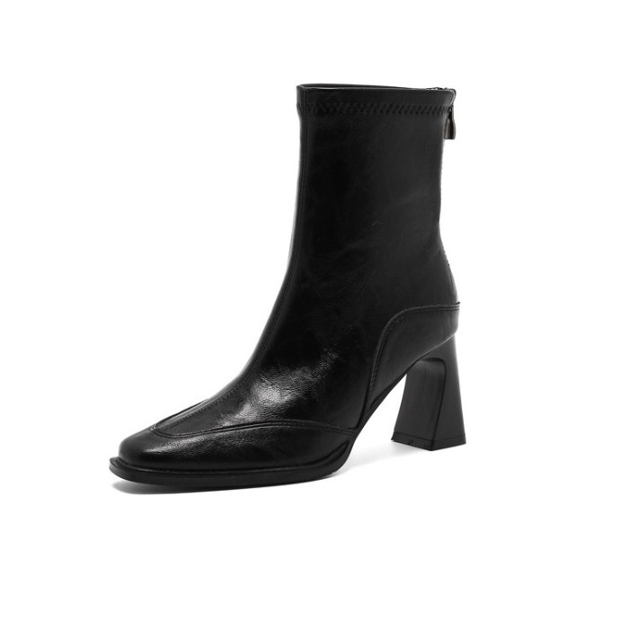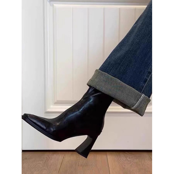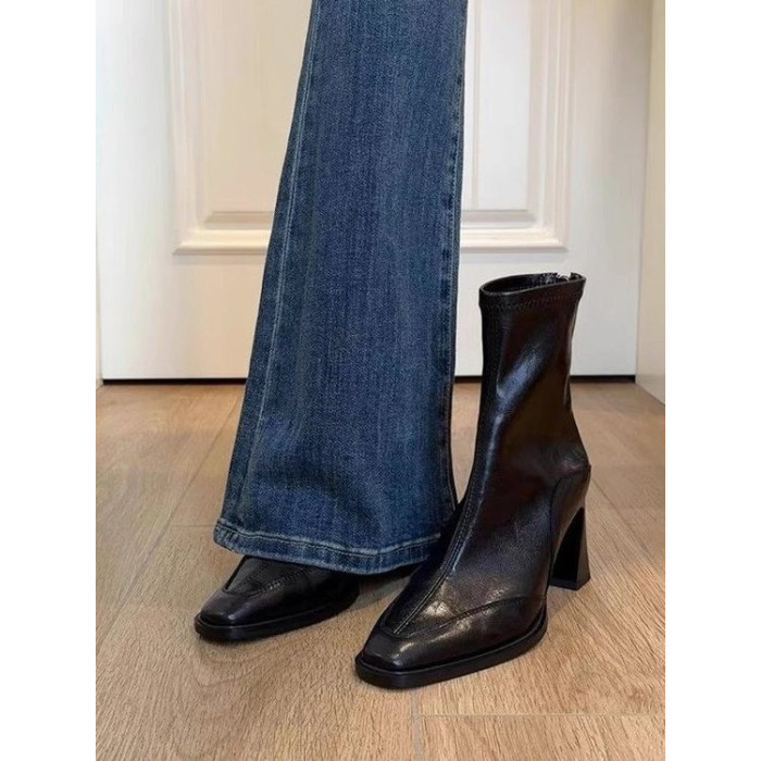 羊皮版高跟短靴女2025秋冬新款黑色法式粗跟彈力瘦瘦靴馬丁靴子女