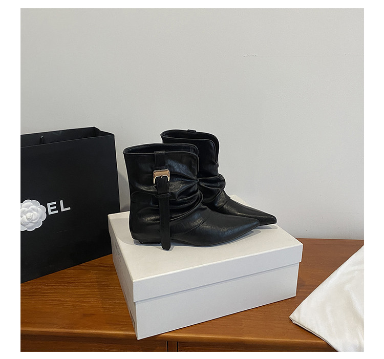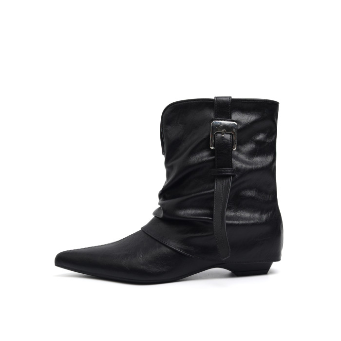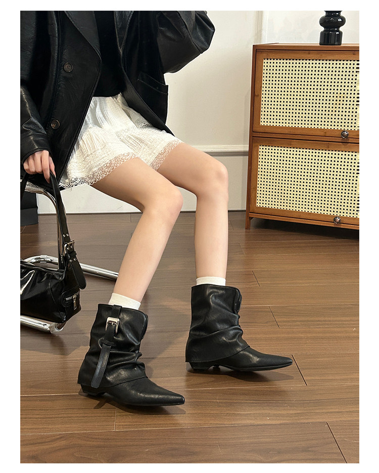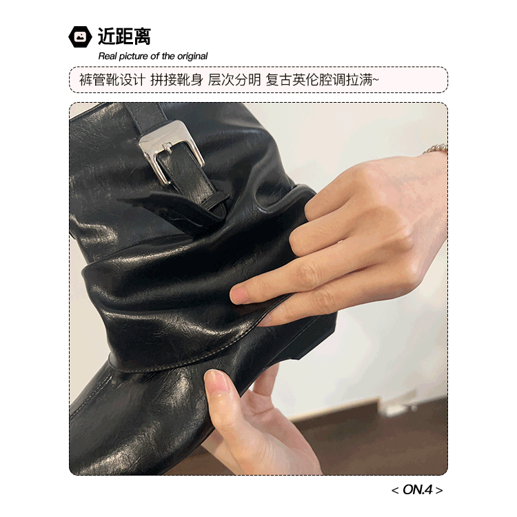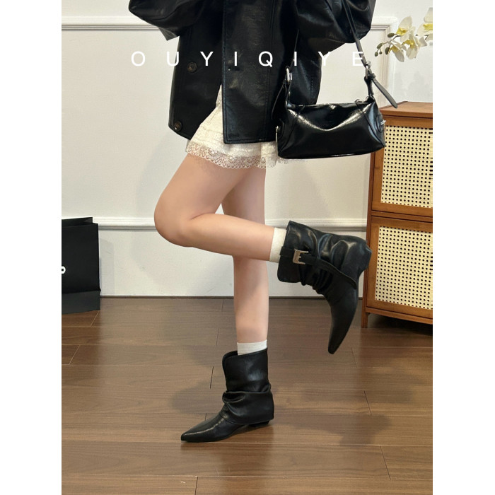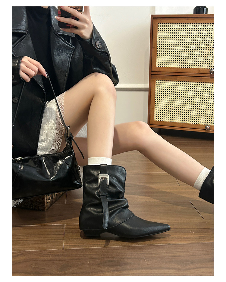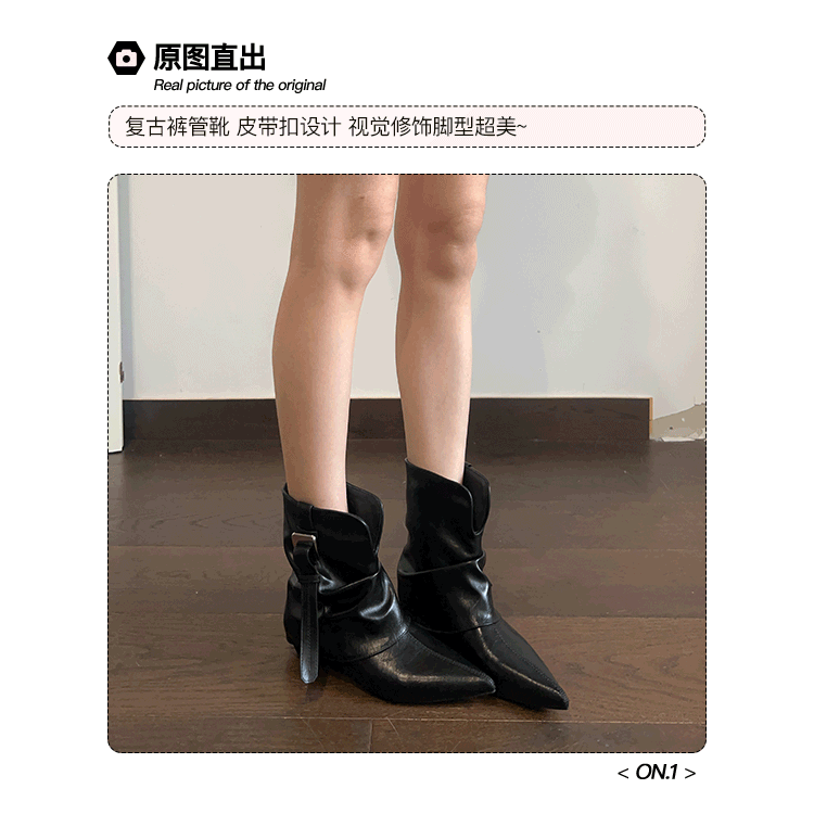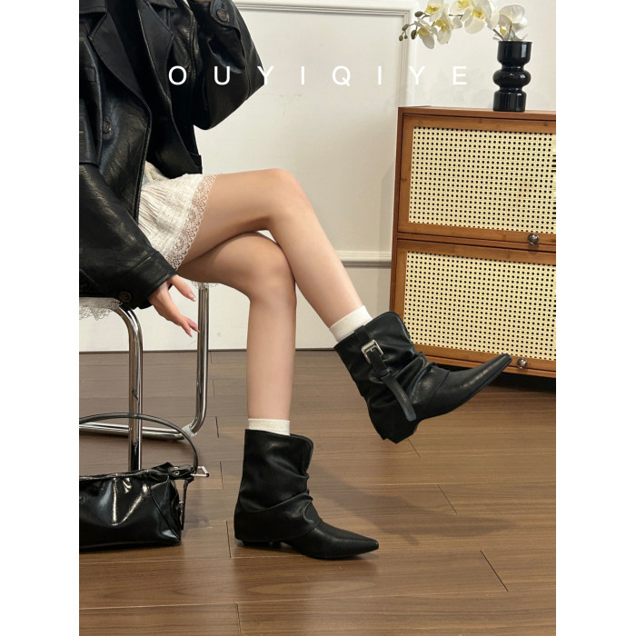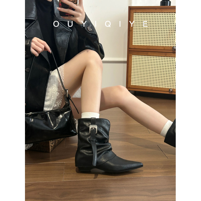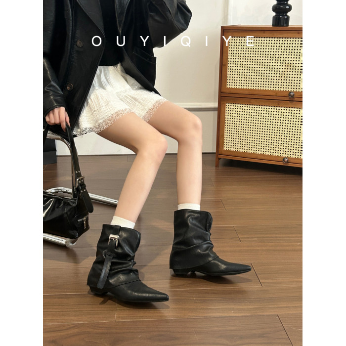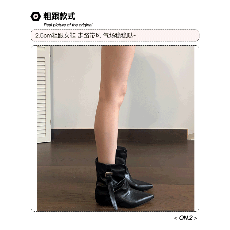 牛皮版~復古尖頭西部短靴女秋冬皮帶釦設計感小衆粗跟辣妹褲琯靴