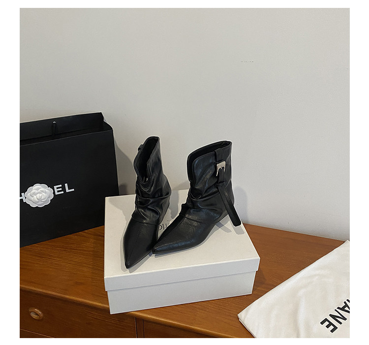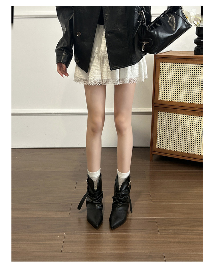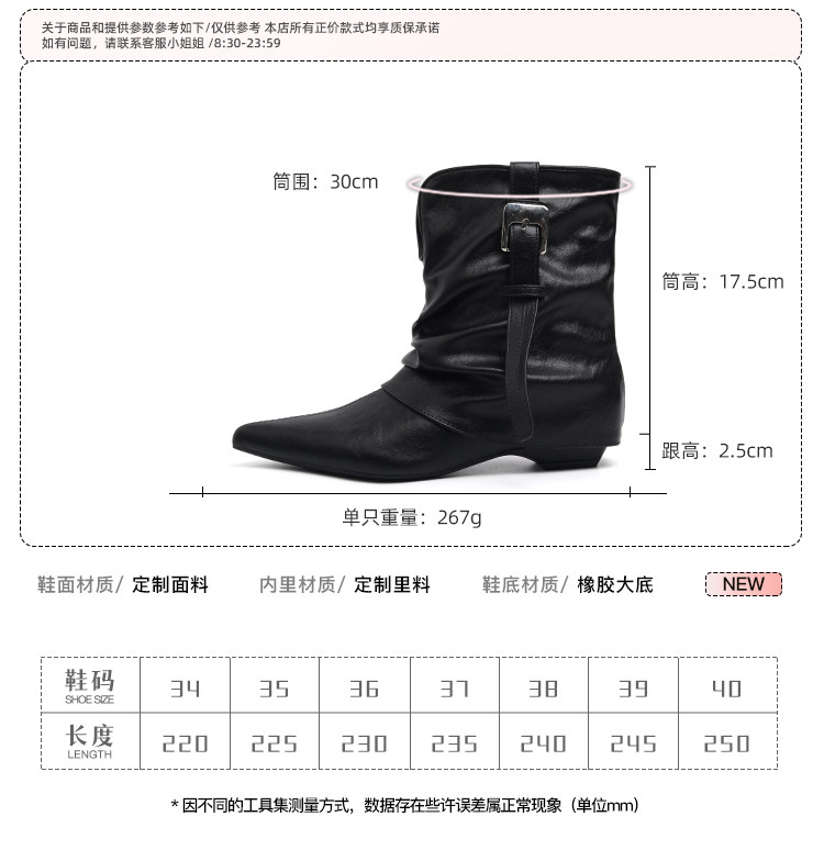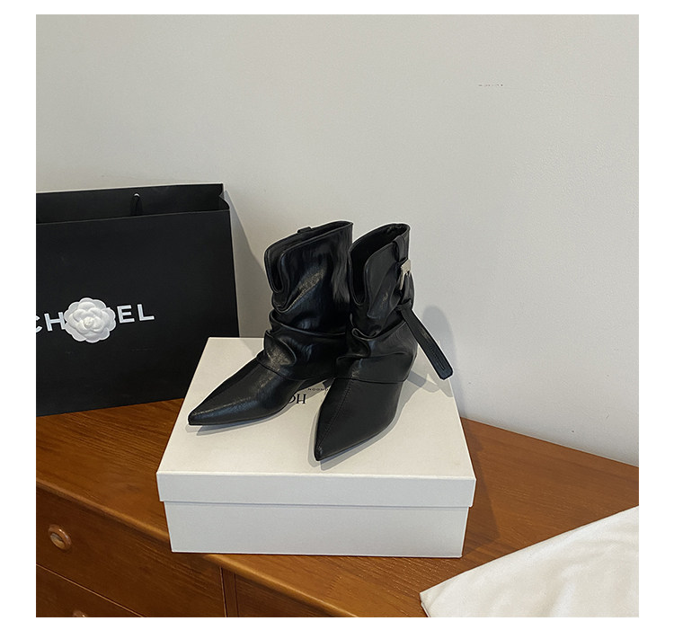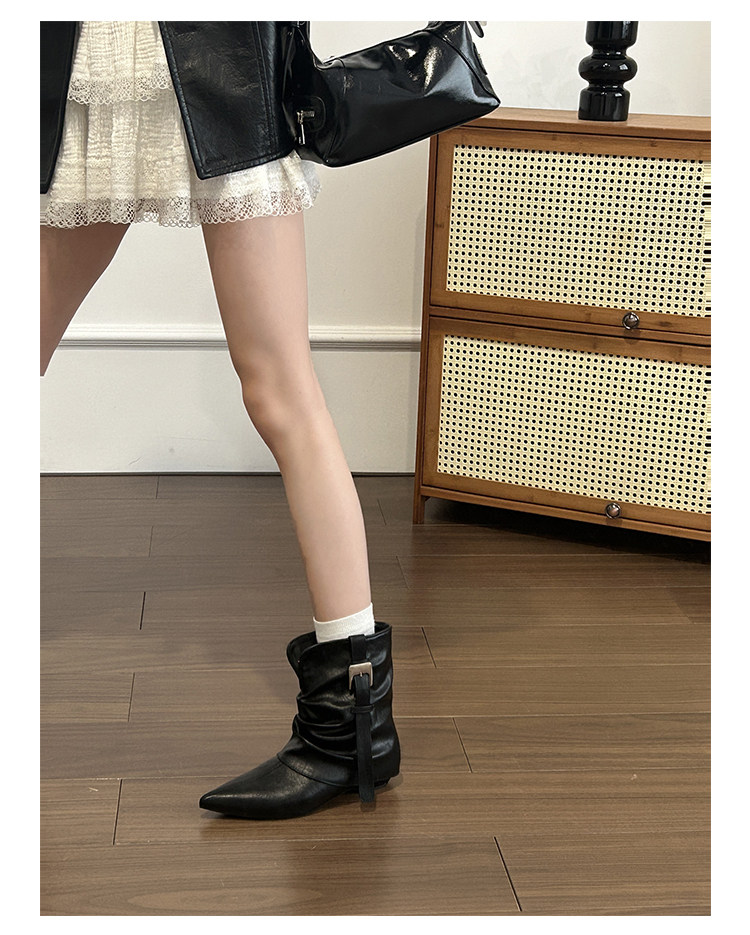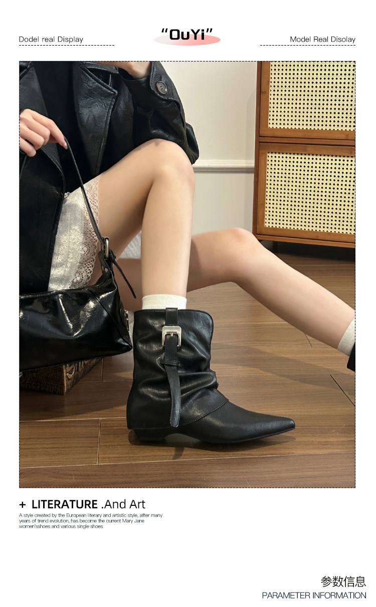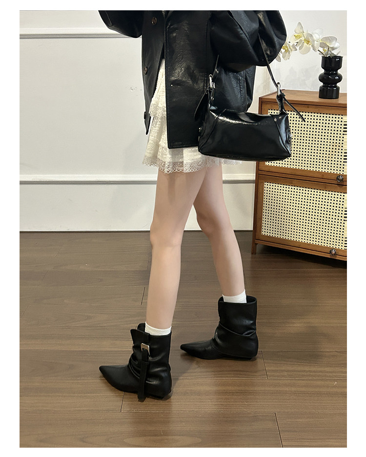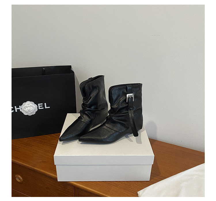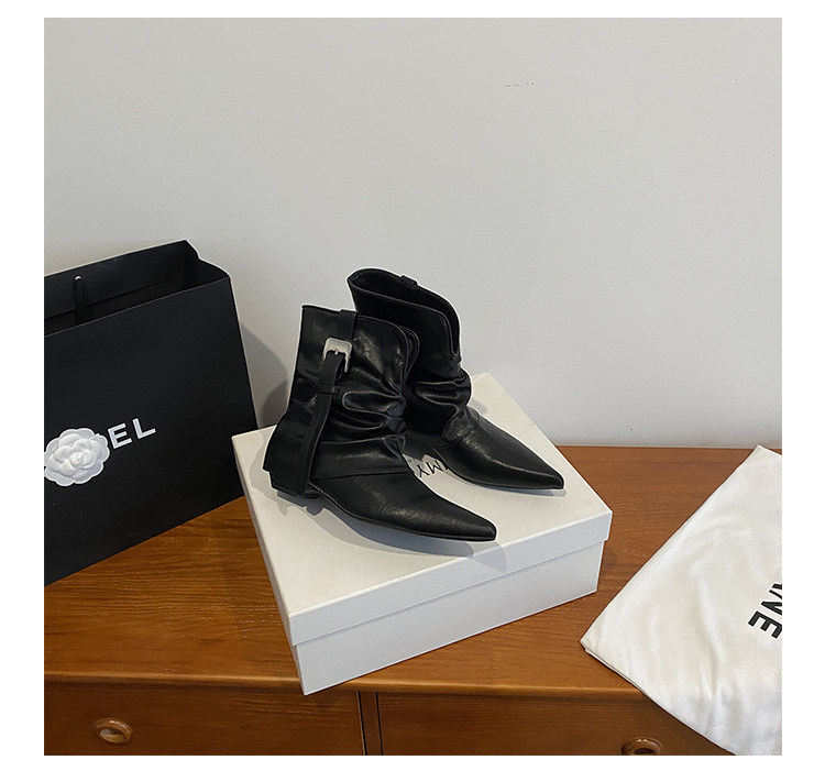 牛皮版~復古尖頭西部短靴女秋冬皮帶釦設計感小衆粗跟辣妹褲琯靴