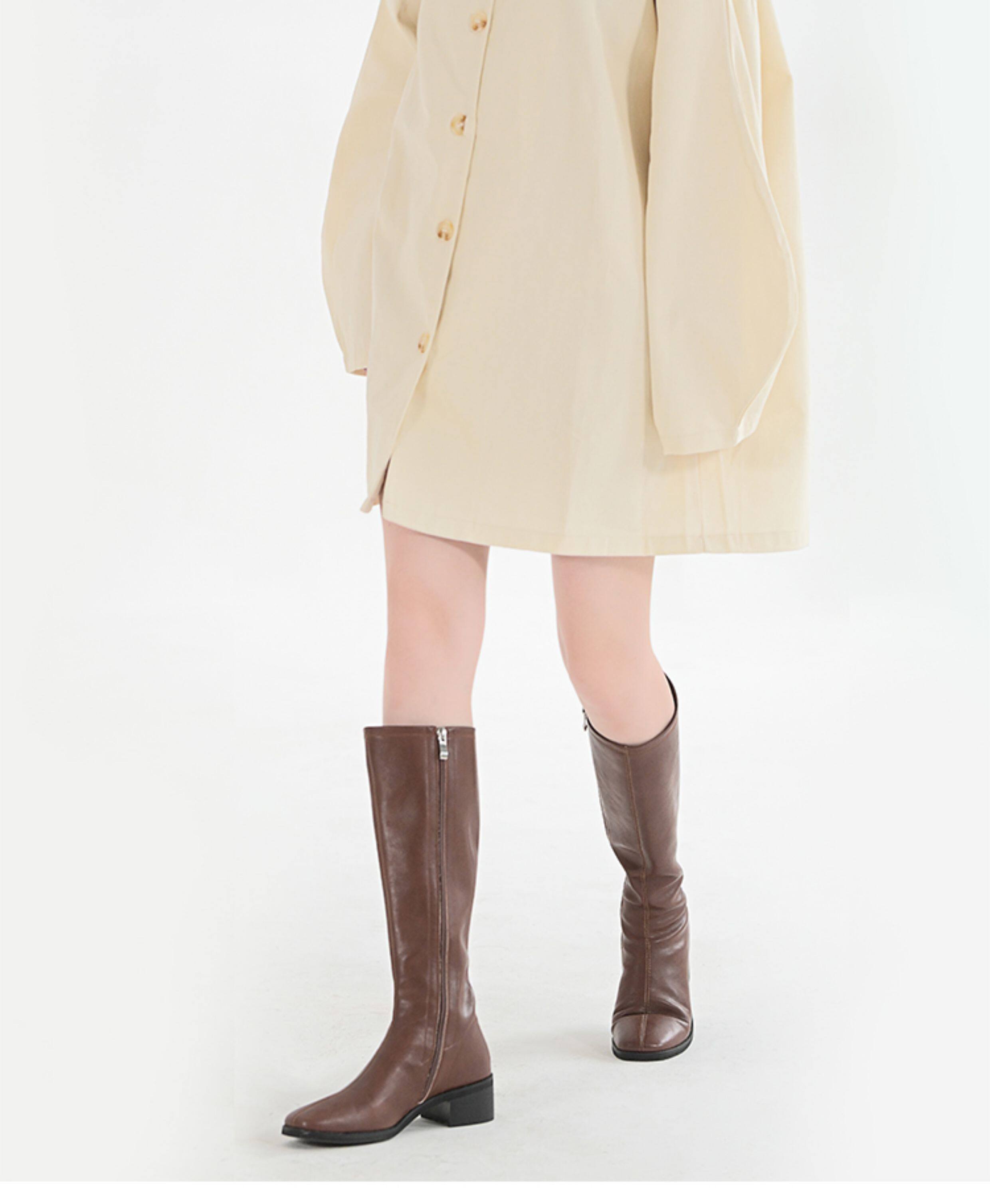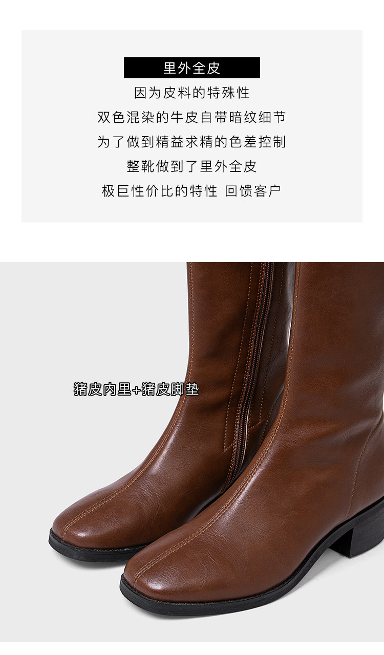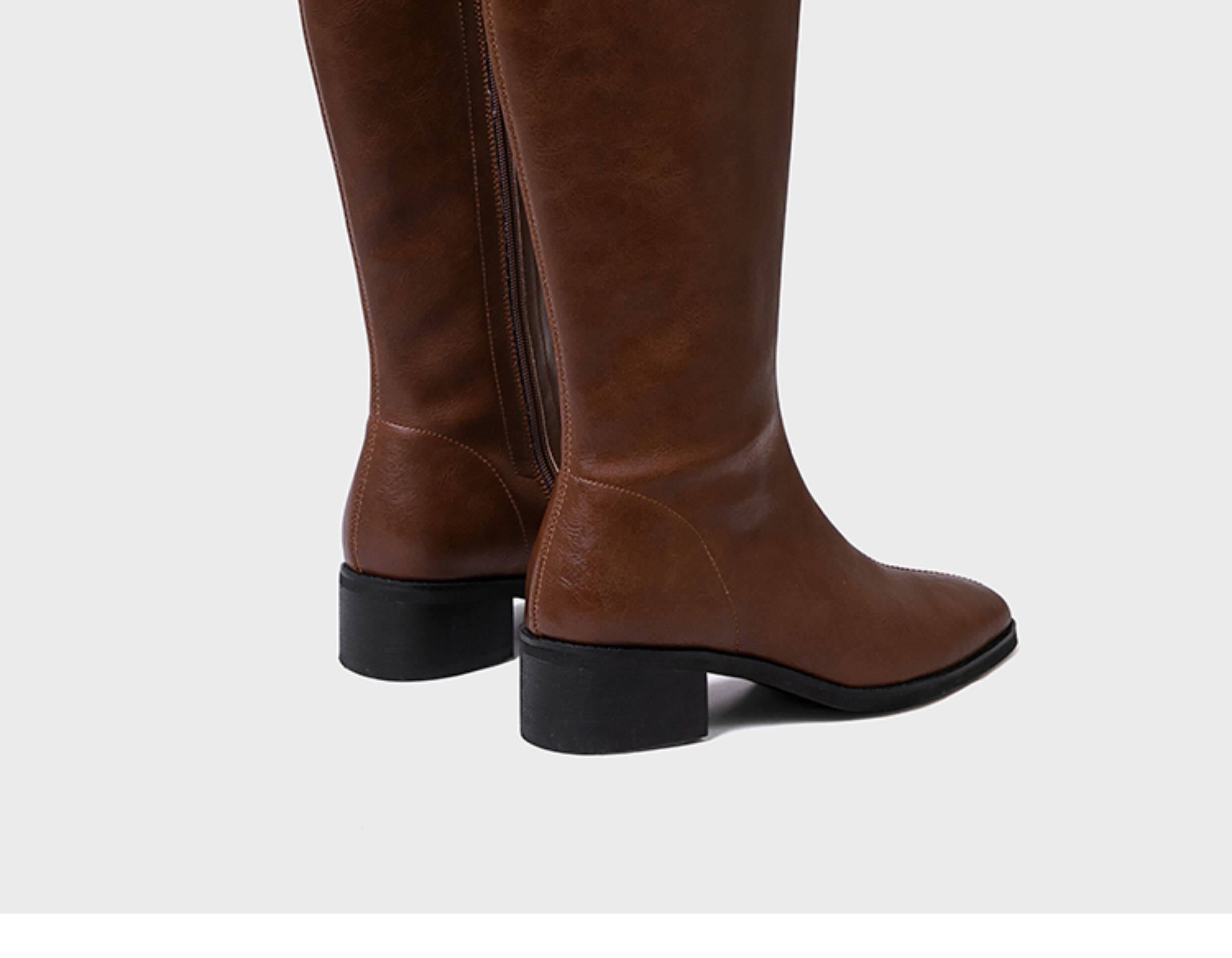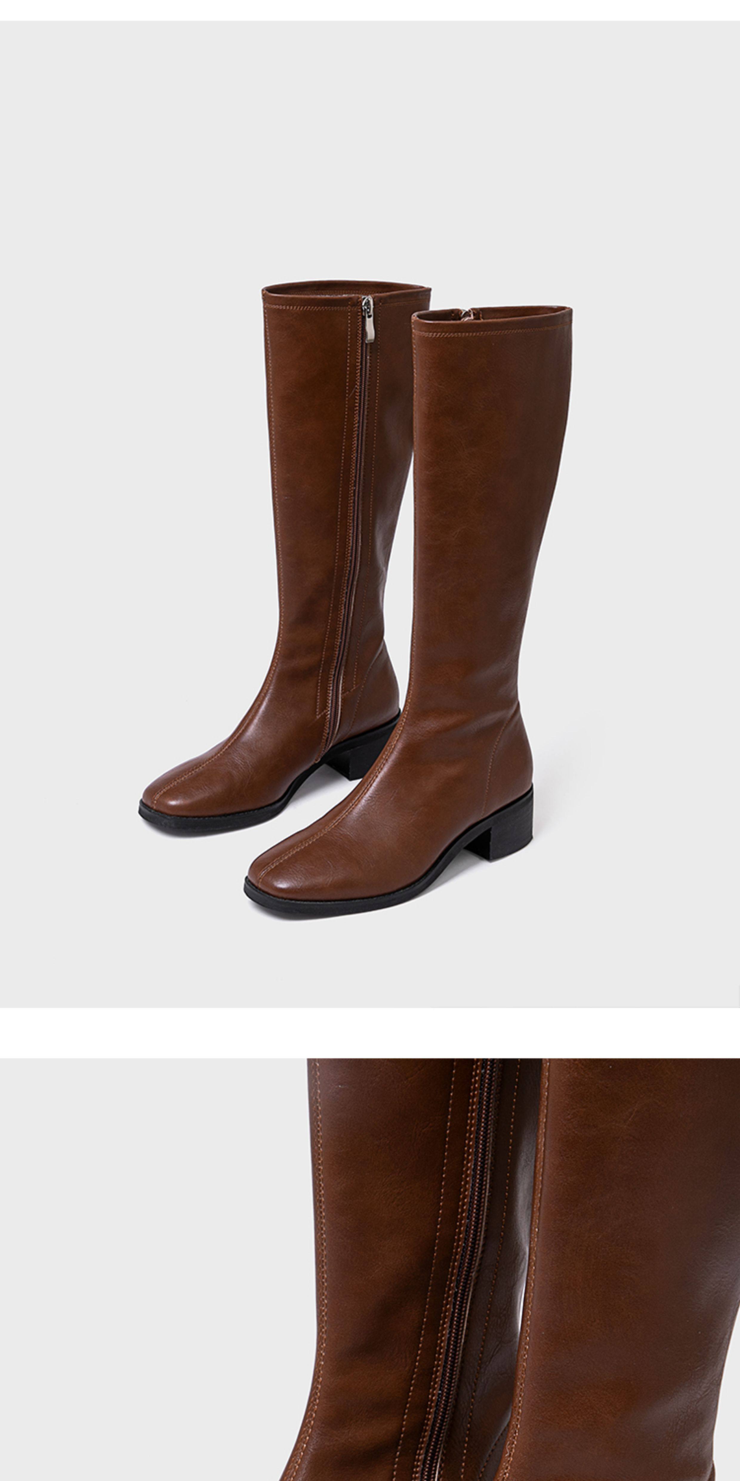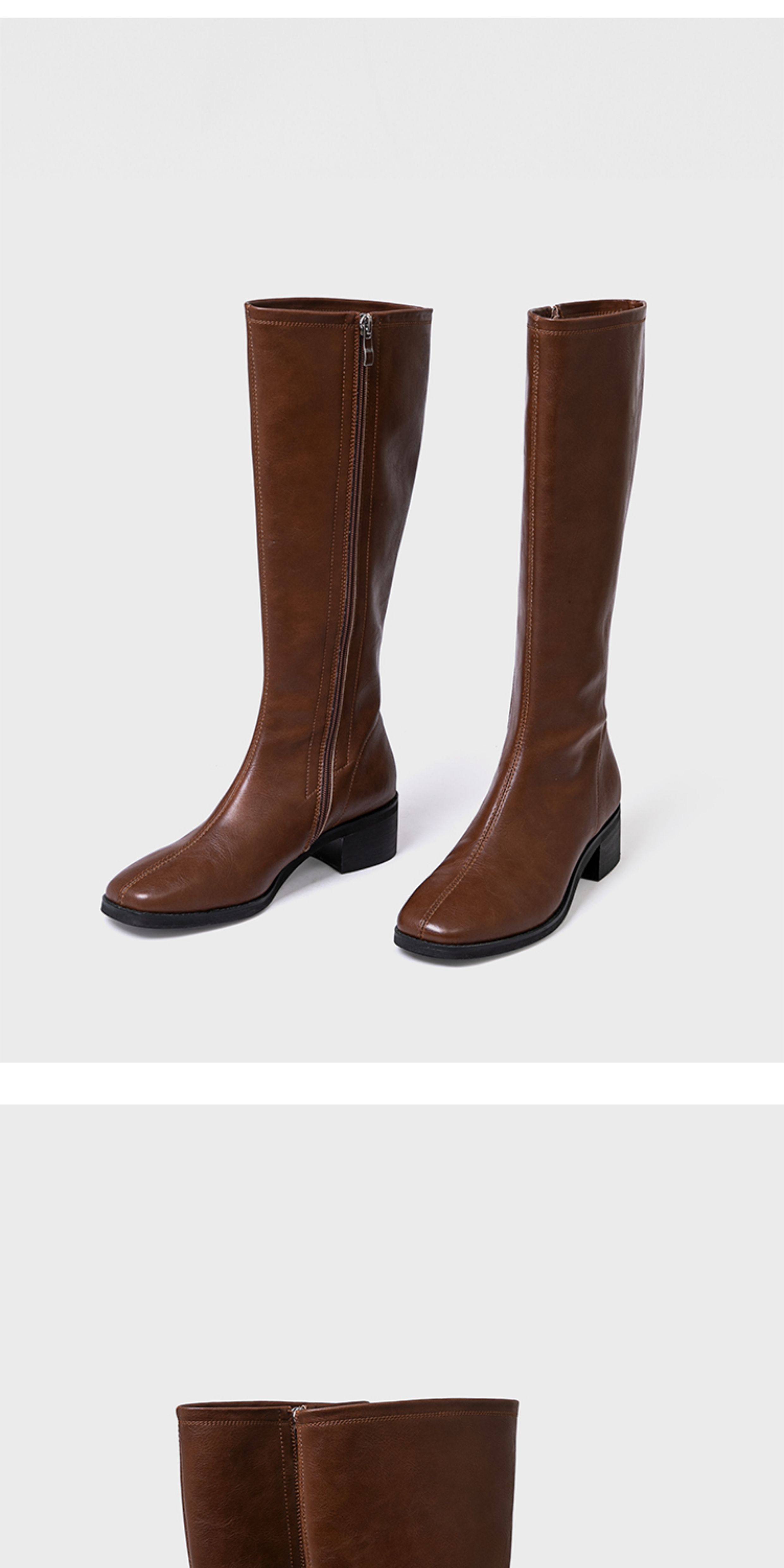 ST三人行 焦糖甜棕|真皮長靴中跟不過膝靴牛皮方頭粗跟高筒騎士靴