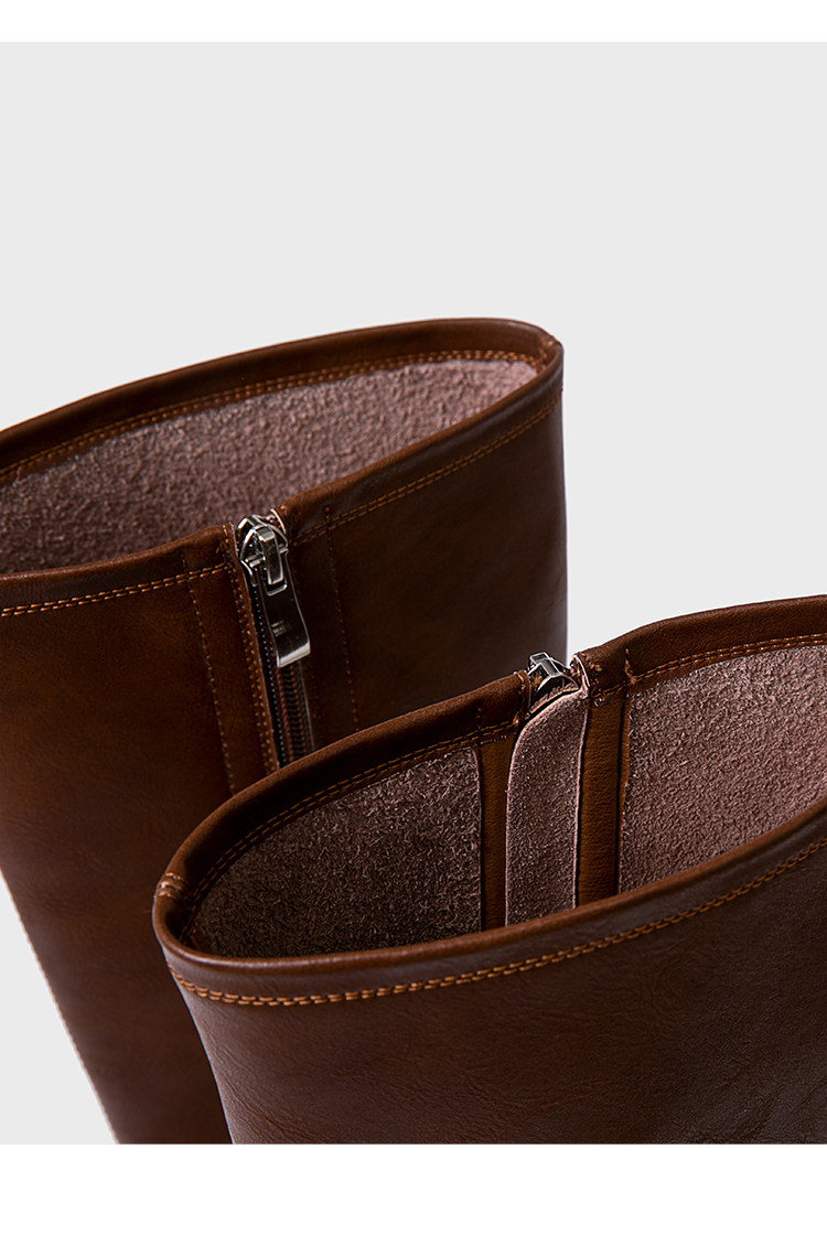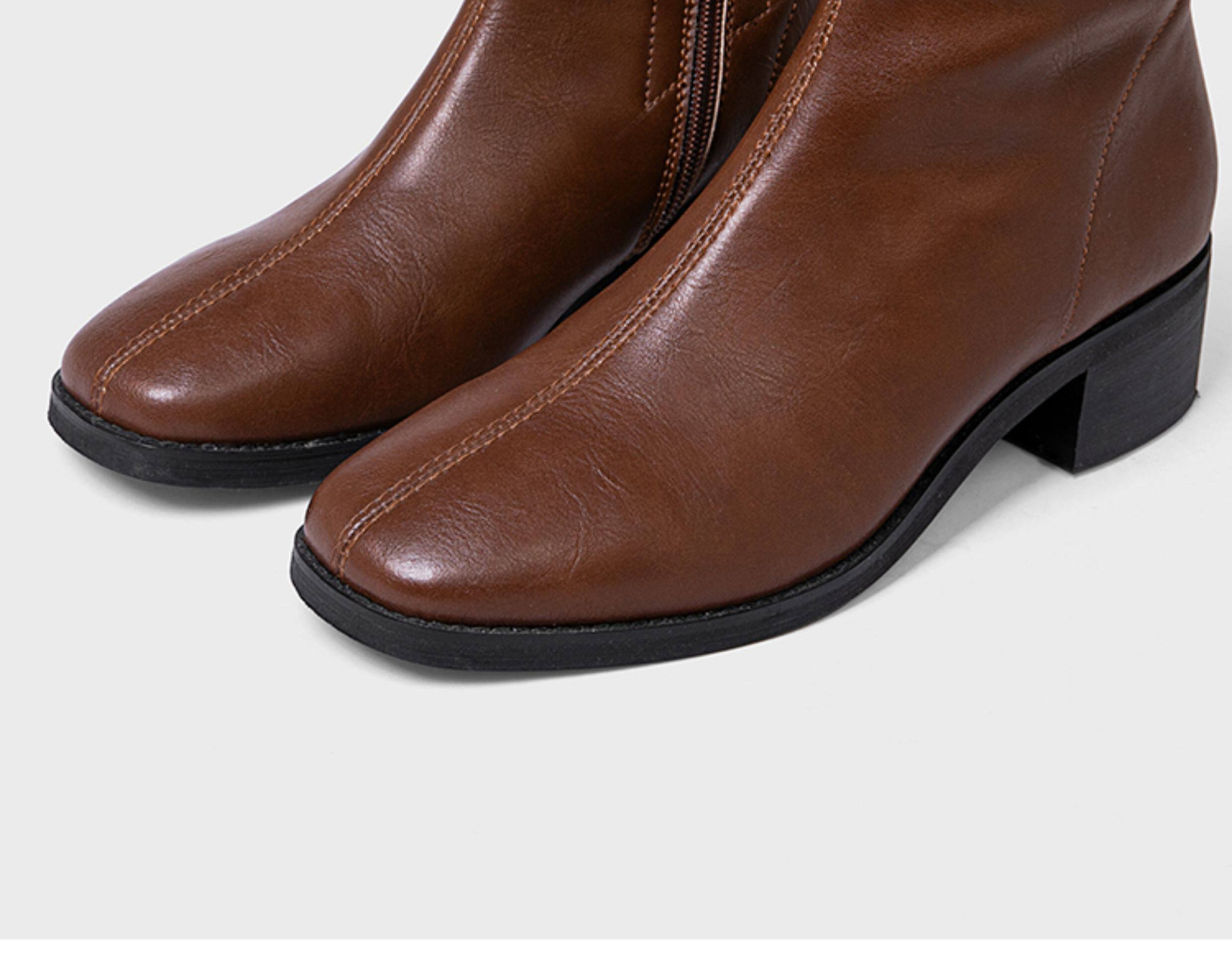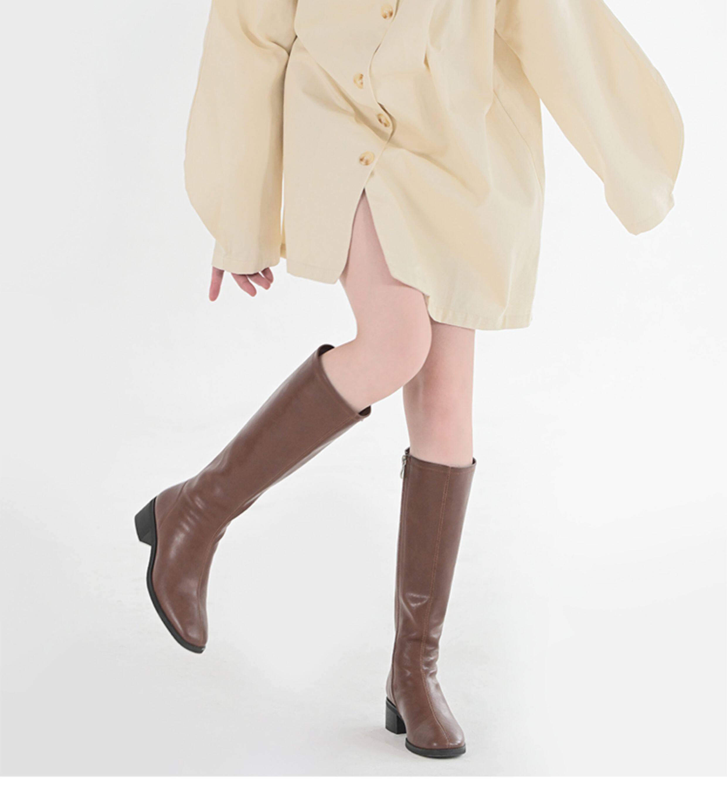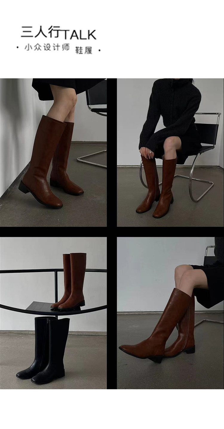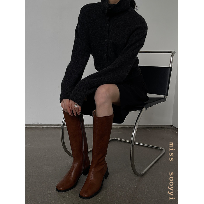ST三人行 焦糖甜棕|真皮長靴中跟不過膝靴牛皮方頭粗跟高筒騎士靴