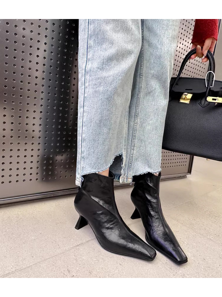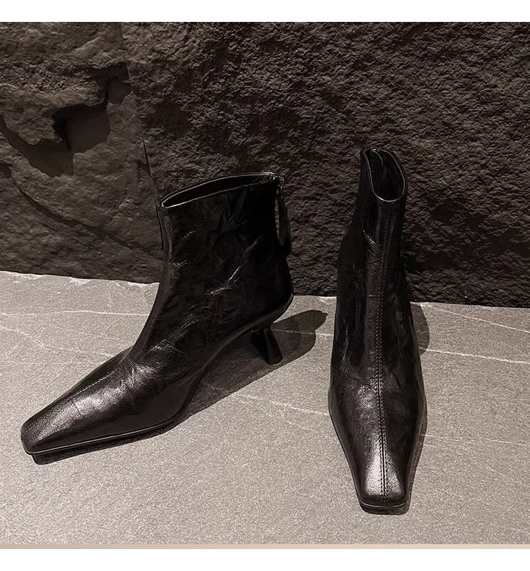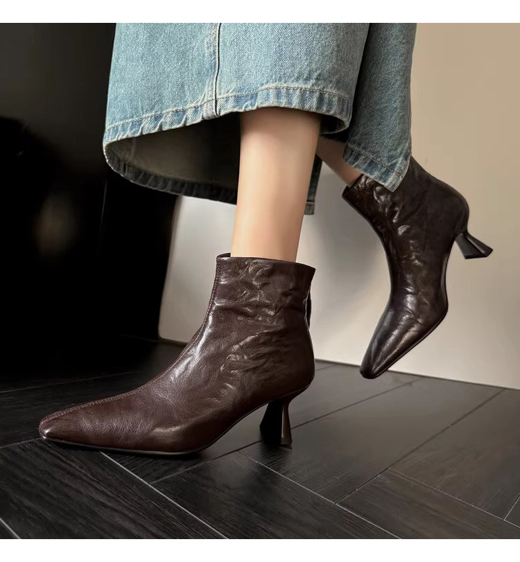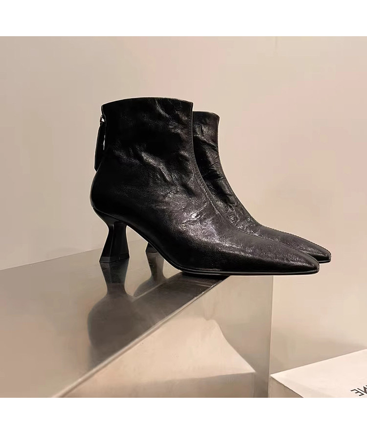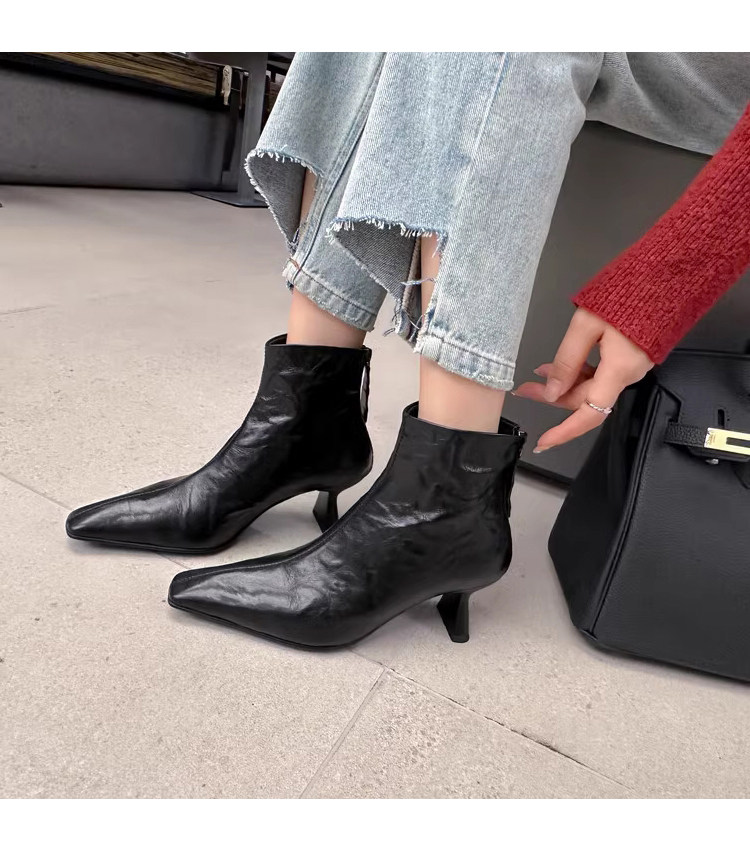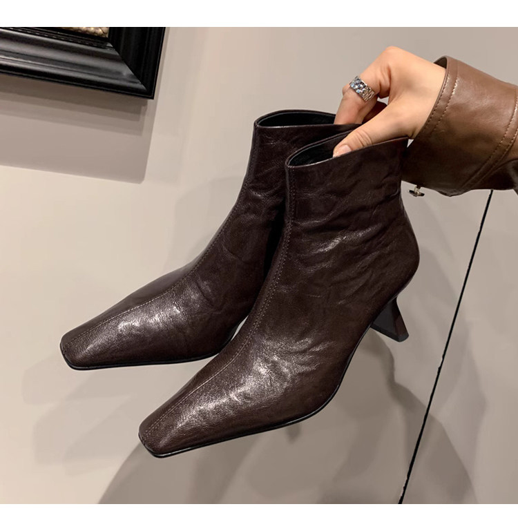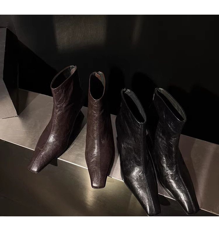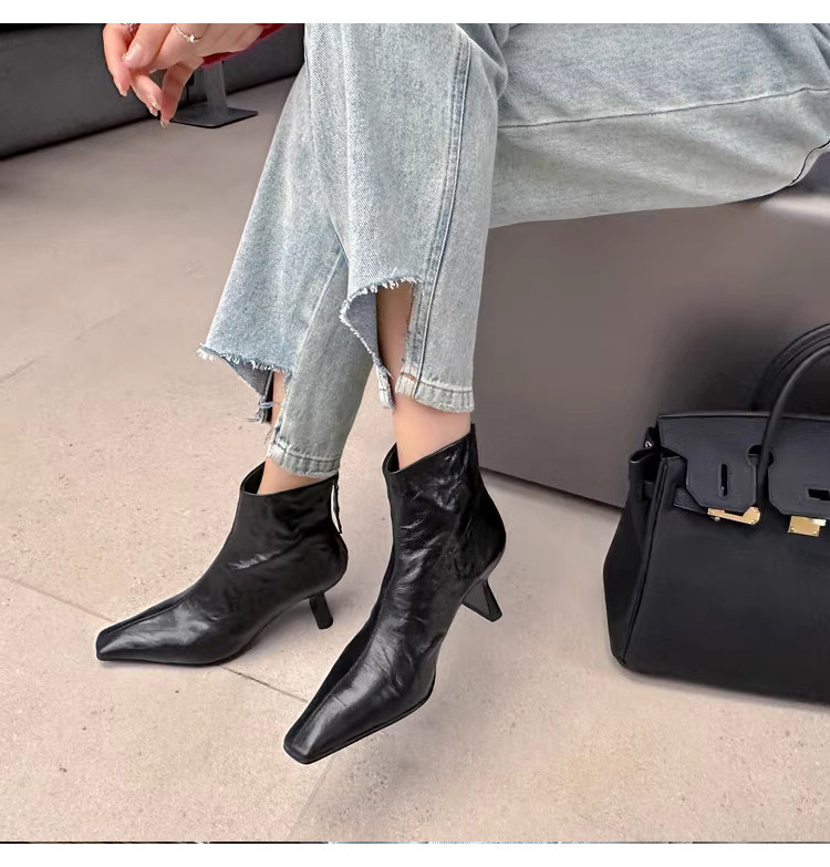 牛皮版~秋冬新款褶皺方頭瘦瘦靴細跟高跟真皮裸靴後拉鍊短靴女