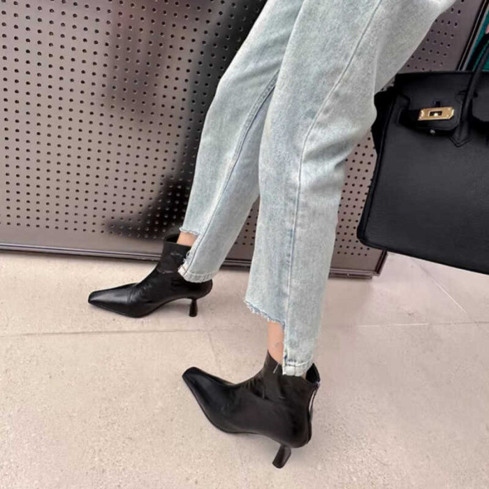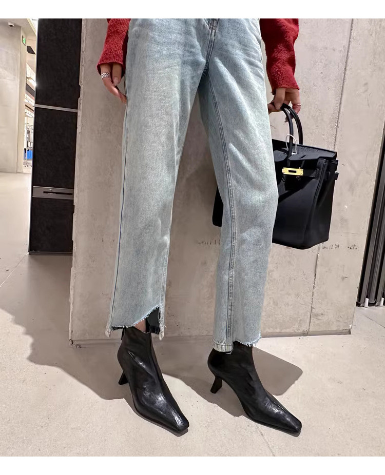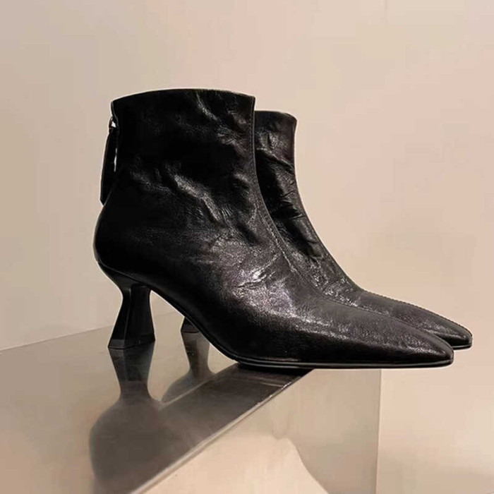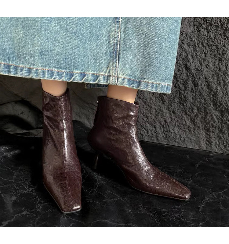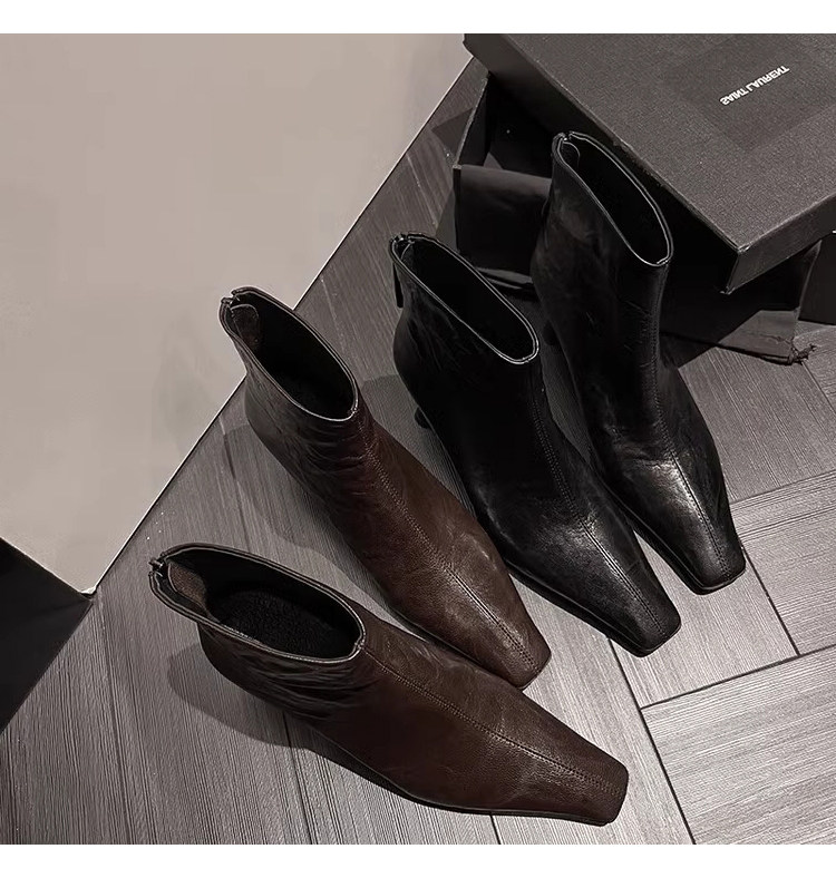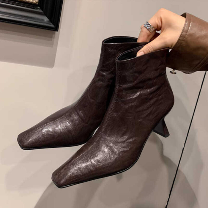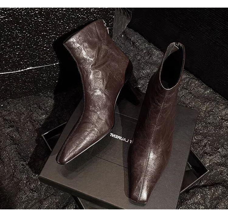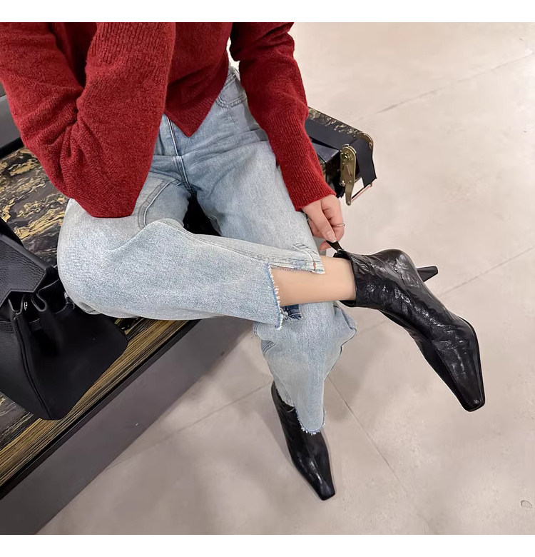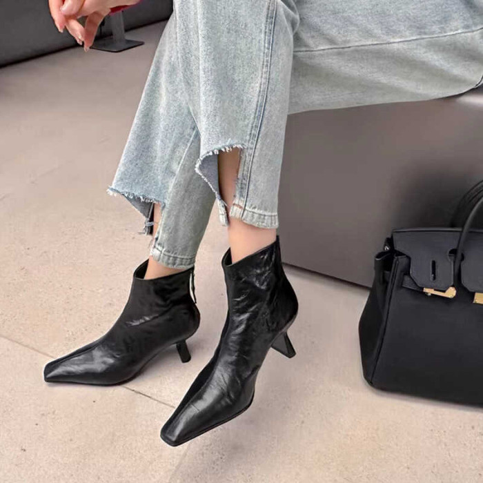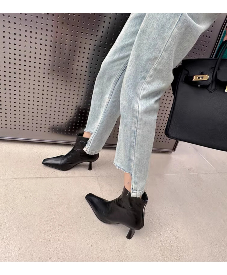 牛皮版~秋冬新款褶皺方頭瘦瘦靴細跟高跟真皮裸靴後拉鍊短靴女