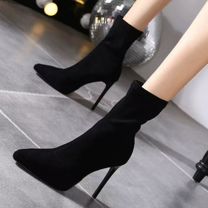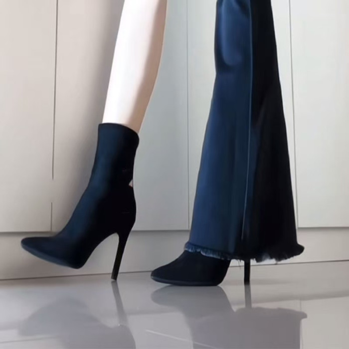 2025秋季新款高跟長筒靴過膝長靴女瘦瘦靴粗跟絨面高筒彈力靴尖頭