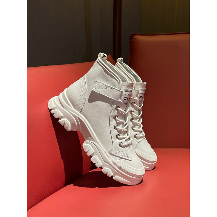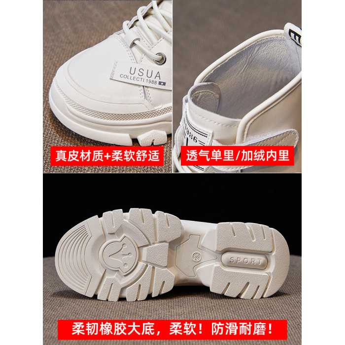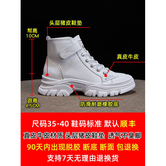 真皮白色中幫運動鞋女平底短靴2026春秋新款女鞋高幫休閒馬丁靴子