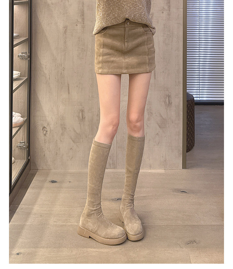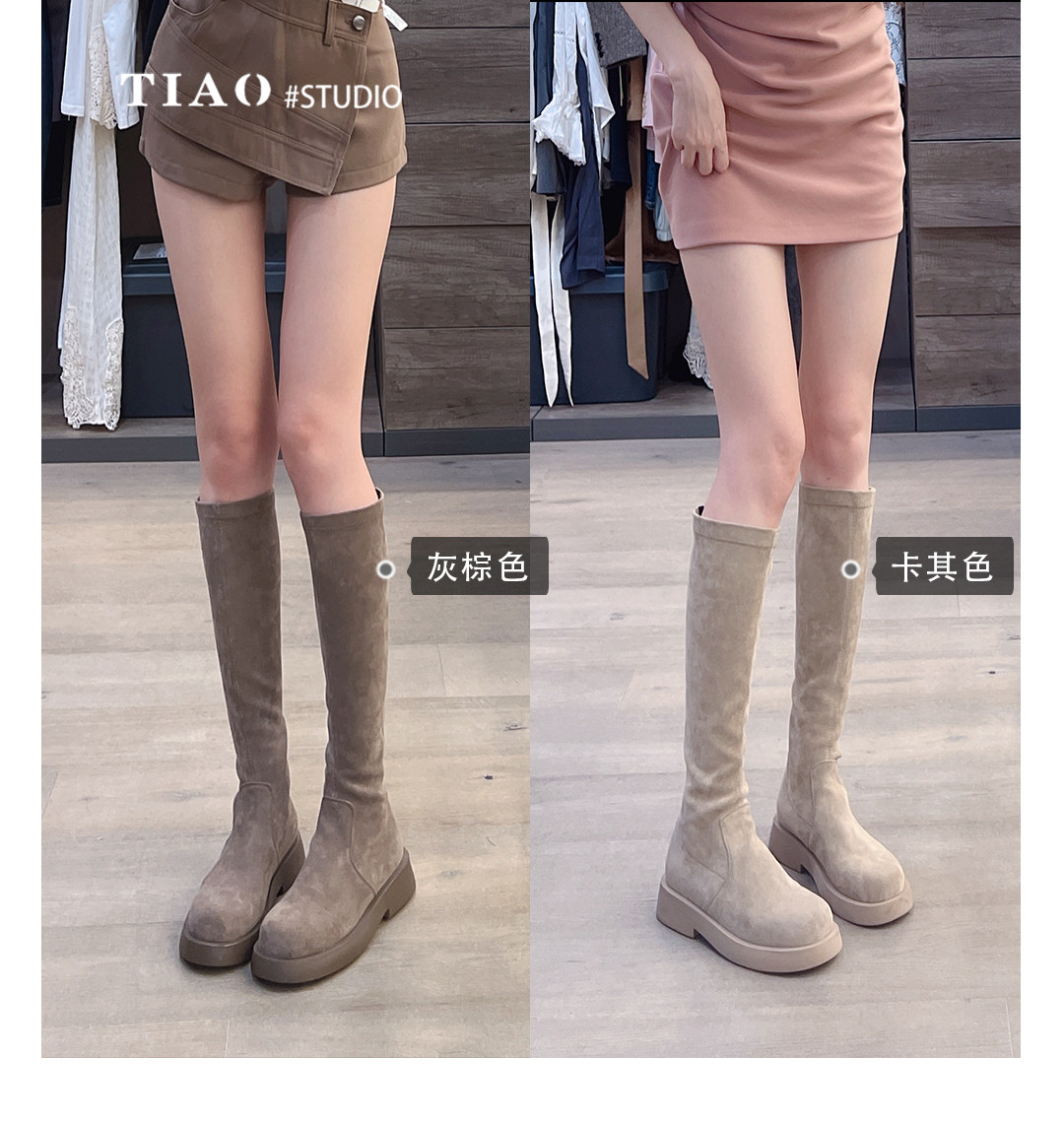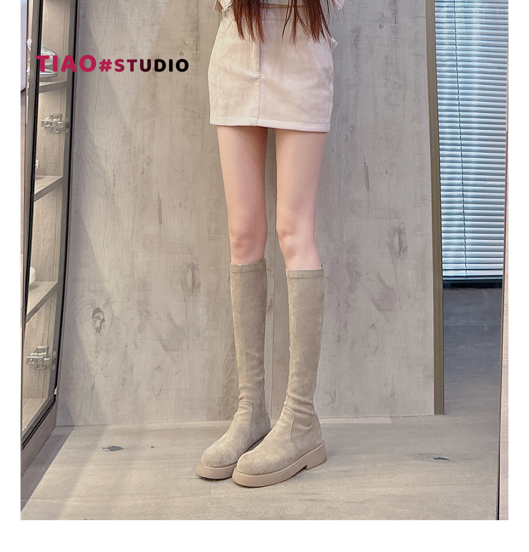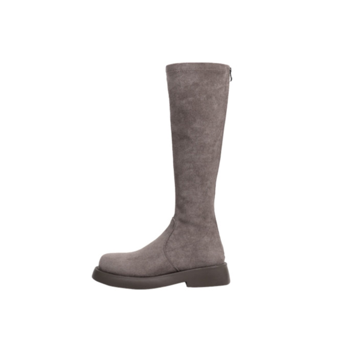 混凝草後拉鍊顯瘦長靴子女中筒春夏平底騎士靴厚底不過膝瘦瘦靴