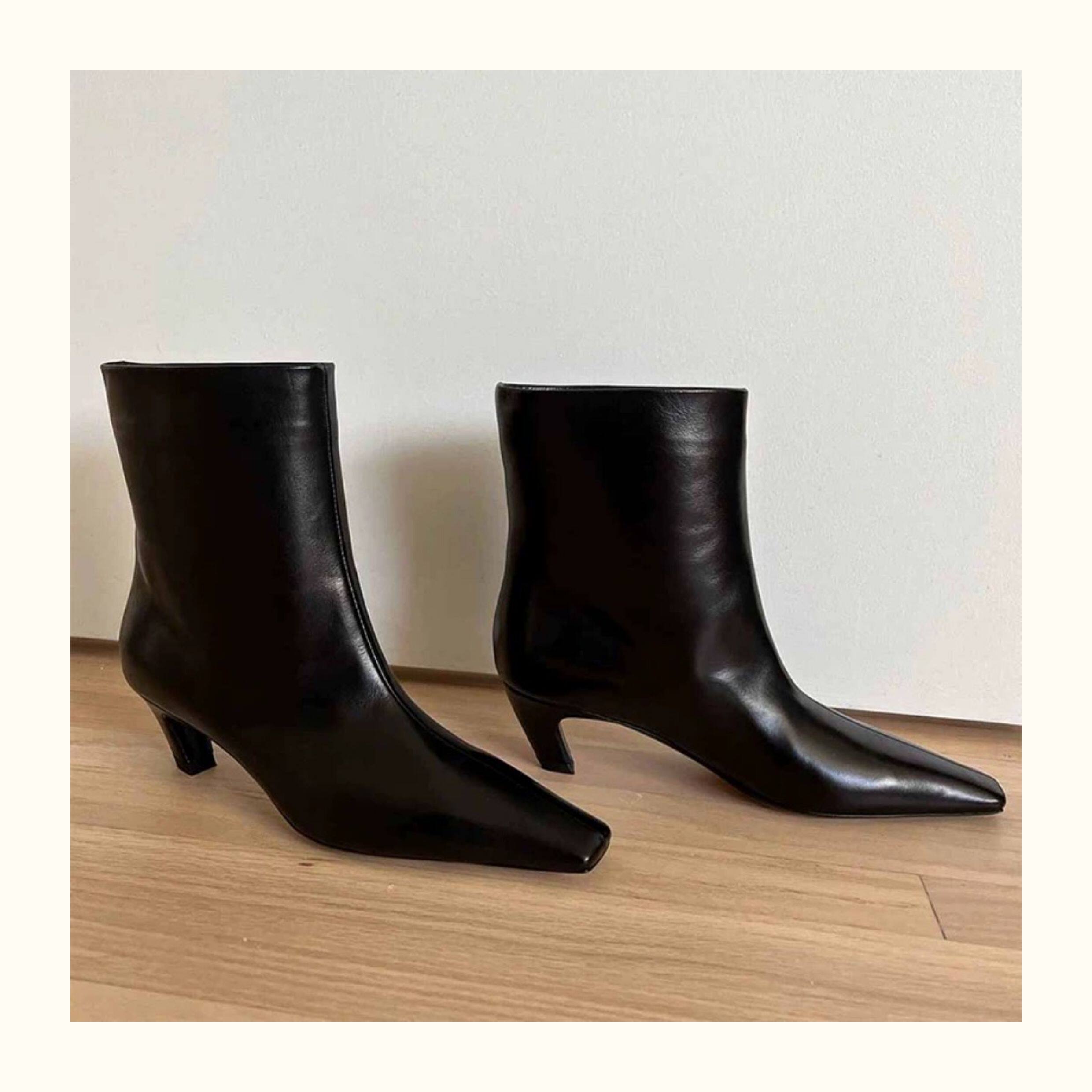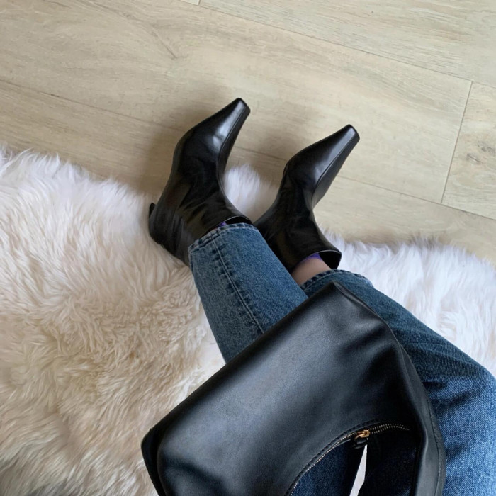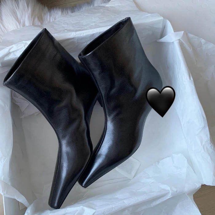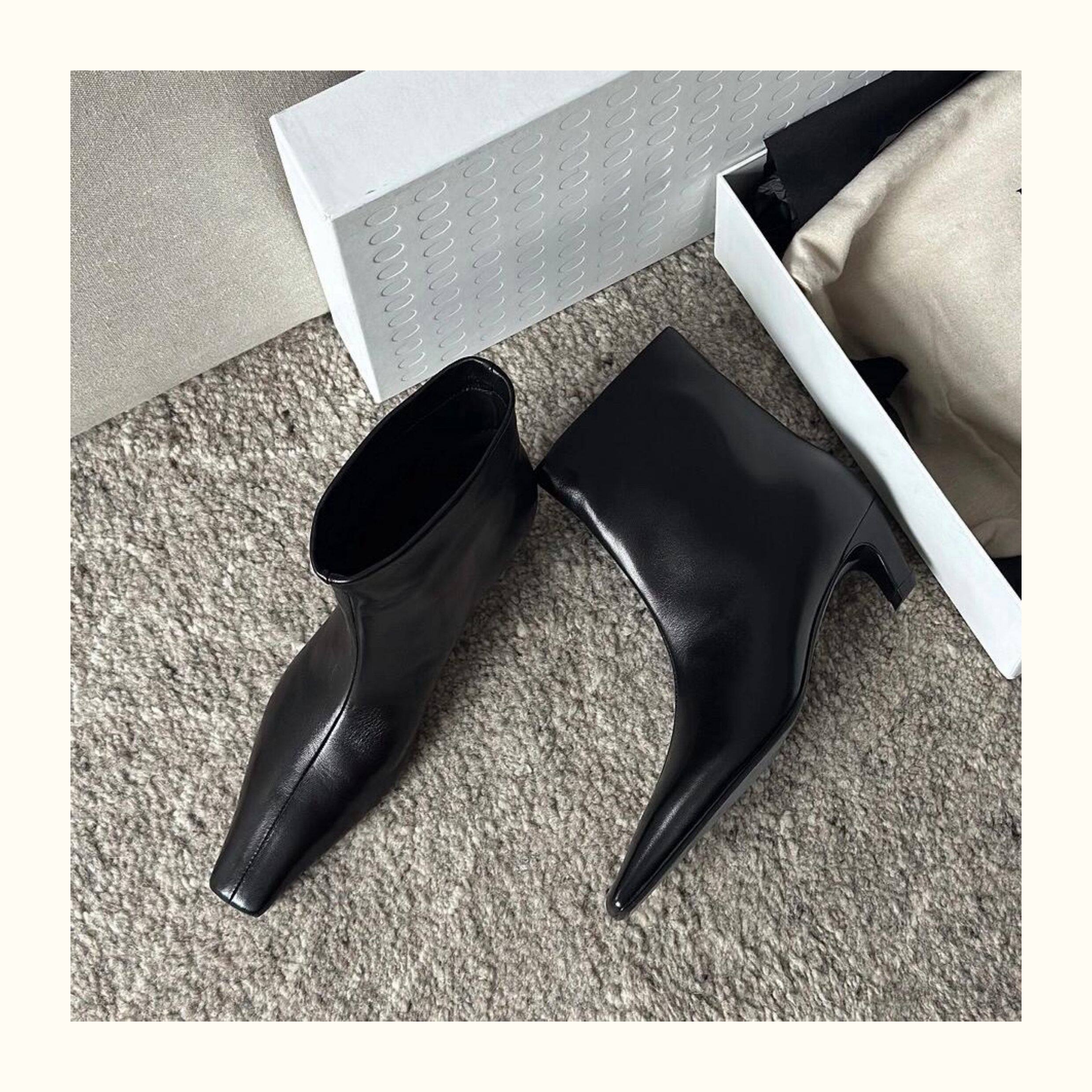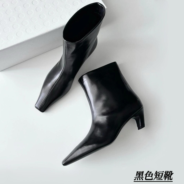 牛皮~氣質小方頭套腳貓跟短靴真皮秋冬新款百搭瘦瘦靴高跟中筒靴