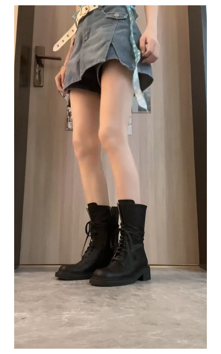 牛皮版~2026新款英倫風馬丁靴女粗跟短靴系帶機車靴子中筒騎士靴