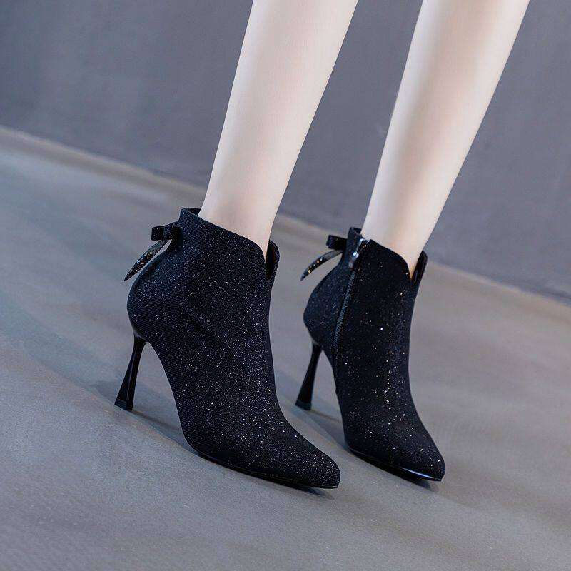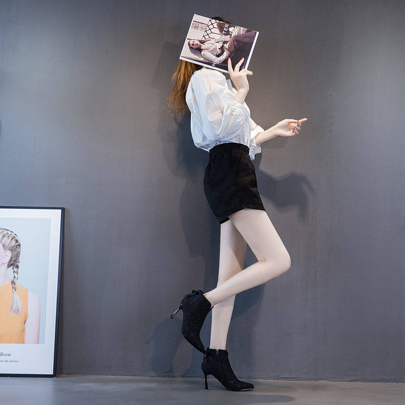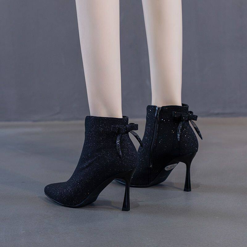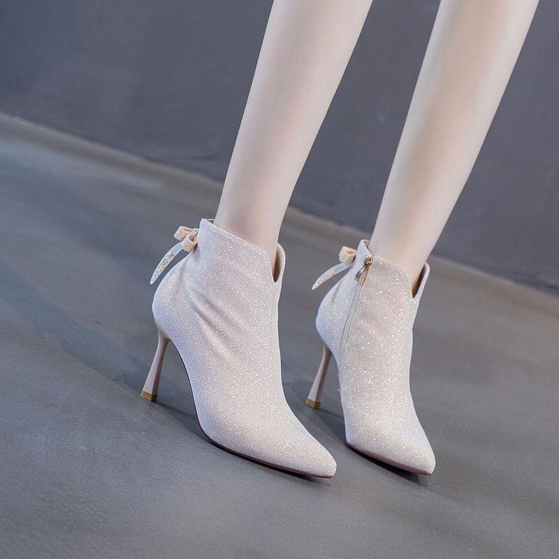 2026年秋冬新款蝴蝶結米色短靴女細跟尖頭高跟馬丁靴百搭踝靴裸靴