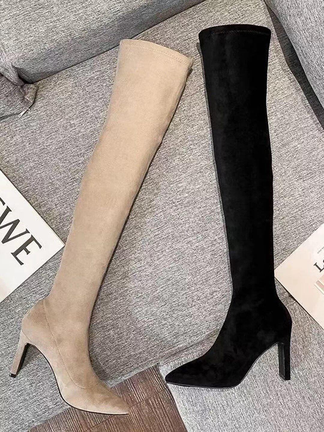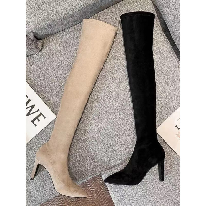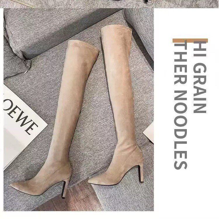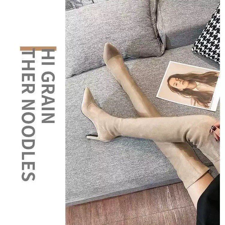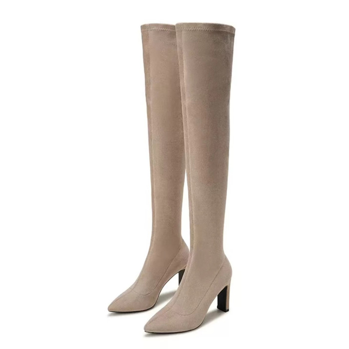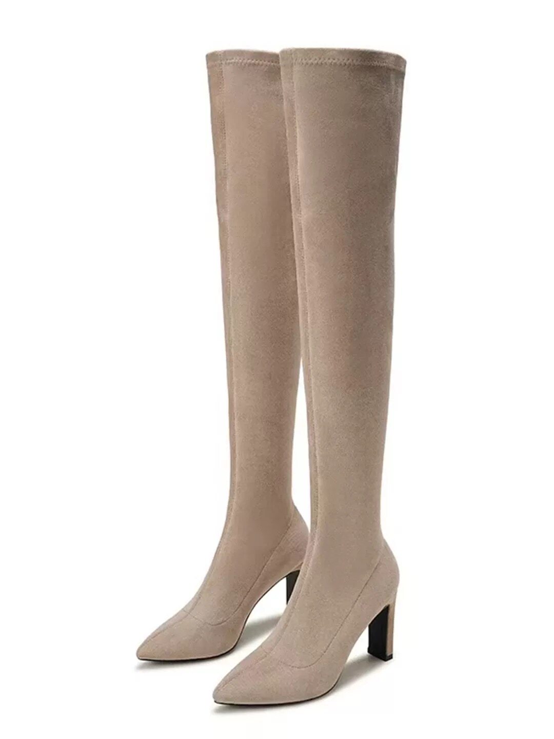 尖頭杏色絨面高跟長靴女2025秋冬季新款彈力瘦瘦靴粗跟過膝高筒靴