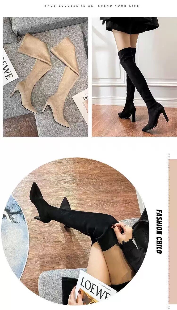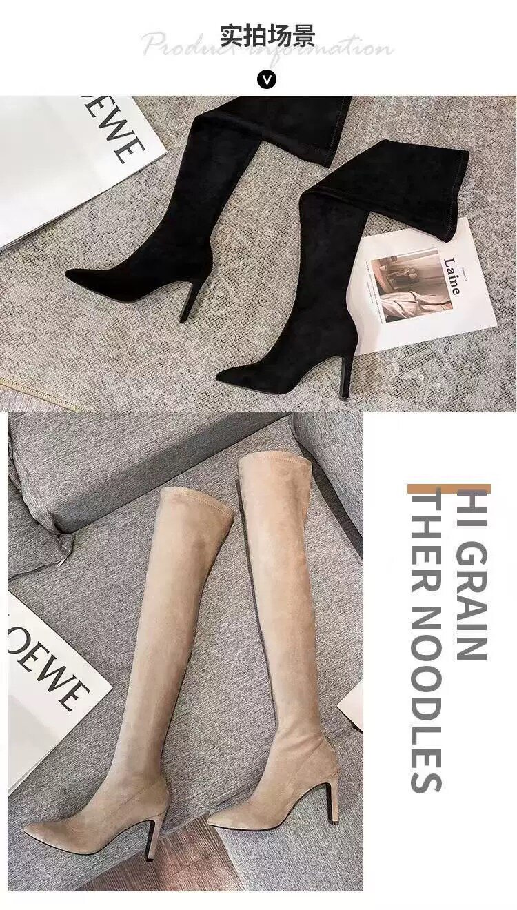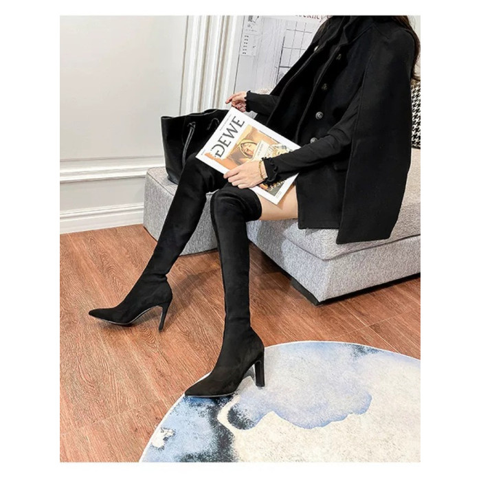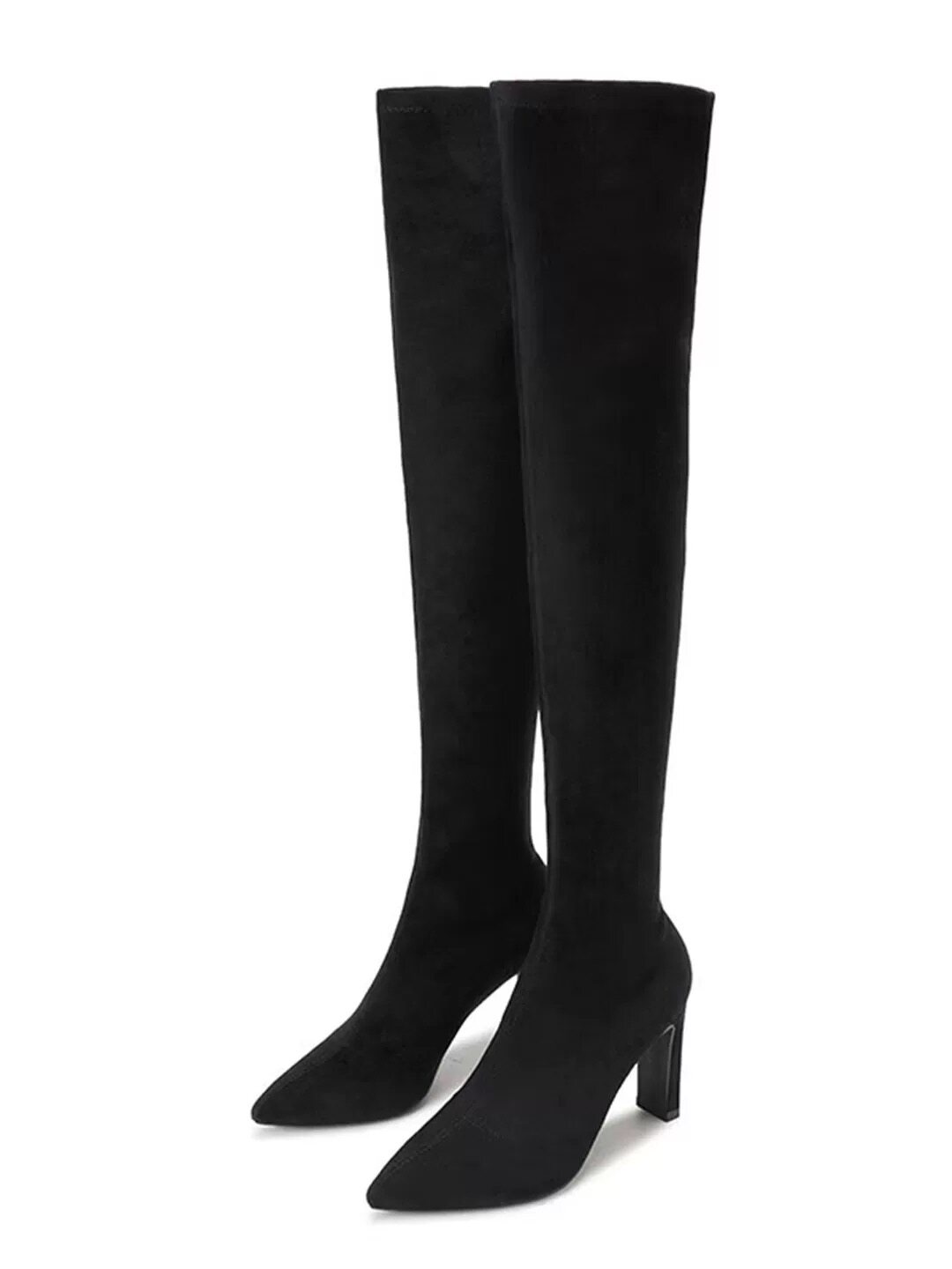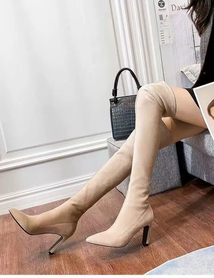 尖頭杏色絨面高跟長靴女2025秋冬季新款彈力瘦瘦靴粗跟過膝高筒靴